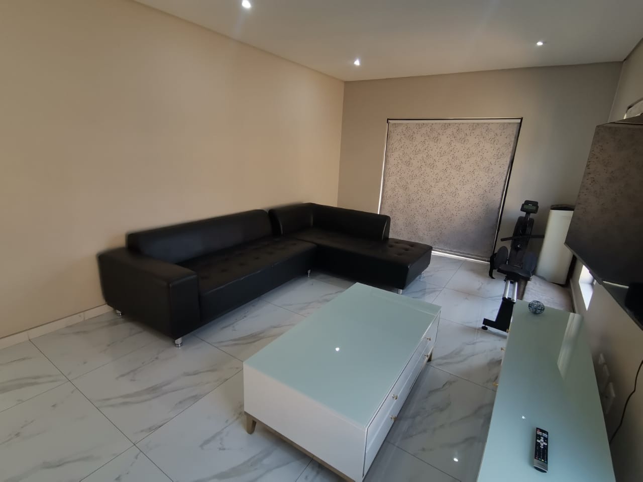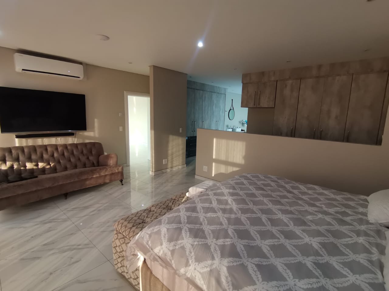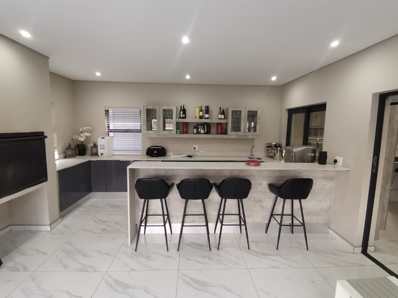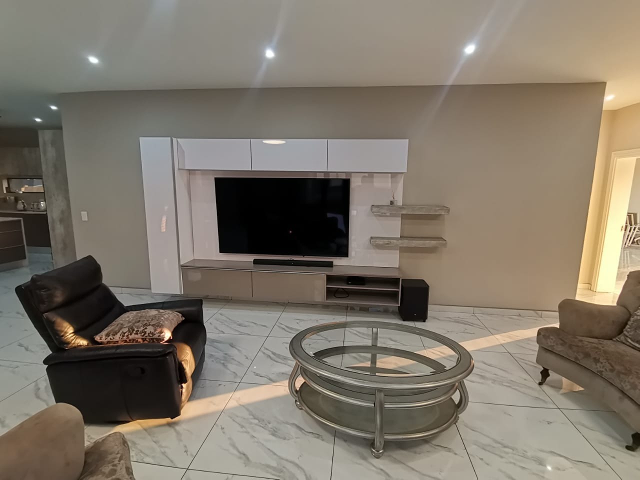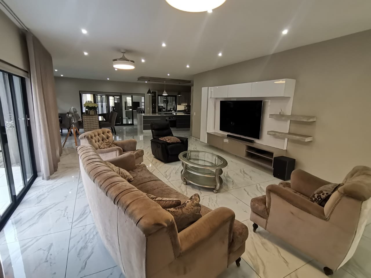 Generous dining room; main lounge with custom built-in TV unit; dedicated TV lounge; expansive entertainment area with stackable doors that seamlessly open to the pool, complete with a built-in braai and bar.