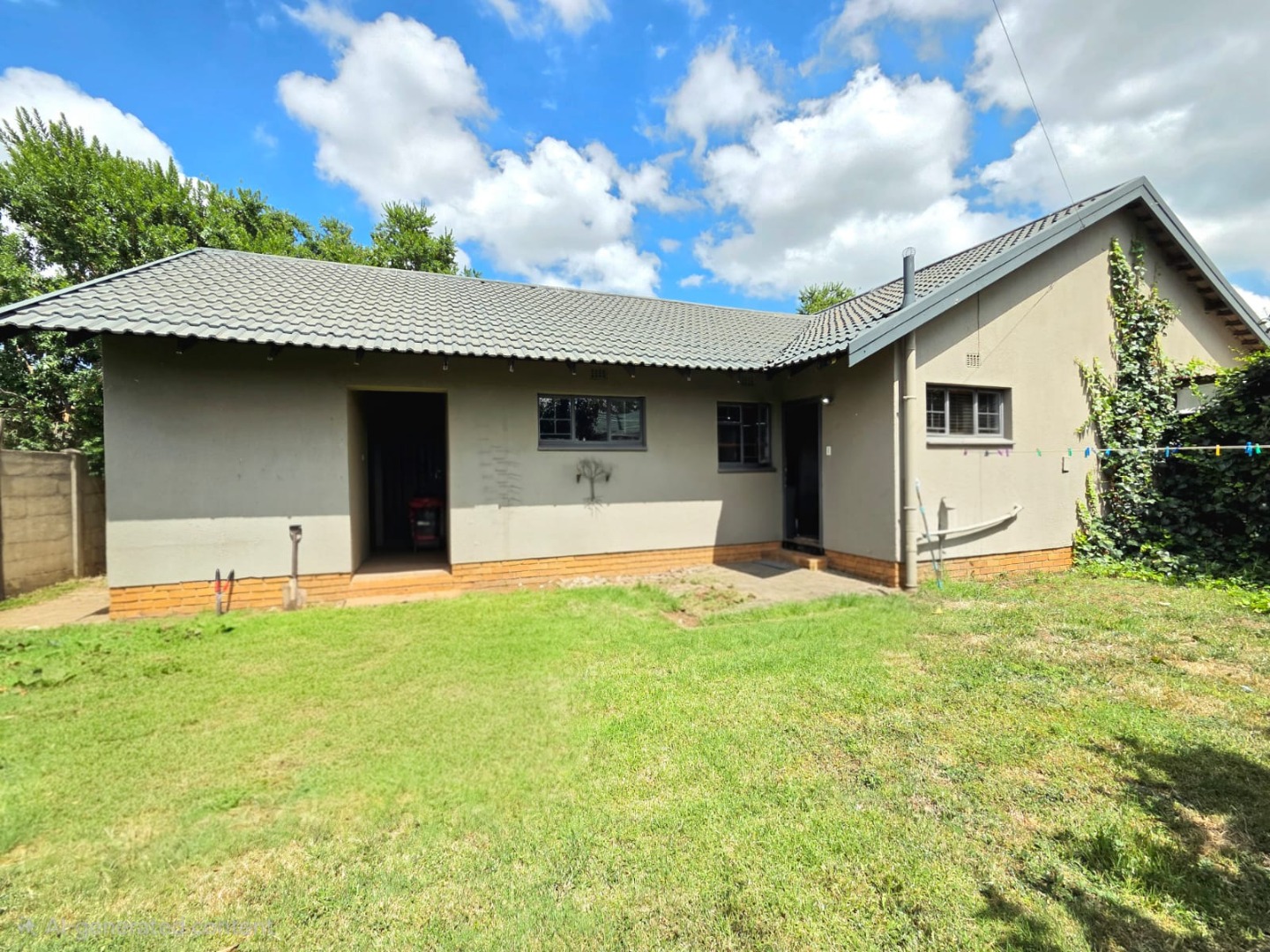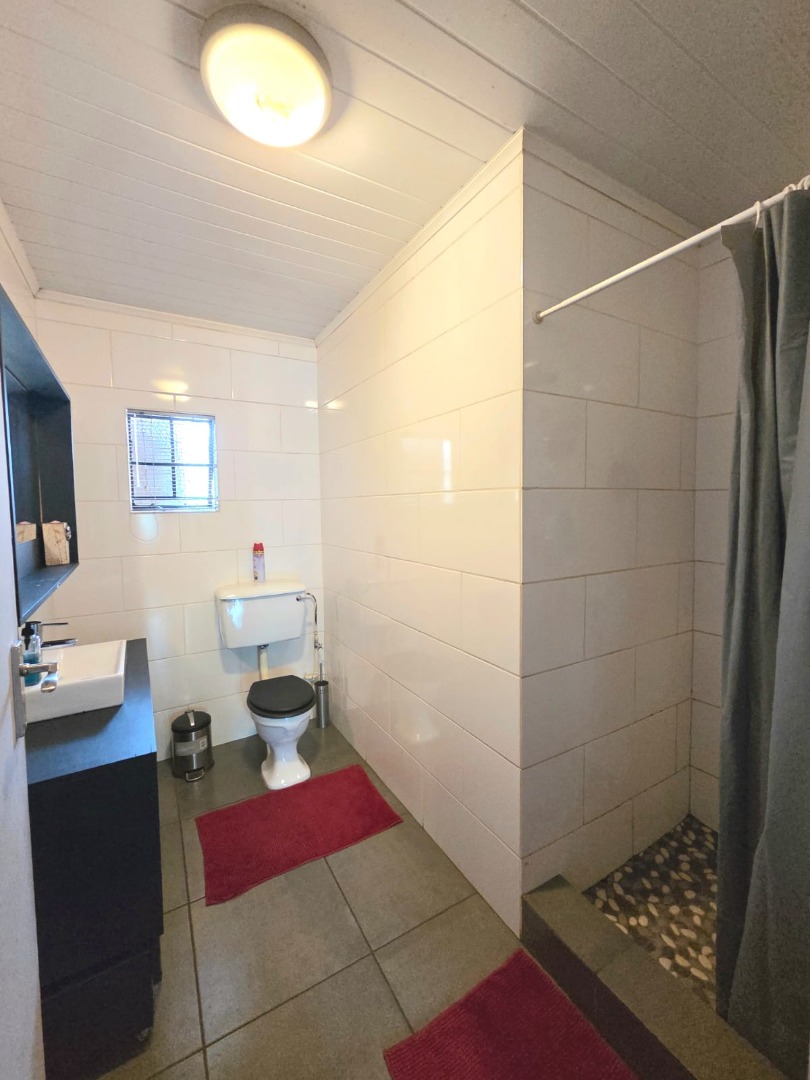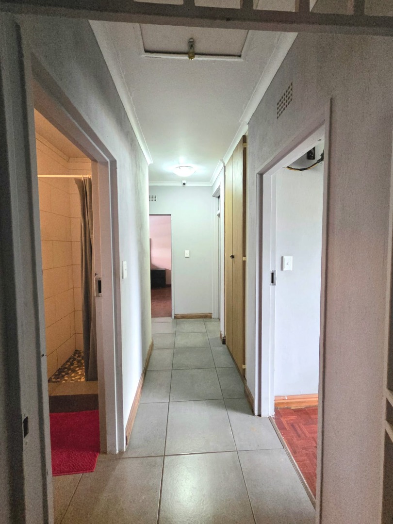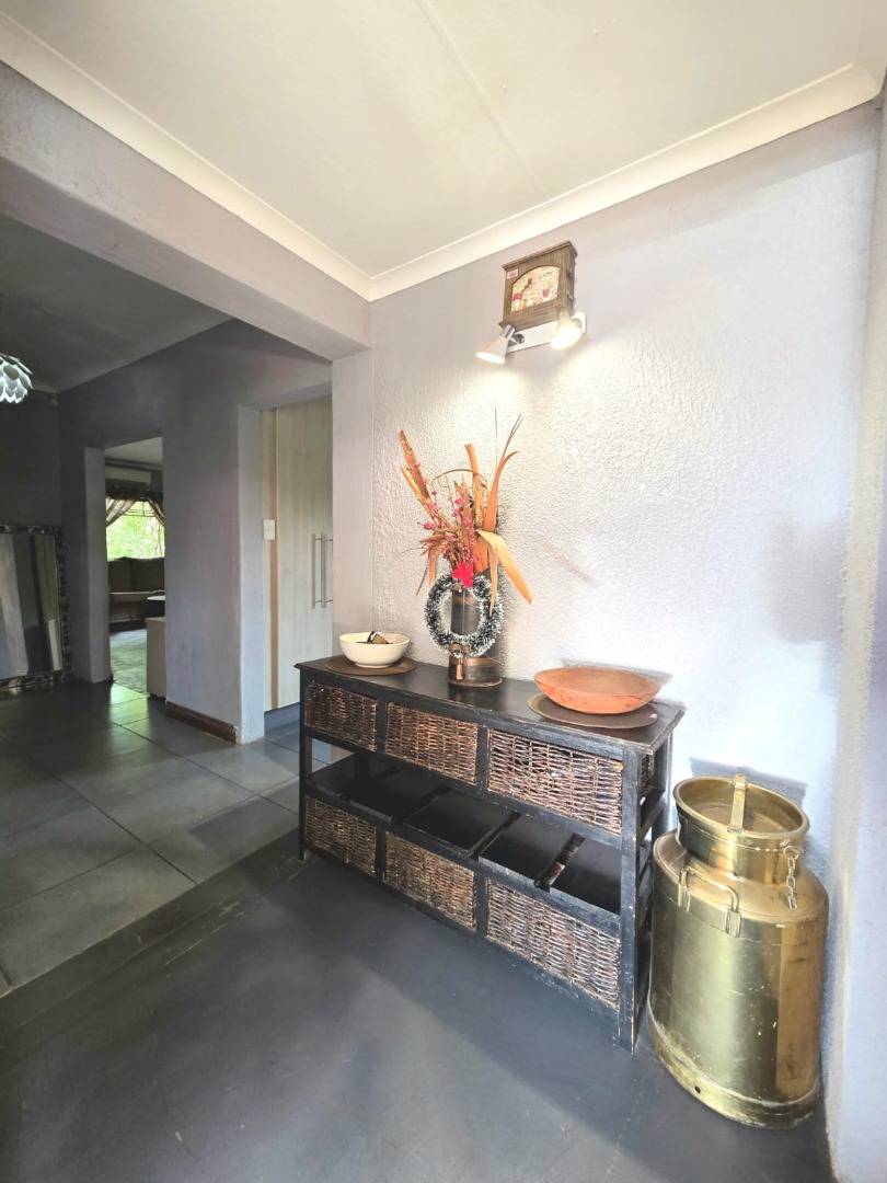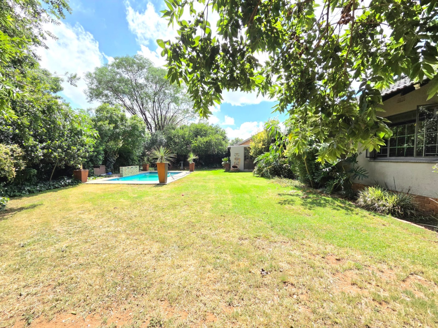 Step outside to a generous 871 sqm erf, where a private swimming pool awaits, surrounded by a large lawn and mature trees that provide shade and privacy. The outdoor area includes a patio and deck, perfect for relaxation, and a built-in braai for outdoor entertaining. Practical additions include staff quarters and outside toilets. The property is totally walled, enhancing privacy and security.