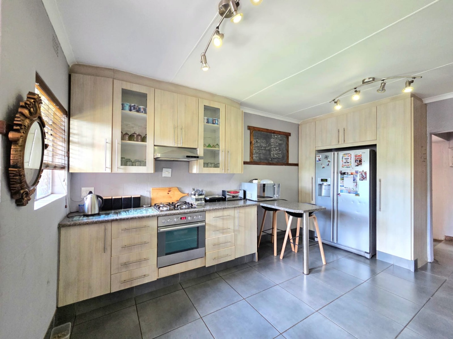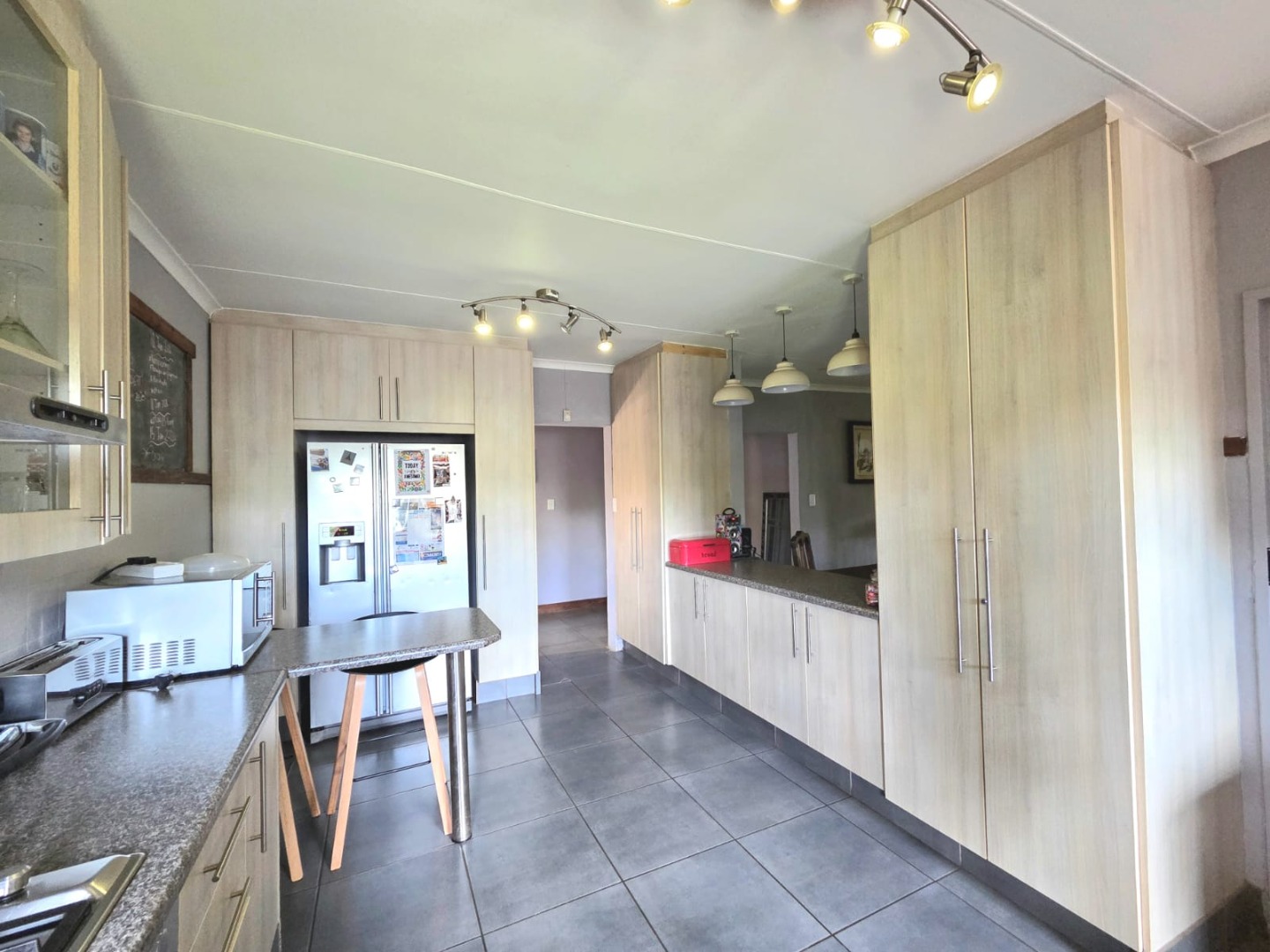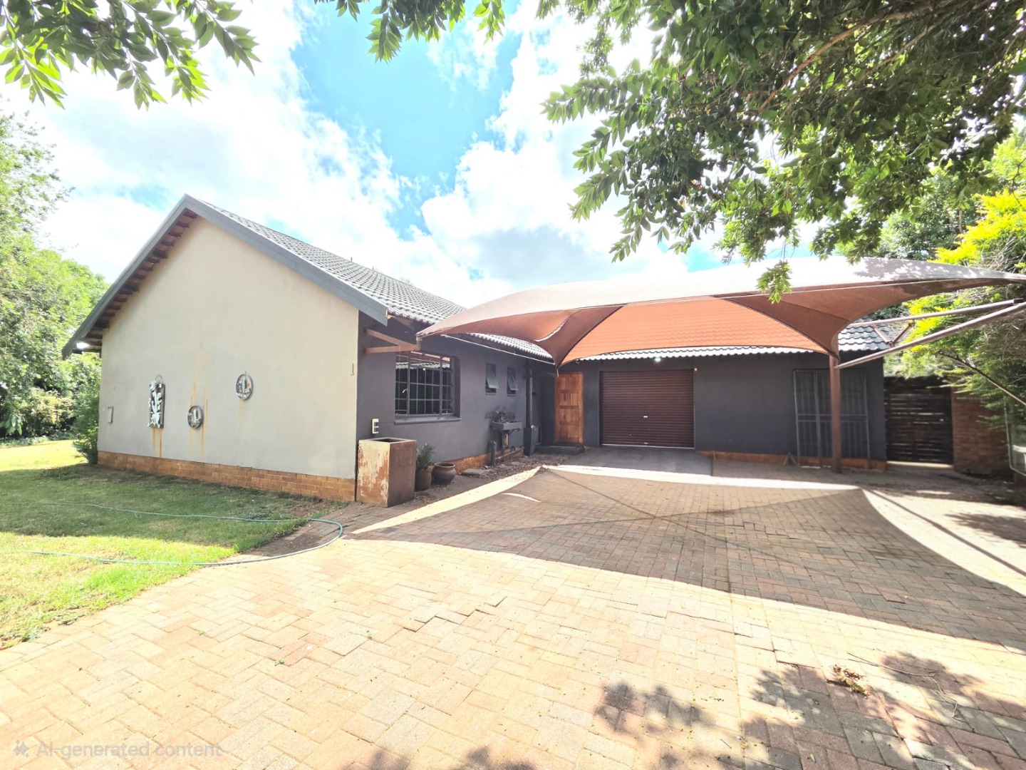Step outside to a generous 871 sqm erf, where a private swimming pool awaits, surrounded by a large lawn and mature trees that provide shade and privacy. The outdoor area includes a patio and deck, perfect for relaxation, and a built-in braai for outdoor entertaining. Practical additions include staff quarters and outside toilets. The property is totally walled, enhancing privacy and security.