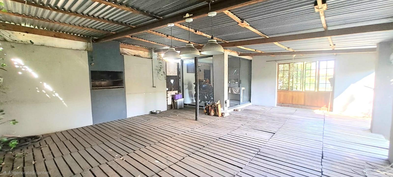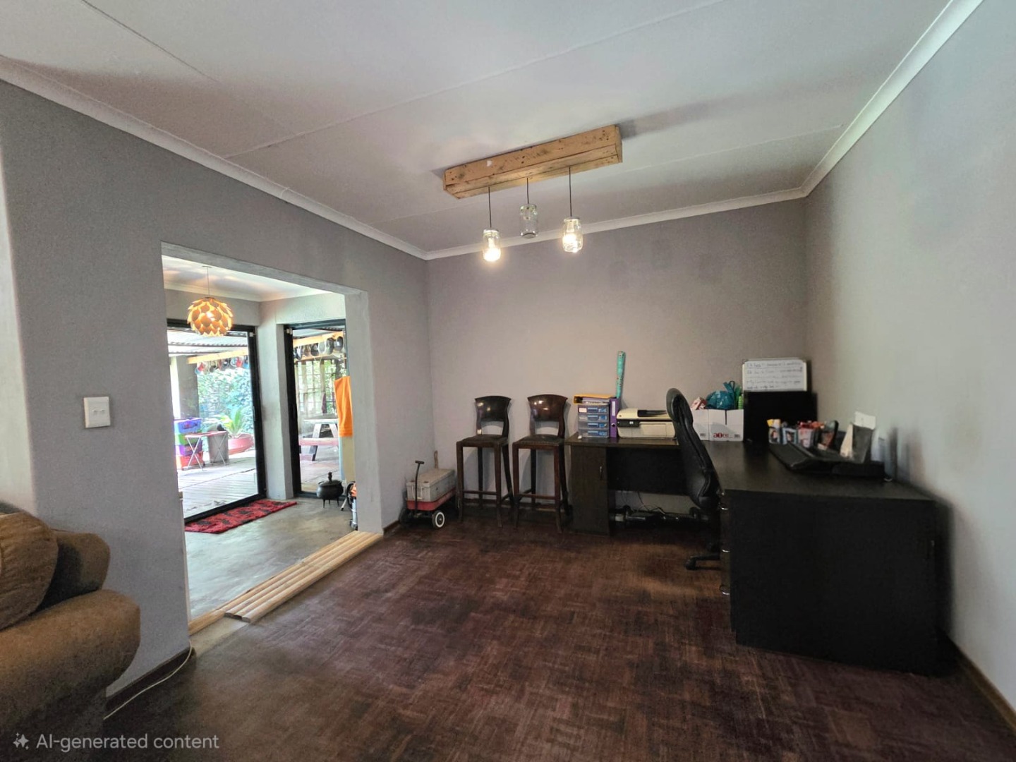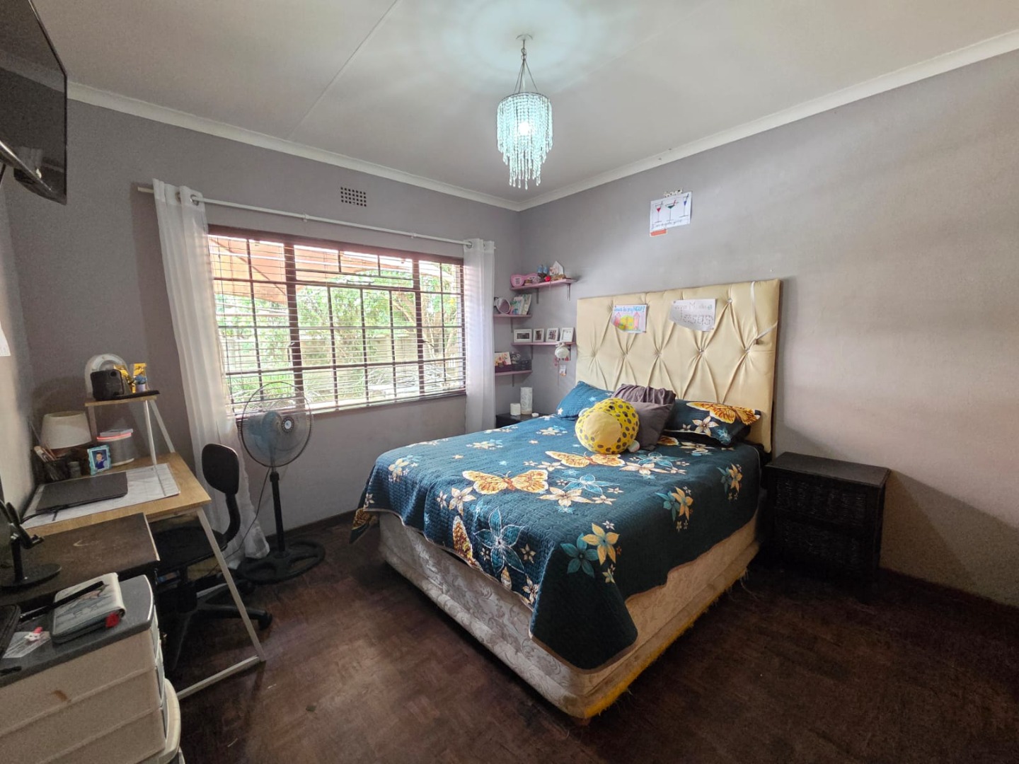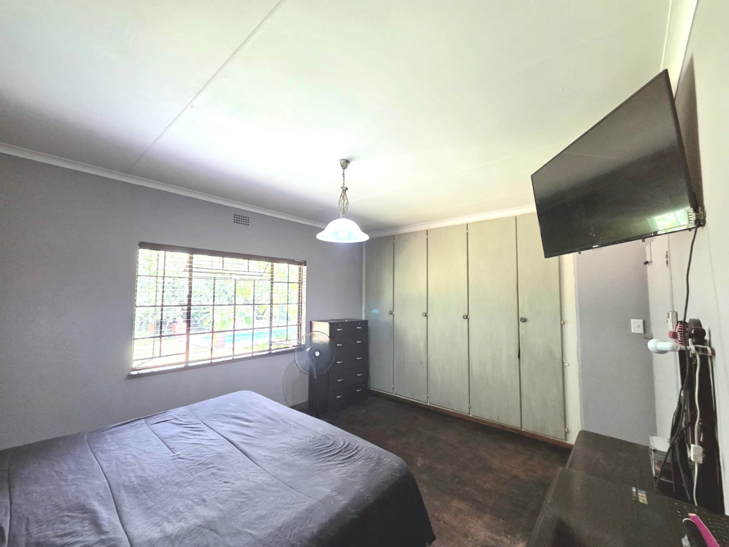 Step outside to a generous 871 sqm erf, where a private swimming pool awaits, surrounded by a large lawn and mature trees that provide shade and privacy. The outdoor area includes a patio and deck, perfect for relaxation, and a built-in braai for outdoor entertaining. Practical additions include staff quarters and outside toilets. The property is totally walled, enhancing privacy and security.