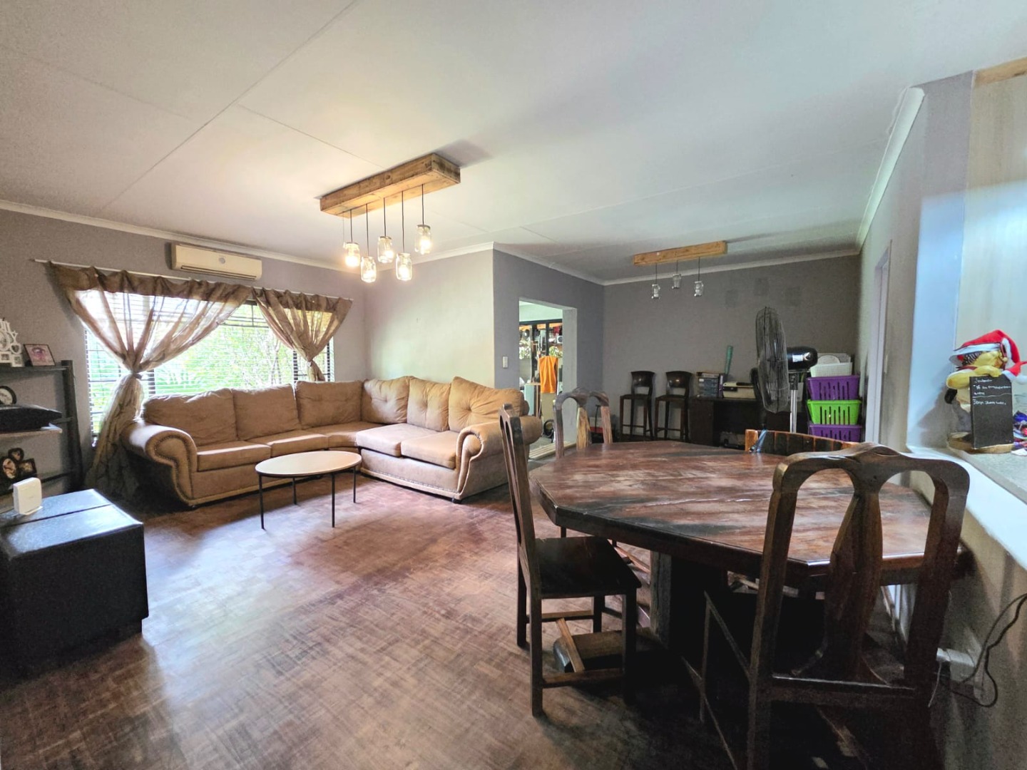 The interior features a functional layout designed for comfortable living. The kitchen boasts modern light wood-look cabinetry, integrated oven and hob, and a convenient bar-style island, ideal for casual dining. This space flows seamlessly into the designated lounge and dining areas, creating an open-plan environment perfect for family interaction and entertaining. Air conditioning ensures comfort throughout the year.