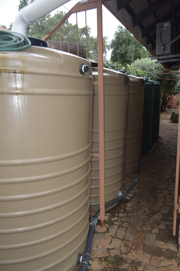 Eco-Friendly Water Solutions — 5 JoJo tanks with a total capacity of 12,000 litres, harvesting rainwater from the roof