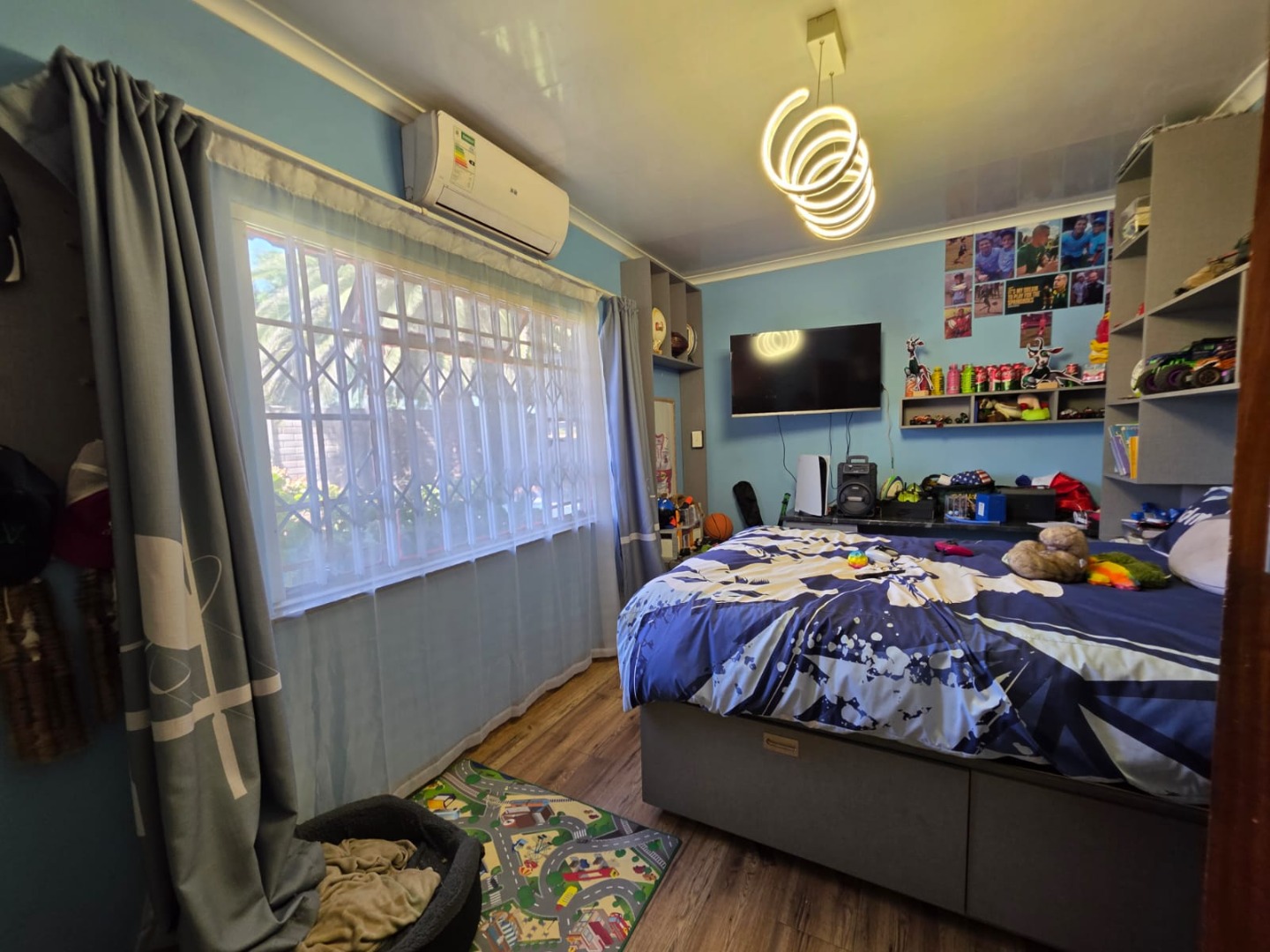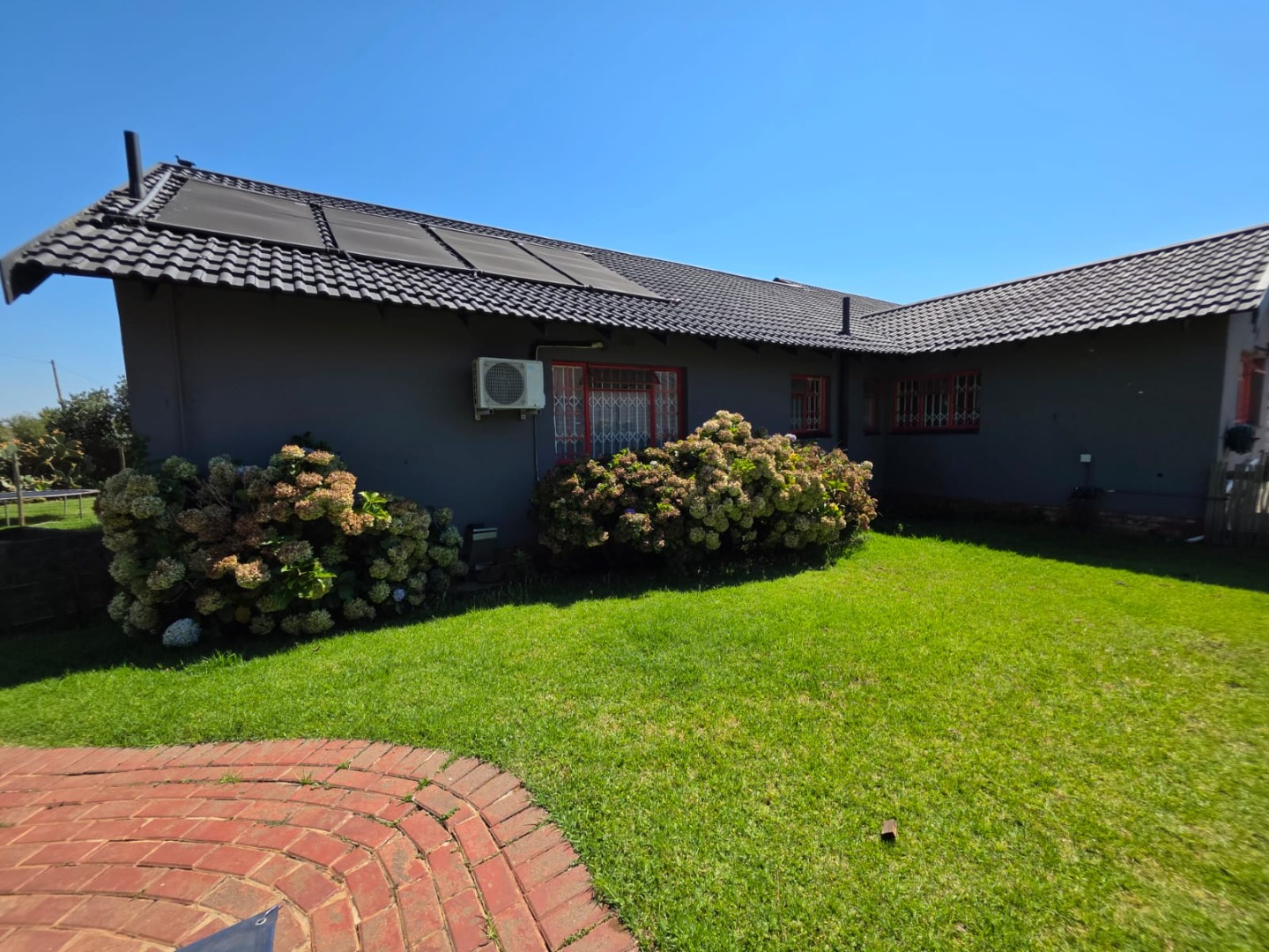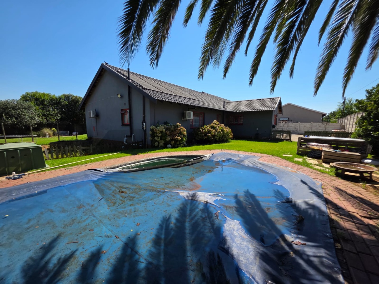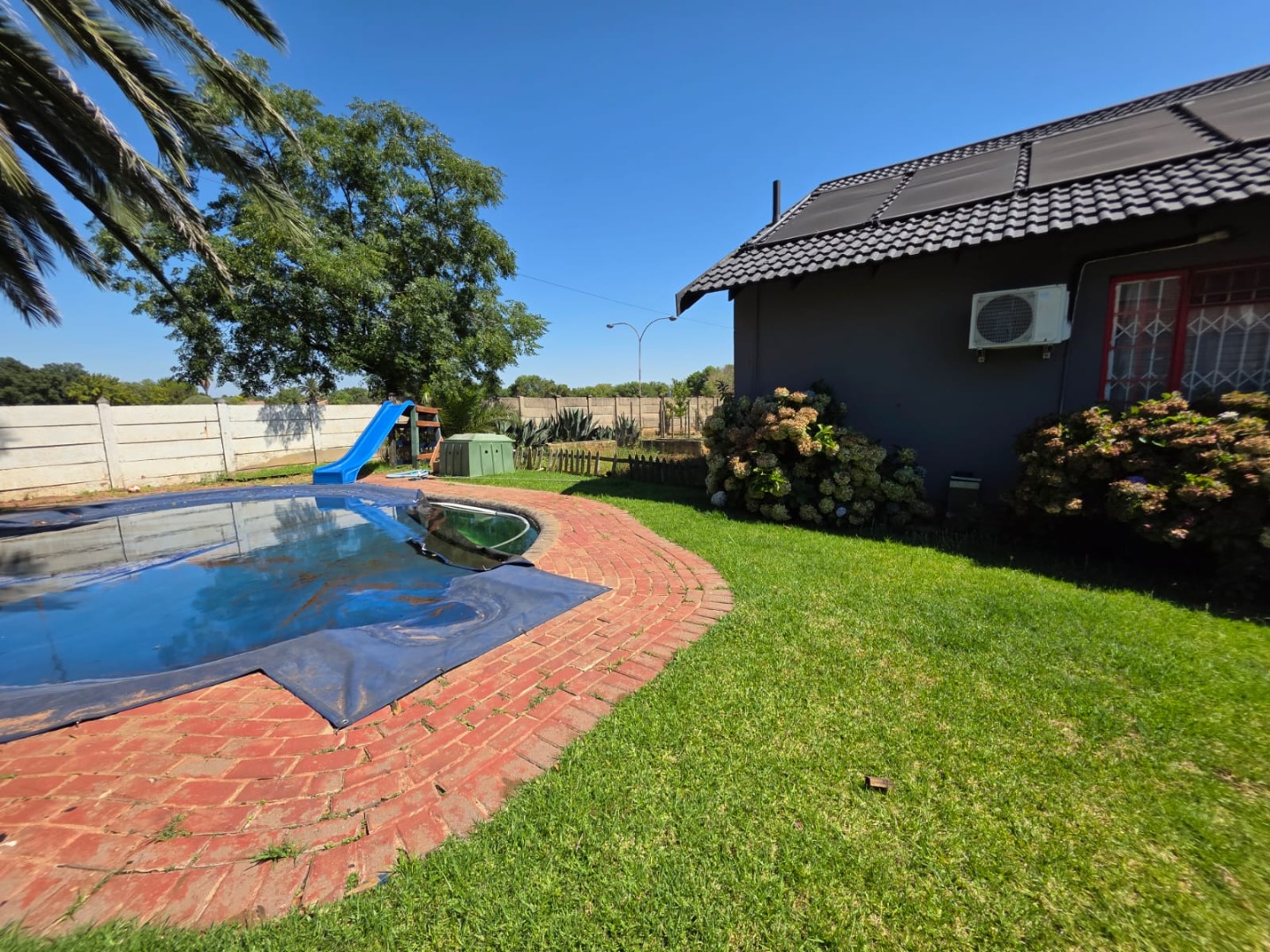 Set on a generous 1188 sqm erf, the property truly shines outdoors. A private swimming pool, currently covered, is surrounded by brick paving, creating an ideal space for leisure. The well-maintained green lawn and mature trees provide a serene backdrop, while a red brick paved area adds to the kerb appeal. For enhanced sustainability, the home is fitted with solar panels on the roof. Domestic rooms and outside toilets cater to practical needs.