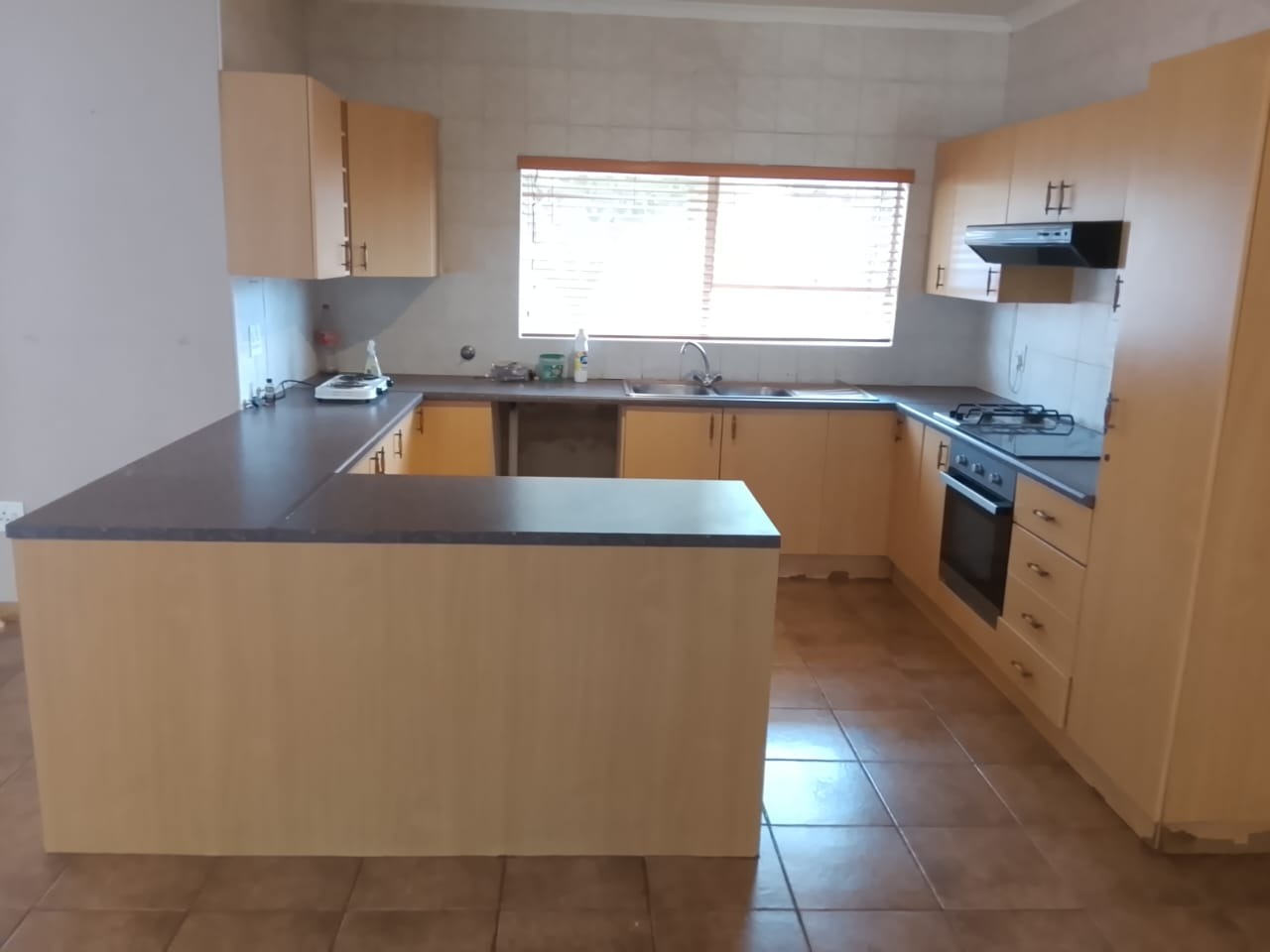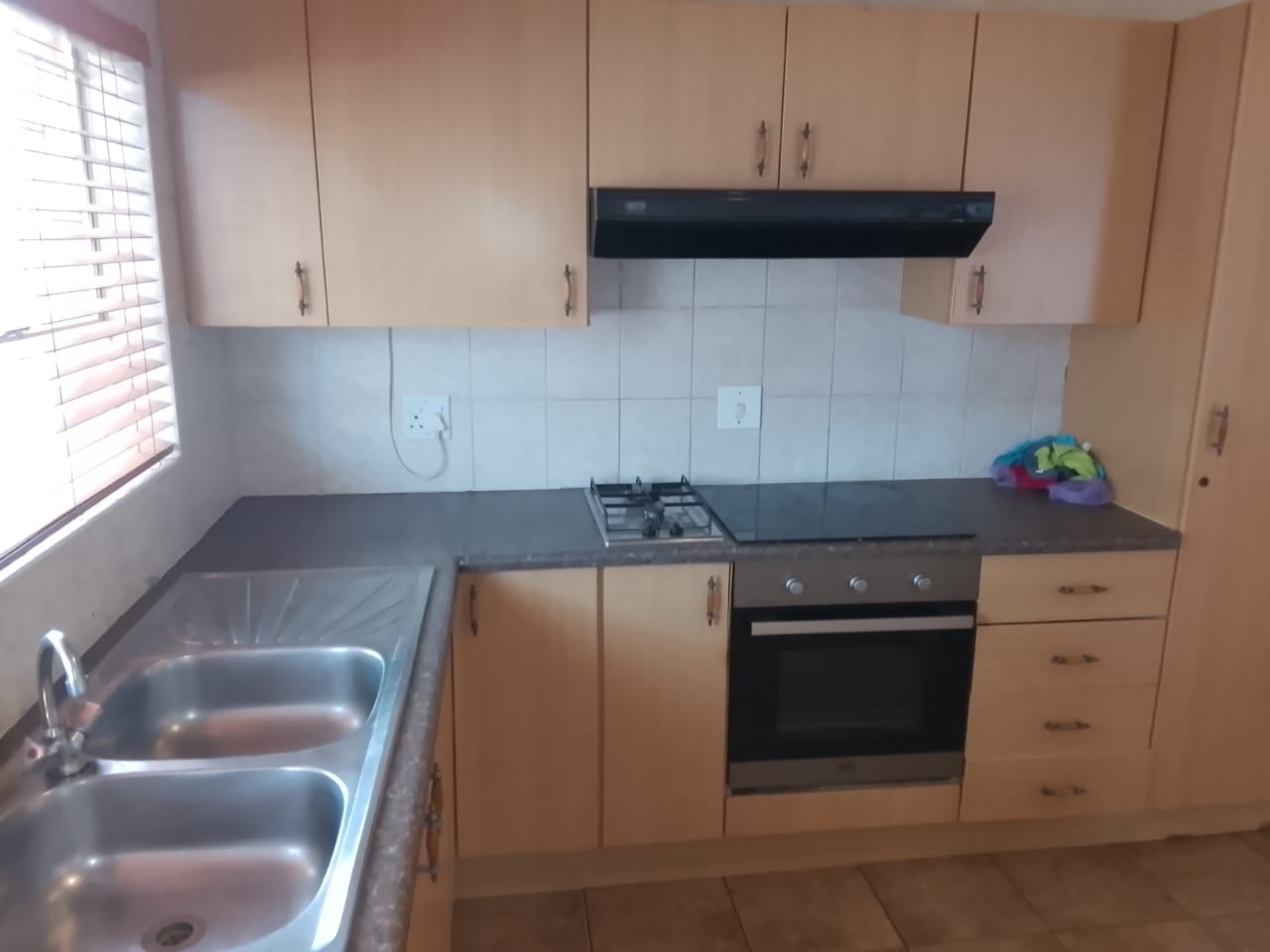 The kitchen is well equipped with ample built-in cupboards, a stove (hob), and an extractor fan, offering both functionality and convenience.