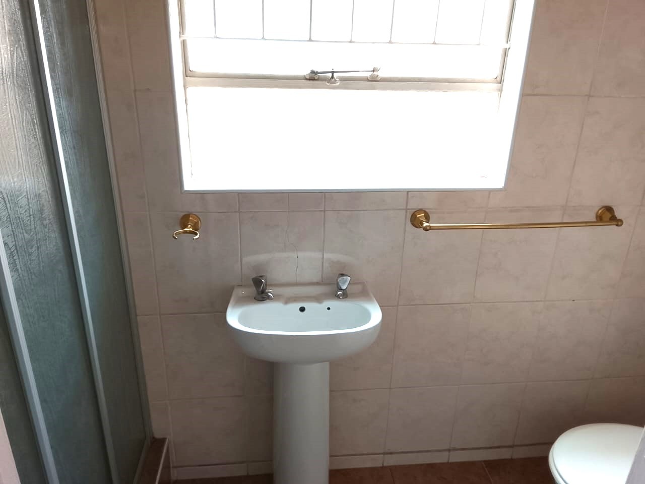 The home features three well-sized bedrooms, two of which include built-in cupboards. The master bedroom boasts a fully tiled en-suite bathroom complete with a bath, shower, hand basin, and toilet. A second tiled bathroom, fitted with a shower, hand basin, and toilet, services the remaining two bedrooms.