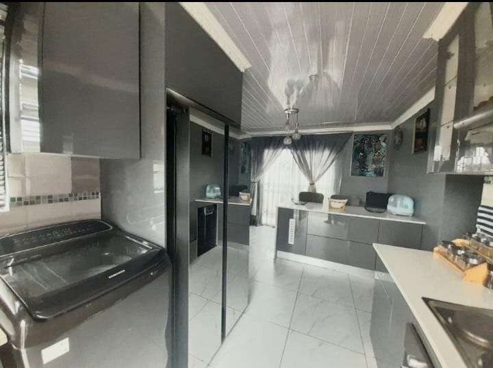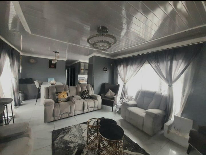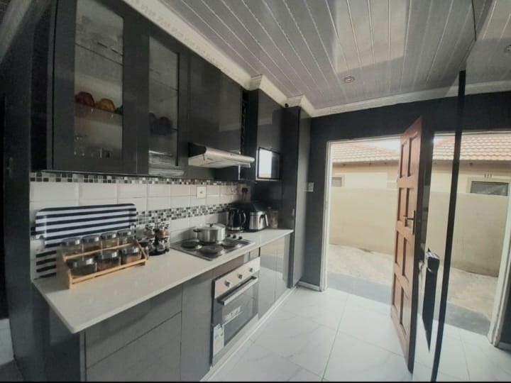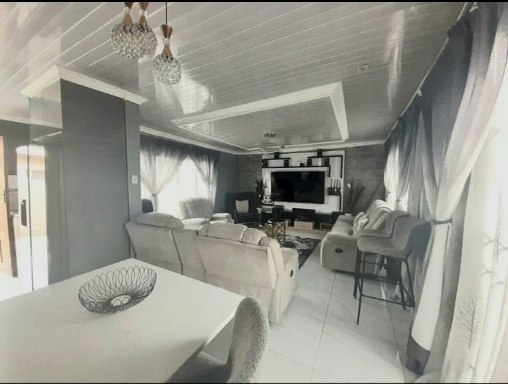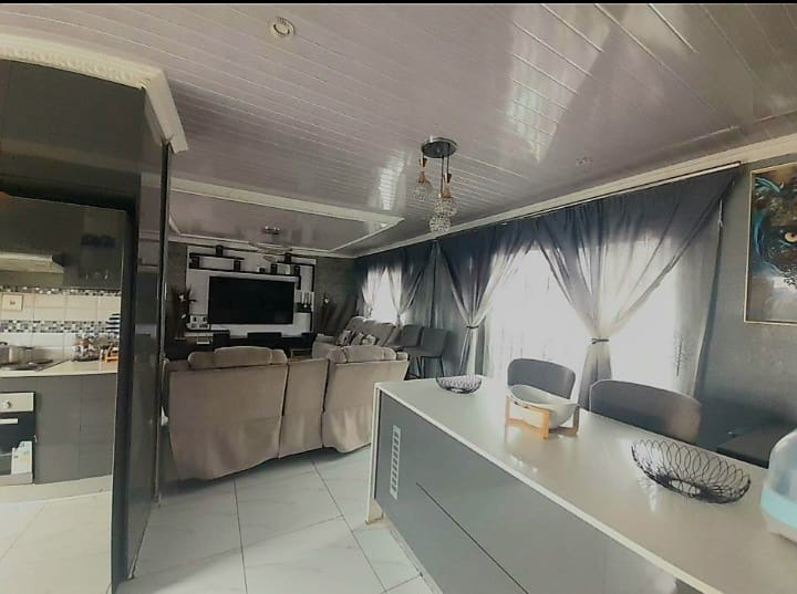 This modern 3-bedroom, 2-bathroom residence is nestled within a secure estate in Vanderbijlpark CE 3, offering a contemporary lifestyle. The interior boasts an inviting open-plan layout, seamlessly connecting the dining and lounge area. Throughout these spaces, sleek tiled flooring and contemporary paneled ceilings with stylish lighting create a cohesive and bright atmosphere, enhanced by ample natural light from large windows. The design features a sophisticated grey color palette, providing a versatile backdrop for personal touches.