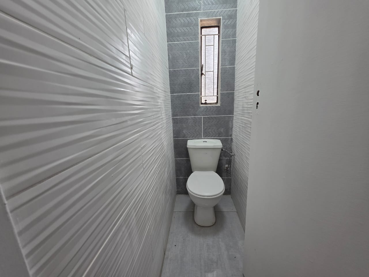 The residence comprises three well-proportioned bedrooms, each fitted with built-in wardrobes for practical storage solutions and finished with light-coloured tiled flooring. The property includes 1.5 bathrooms; a main bathroom featuring modern grey tiling on both walls and floor, complete with a bathtub, toilet, and pedestal sink, and a separate guest toilet with contemporary tiling. Natural light floods the rooms through large windows, many of which are fitted with security bars for enhanced peace of mind.