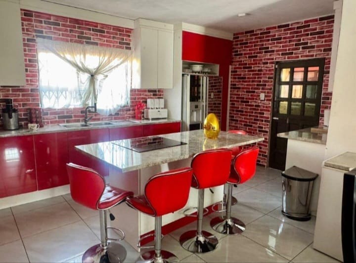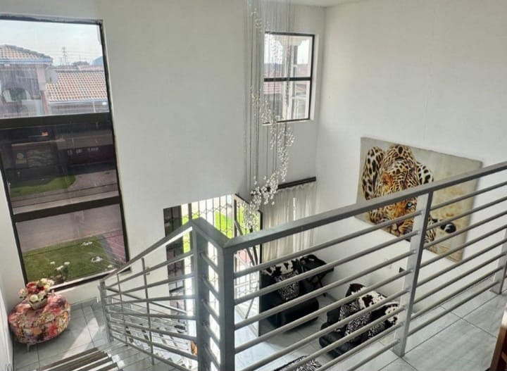 This distinguished two-story residence in Vanderbijlpark CE7, Vanderbijlpark, South Africa, presents a sophisticated modern aesthetic. The exterior features a pristine white facade complemented by a terracotta roof, classical-style columns, and a contemporary balcony with a glass railing. An integrated reflective garage and a neatly paved driveway enhance the property's kerb appeal, alongside a well-maintained garden and secure gated entrance. Upon entering, the interior reveals high ceilings and expansive windows that invite abundant natural light, creating an airy and spacious ambiance. The design is accentuated by a striking chandelier and a contemporary metal staircase railing, contributing to a refined living experience. The residence offers two formal lounges, two dedicated dining areas, and an additional family TV room, providing versatile spaces for both relaxation and entertaining. The gourmet kitchen is a focal point, boasting vibrant glossy red cabinetry and distinctive brick-patterned feature walls. It is equipped with a large central island, integrated hob, ample granite-style counter space, and an integrated refrigerator, catering to culinary enthusiasts. The property comprises four generously proportioned bedrooms and three well-appointed bathrooms, including two en-suite facilities and a convenient guest toilet. Security is paramount, with visible security bars on windows and a security gate at the entrance, complemented by CCTV surveillance. The property benefits from fibre connectivity, a dedicated laundry area, and additional storage solutions. Pets are permitted, offering flexibility for residents. Key Features: * Modern Two-Story Architecture * Four Bedrooms, Three Bathrooms * Two Lounges, Two Dining Rooms * Vibrant, Modern Kitchen with Island * Integrated Double Garage * Fibre Connectivity * CCTV Surveillance * Paved Driveway and Garden