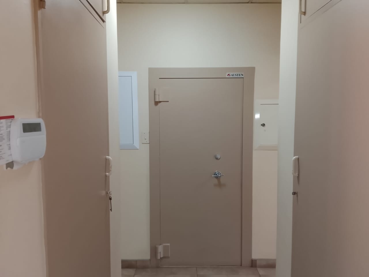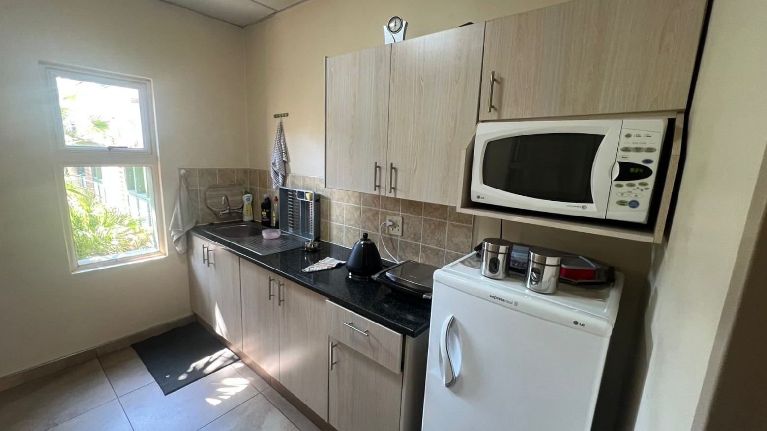 Additional highlights include a walk-in safe with shelving, ideal for secure document storage, and a modern kitchen fitted with built-in cupboards, granite countertops, and space for a microwave and fridge. The kitchen offers direct access to the central courtyard, perfect for staff breaks.