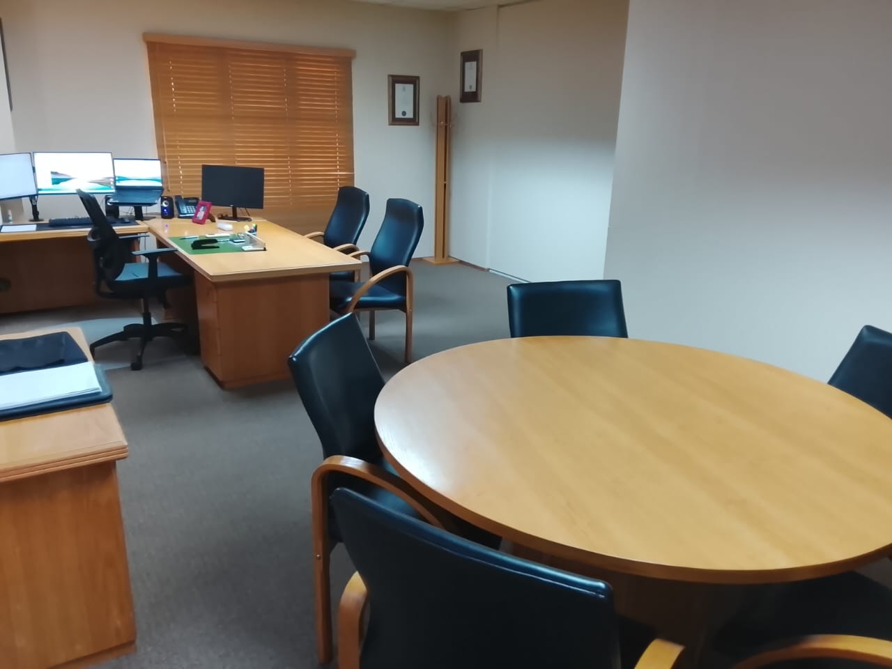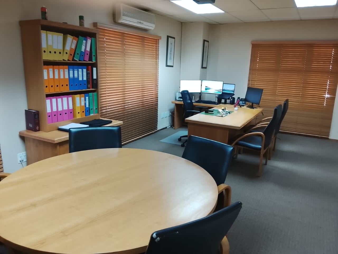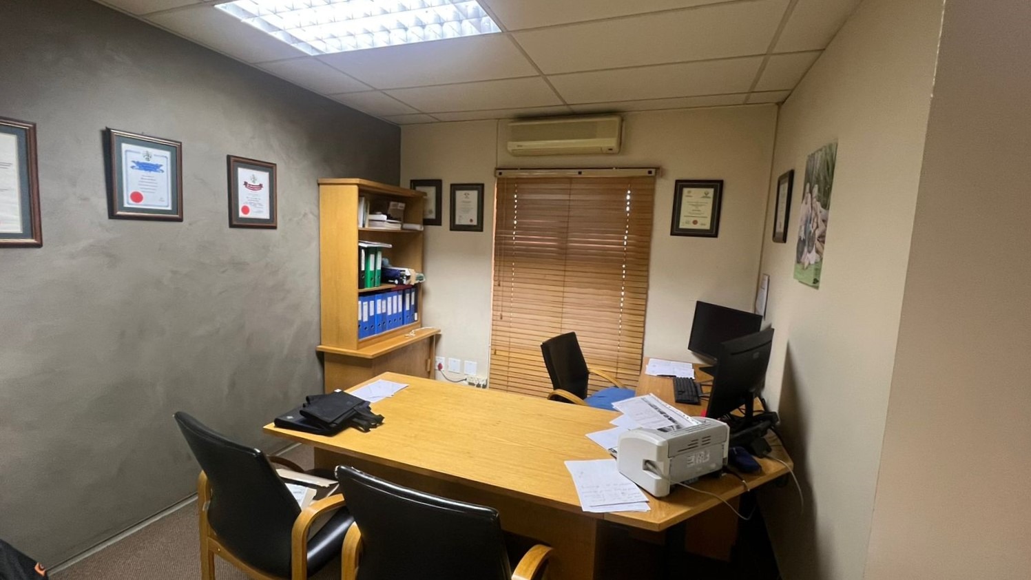 It features four private offices, all equipped with air conditioners. The main office is generously sized and can easily be partitioned to create a fifth office if needed. A large multi-purpose room with a filing cabinet provides versatile space. Two stationery cupboards are conveniently located adjacent to the reception area.
