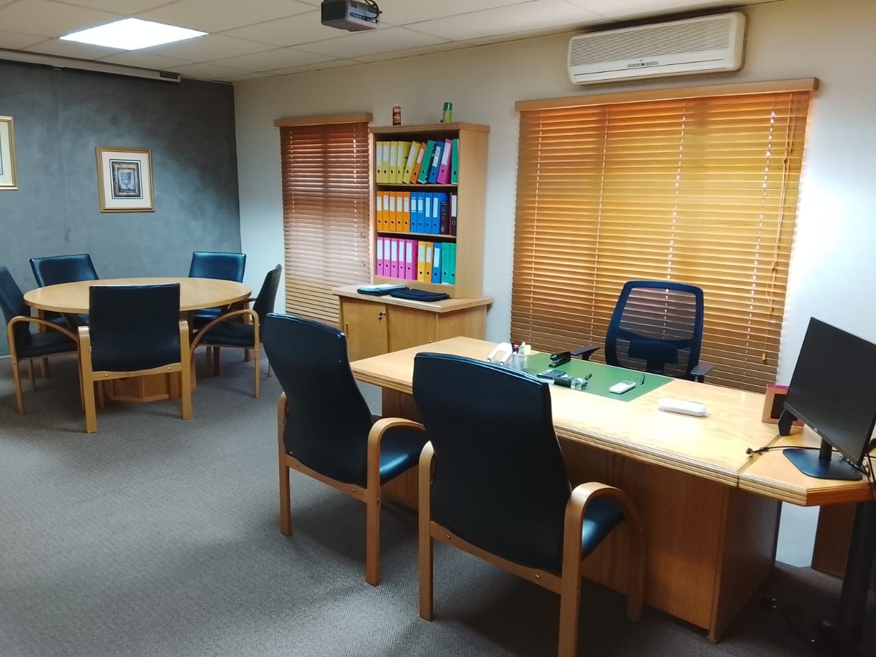 It features four private offices, all equipped with air conditioners. The main office is generously sized and can easily be partitioned to create a fifth office if needed. A large multi-purpose room with a filing cabinet provides versatile space. Two stationery cupboards are conveniently located adjacent to the reception area.