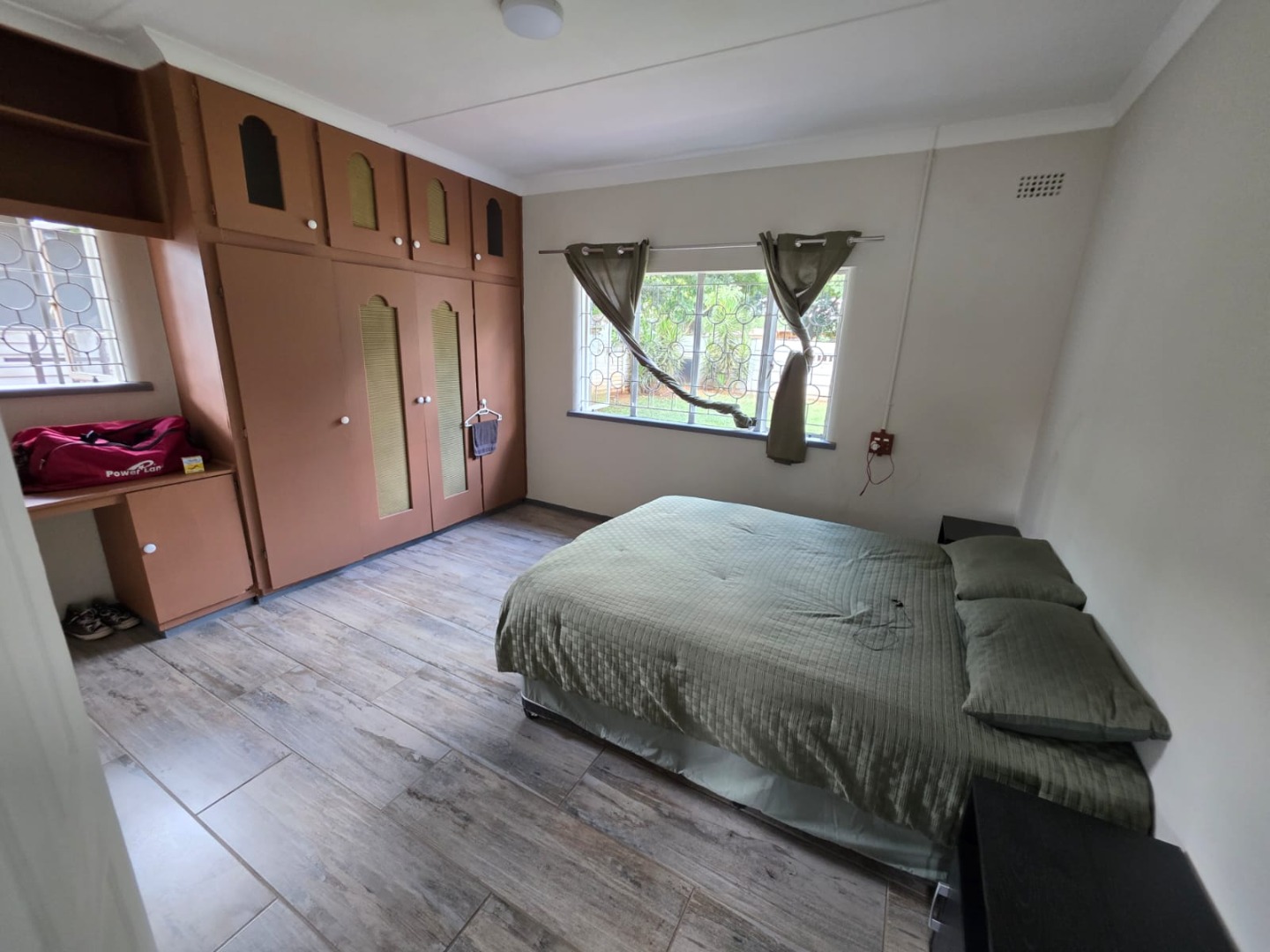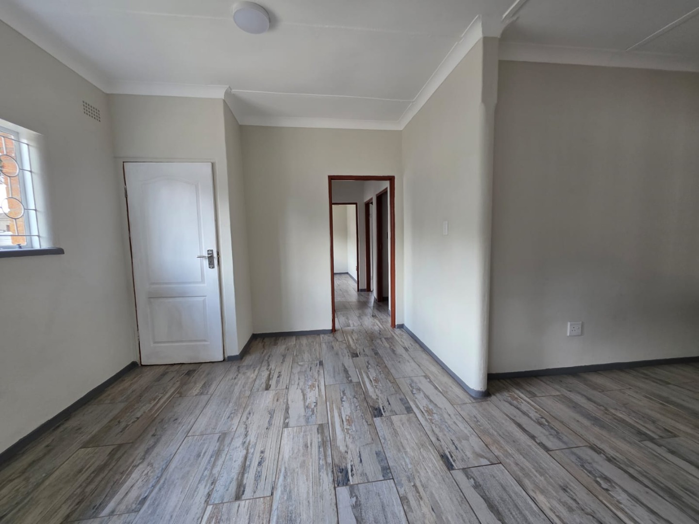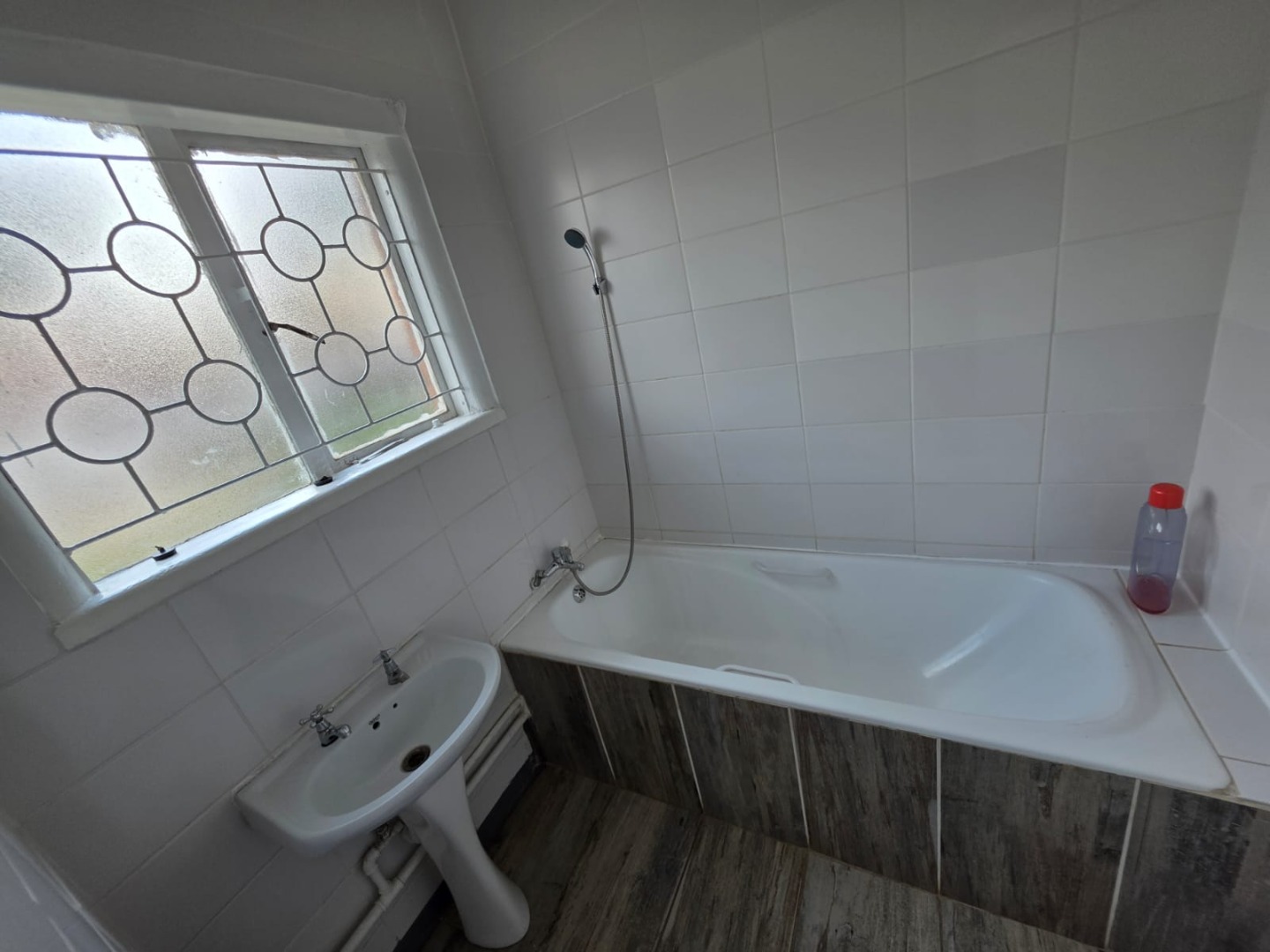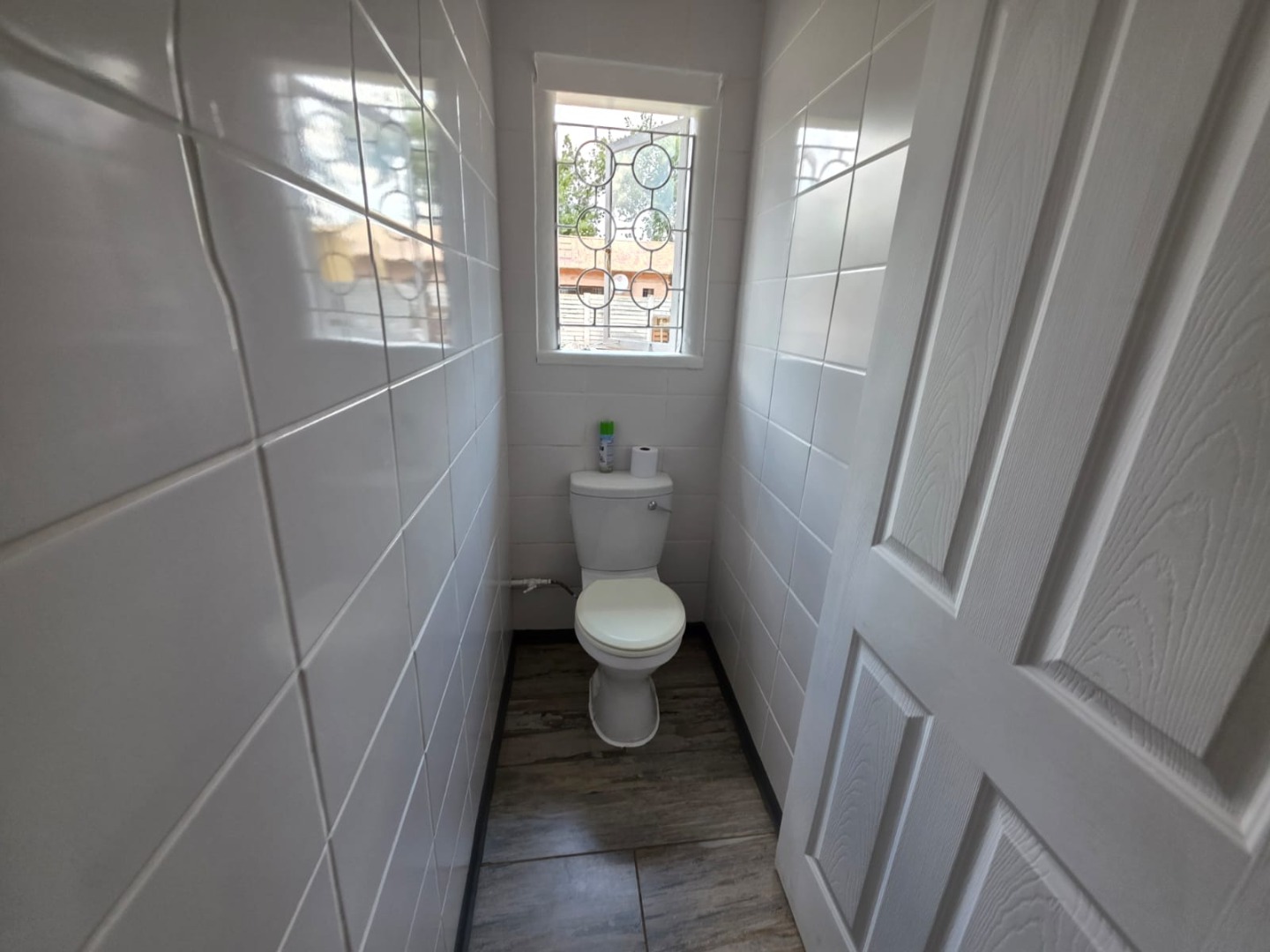 The residence comprises three well-proportioned bedrooms, each offering natural light and the same modern wood-look tiled flooring. One bedroom includes convenient built-in storage, enhancing practicality. The property provides 1.5 bathrooms, including a main bathroom fitted with a bathtub and an overhead shower attachment, complemented by white tiled walls and a decorative frosted window for privacy. A separate toilet room adds to the home's functionality.