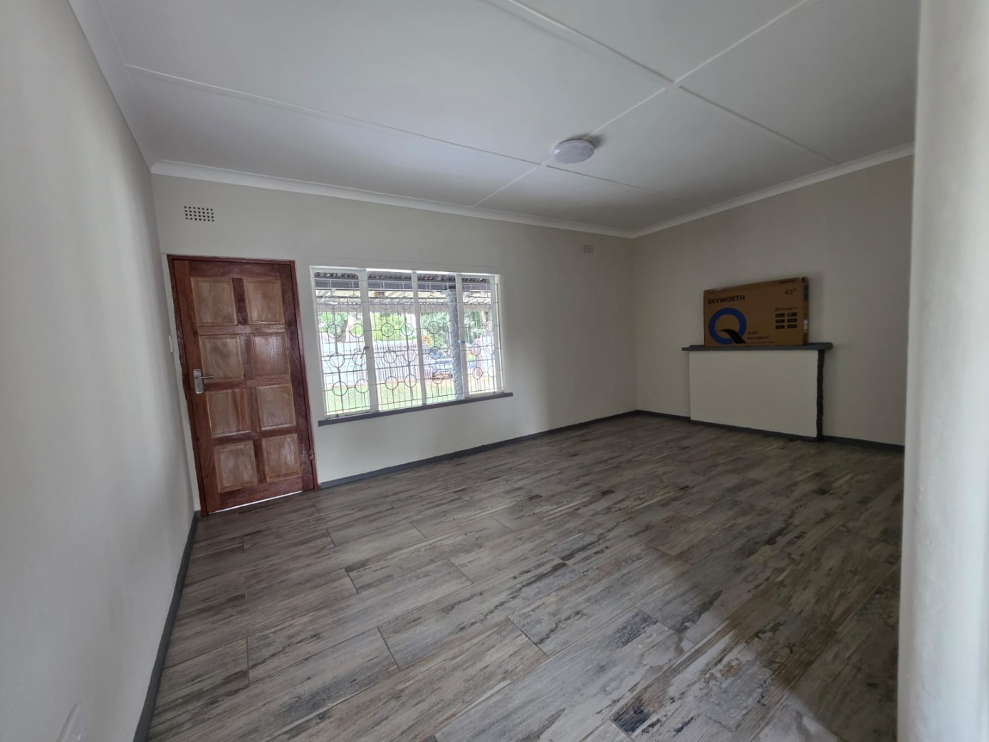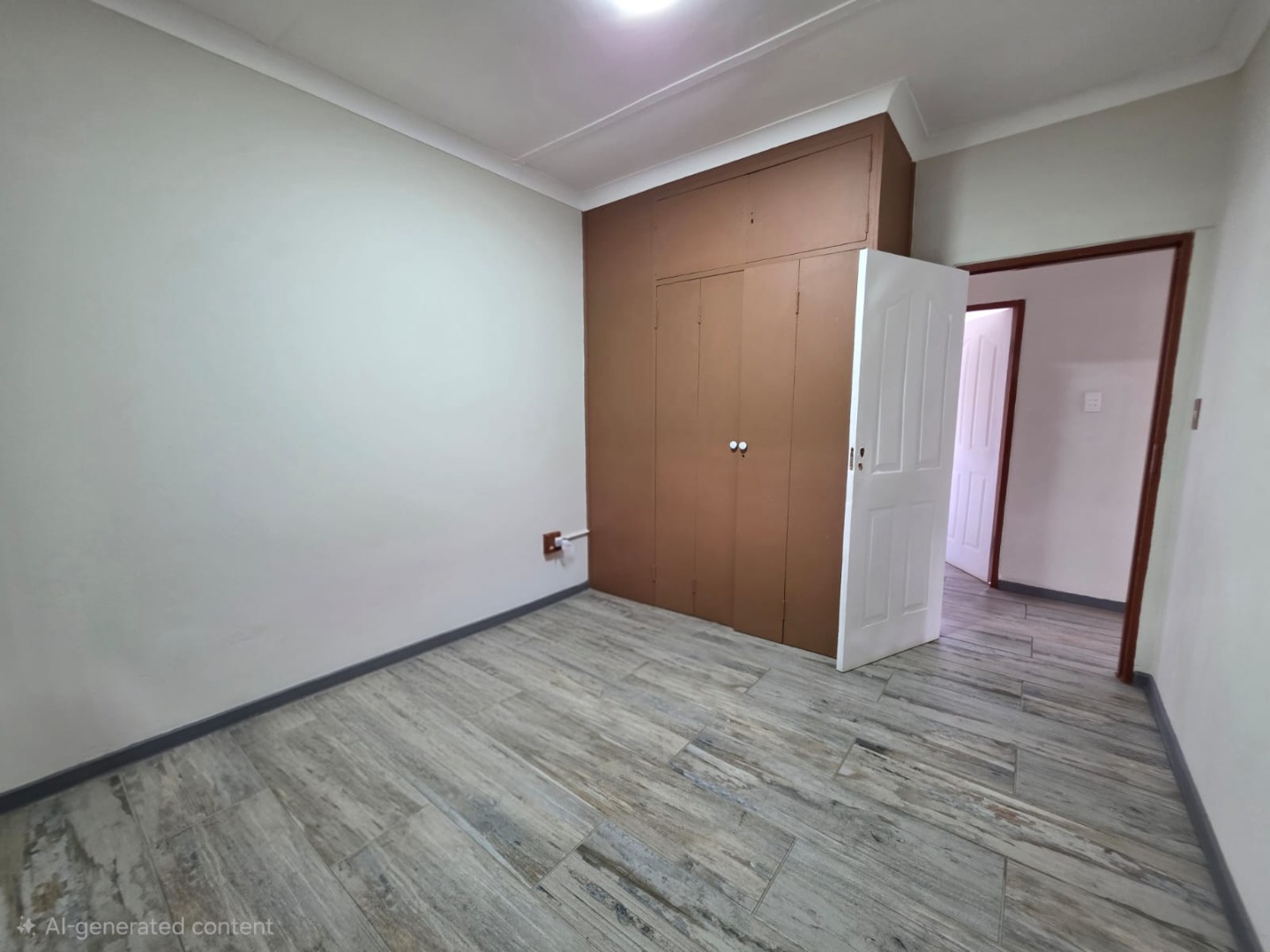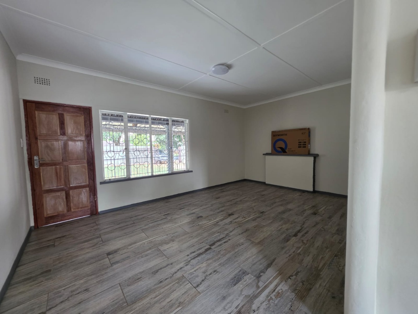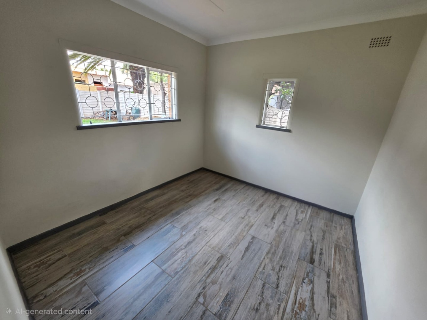 The residence comprises three well-proportioned bedrooms, each offering natural light and the same modern wood-look tiled flooring. One bedroom includes convenient built-in storage, enhancing practicality. The property provides 1.5 bathrooms, including a main bathroom fitted with a bathtub and an overhead shower attachment, complemented by white tiled walls and a decorative frosted window for privacy. A separate toilet room adds to the home's functionality.