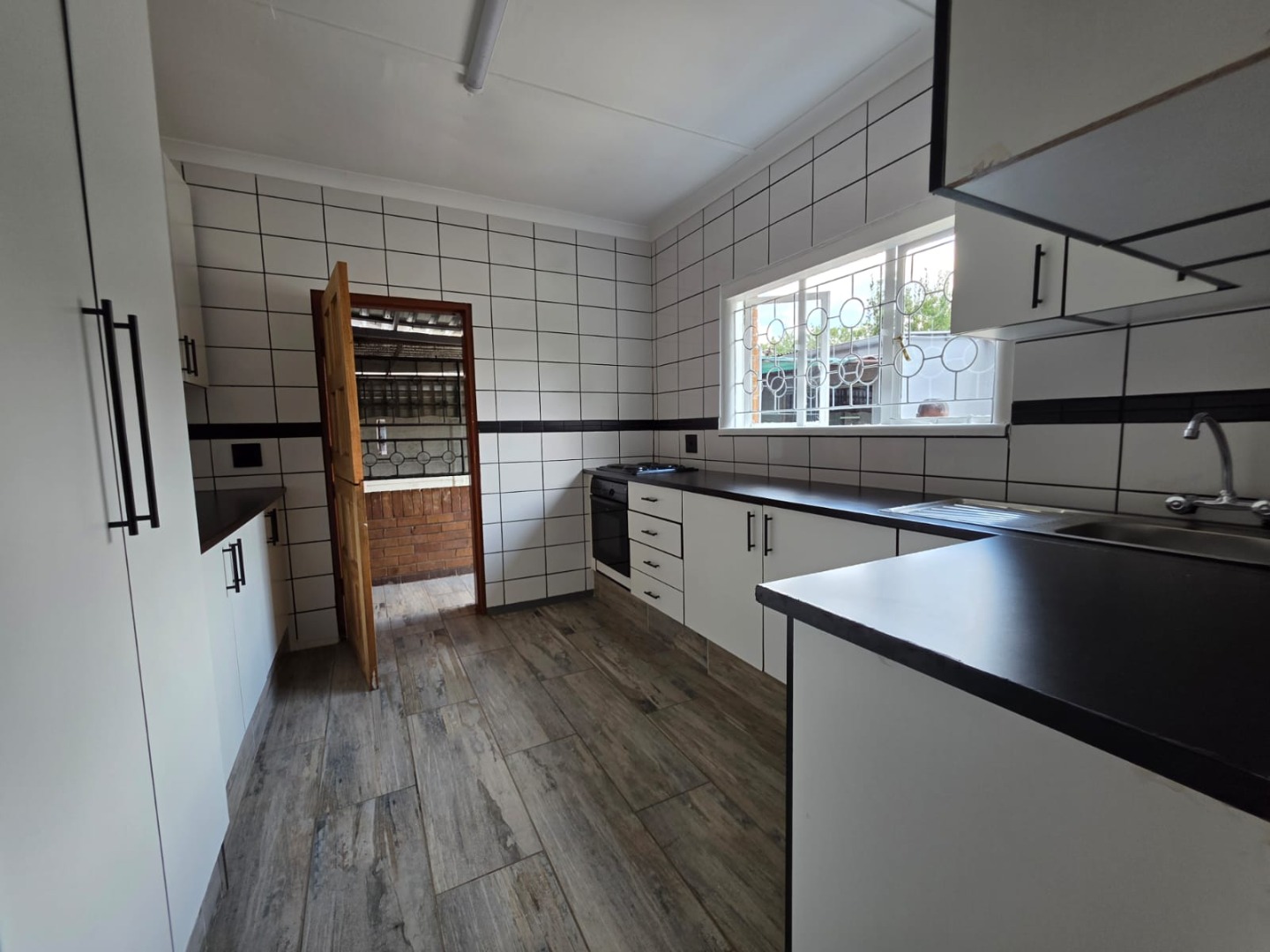 The heart of this home is its modern, renovated kitchen, designed with a clean aesthetic. It features sleek white cabinetry, contrasting black countertops, and stylish black and white tiled walls. Equipped with a built-in stove and ample counter space, this kitchen is both functional and visually appealing. The entire home benefits from new wood-look tiled flooring and freshly painted neutral walls, creating a cohesive and contemporary feel throughout.