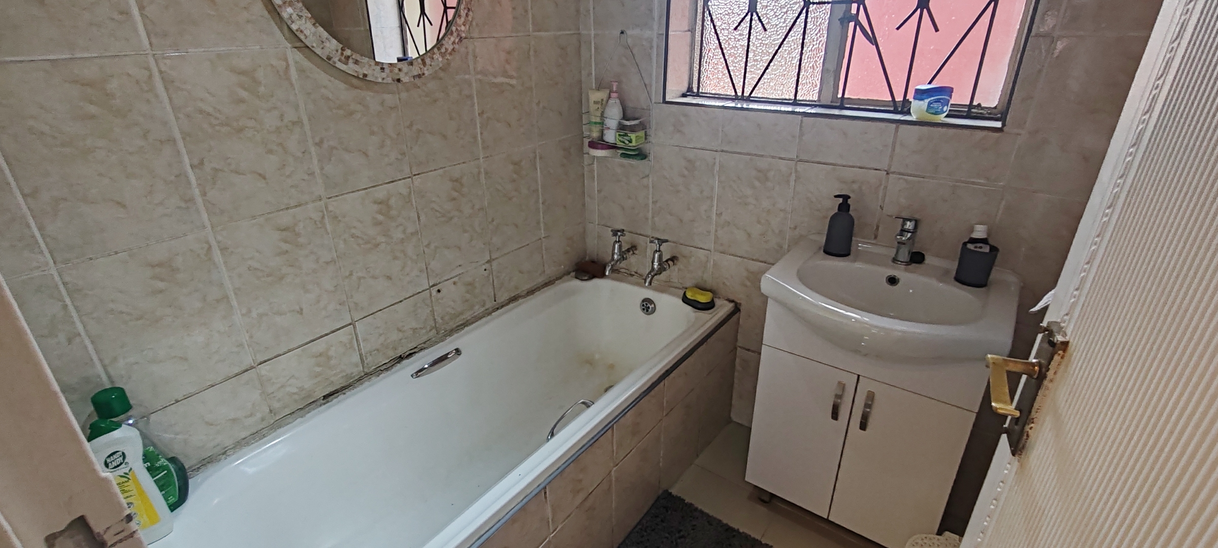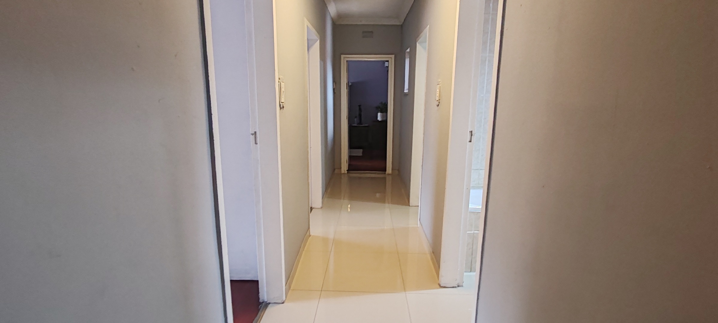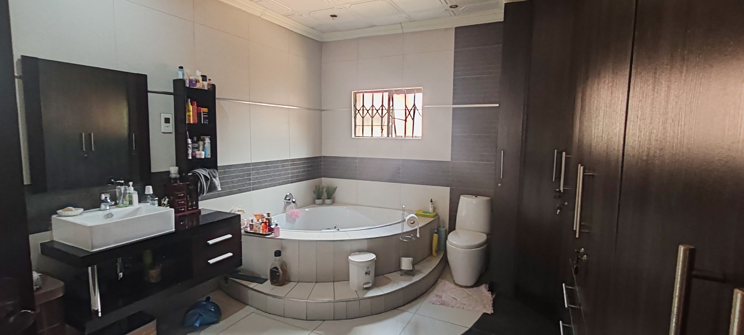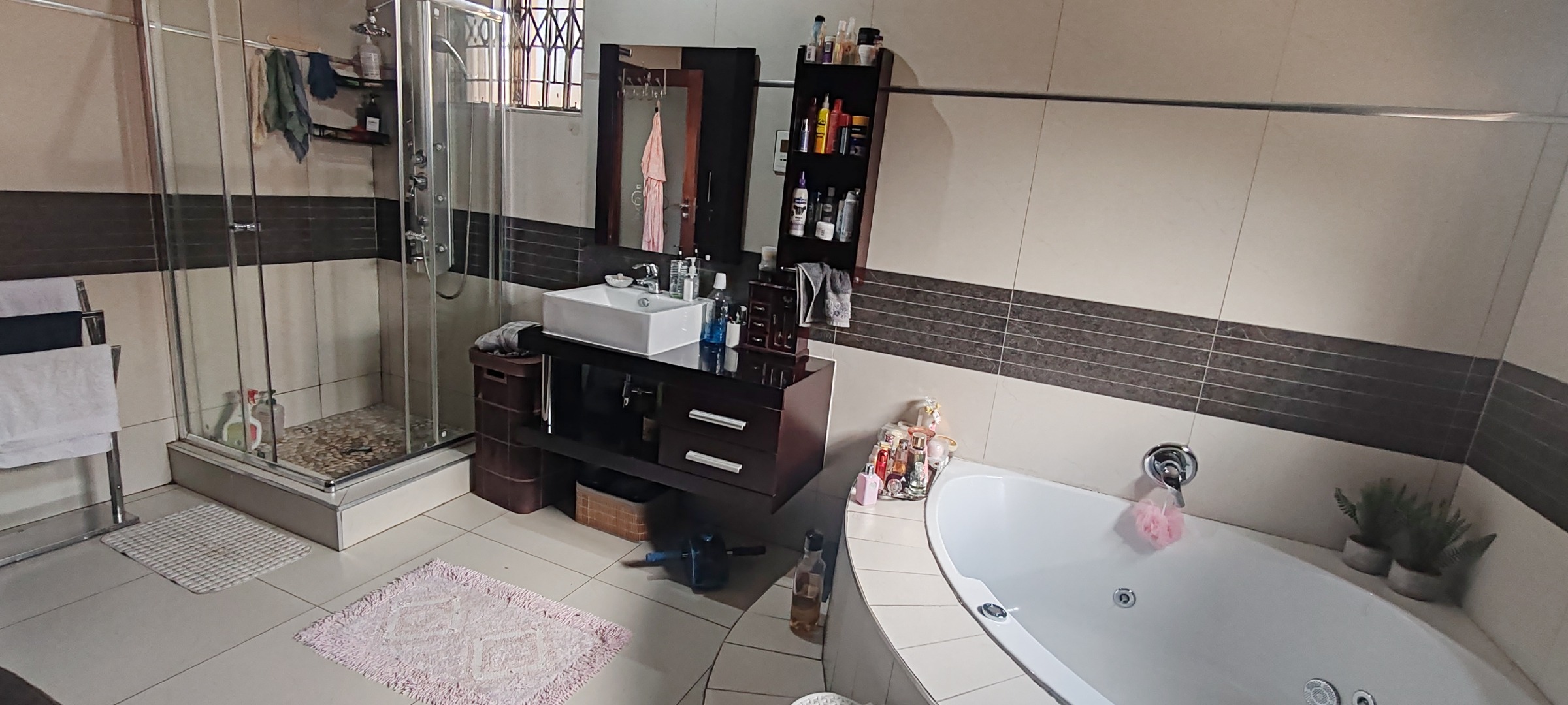 The property features three spacious bedrooms, all fitted with built-in cupboards. The main bedroom includes a luxurious en-suite bathroom complete with a shower, bath, basin, and toilet, along with additional cupboard space. A second bathroom serves the remaining bedrooms and includes a bath and basin, with a separate toilet for added convenience.