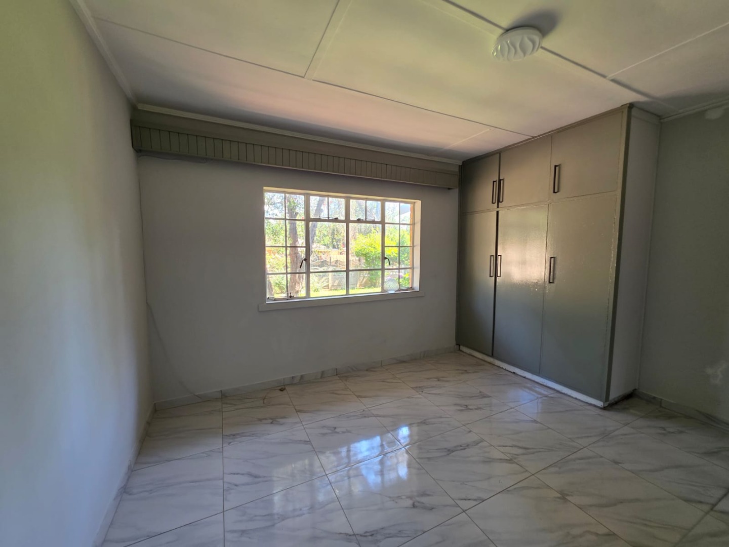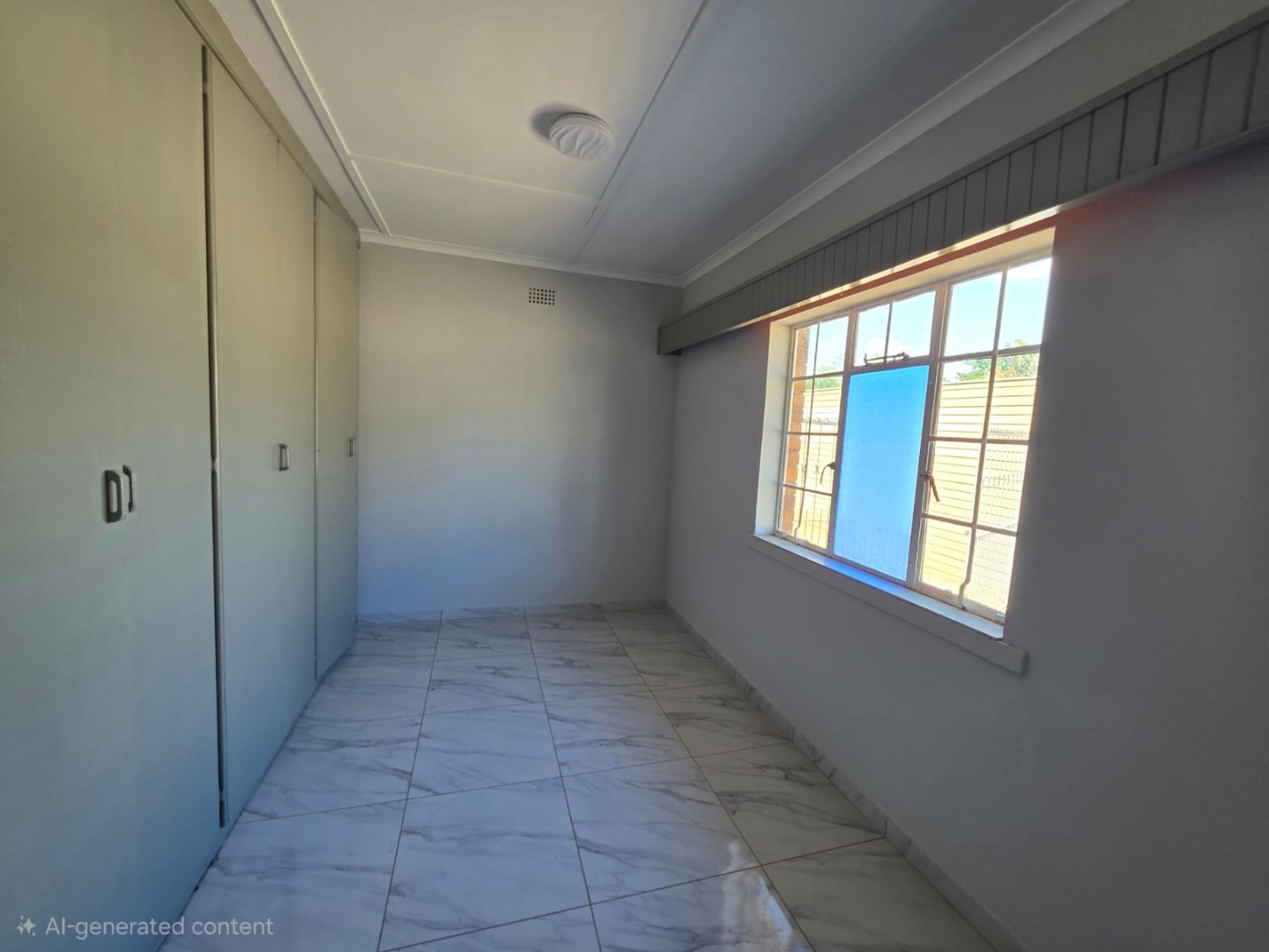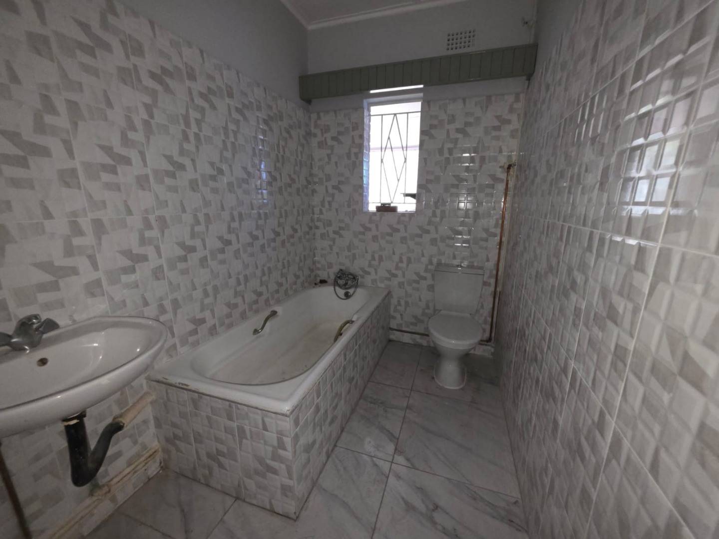 Each of the three bedrooms is designed for comfort, featuring durable tiled flooring, neutral light grey walls, and built-in wardrobes that offer practical storage solutions. Large windows ensure abundant natural light in every room. The single bathroom is fully tiled, equipped with essential fixtures including a sink, toilet, and bathtub, ensuring easy maintenance.