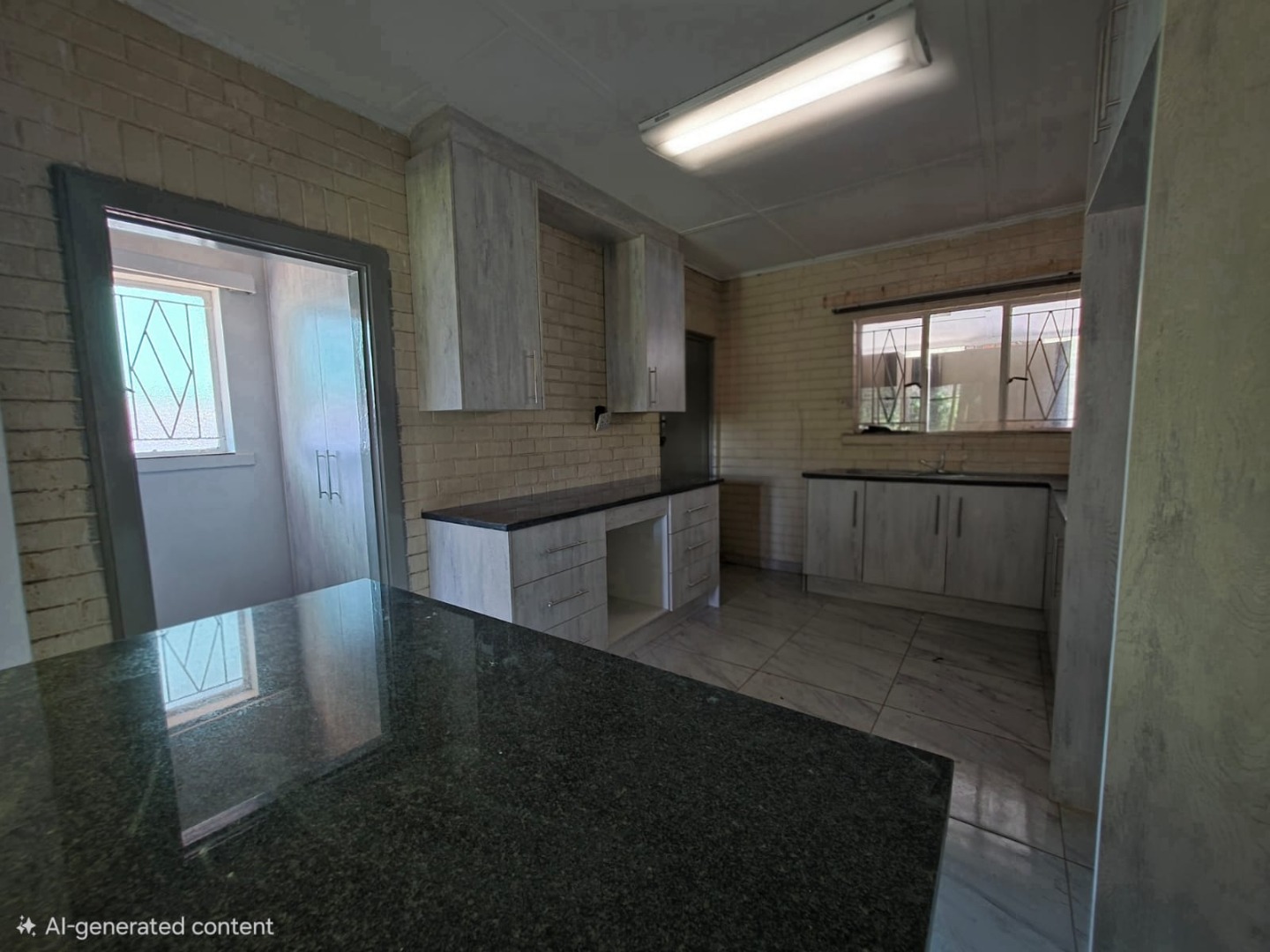 The interior boasts an open-plan layout, seamlessly connecting the living spaces. The lounge features modern tiled flooring and ample natural light, creating a bright and welcoming atmosphere. An updated kitchen, complete with new light-colored cabinetry, dark countertops, and a convenient breakfast bar, forms the heart of the home. Unique exposed brick accents in the kitchen add character, while the tiled flooring extends throughout for a cohesive finish. A decorative fireplace in the living area provides a charming focal point.