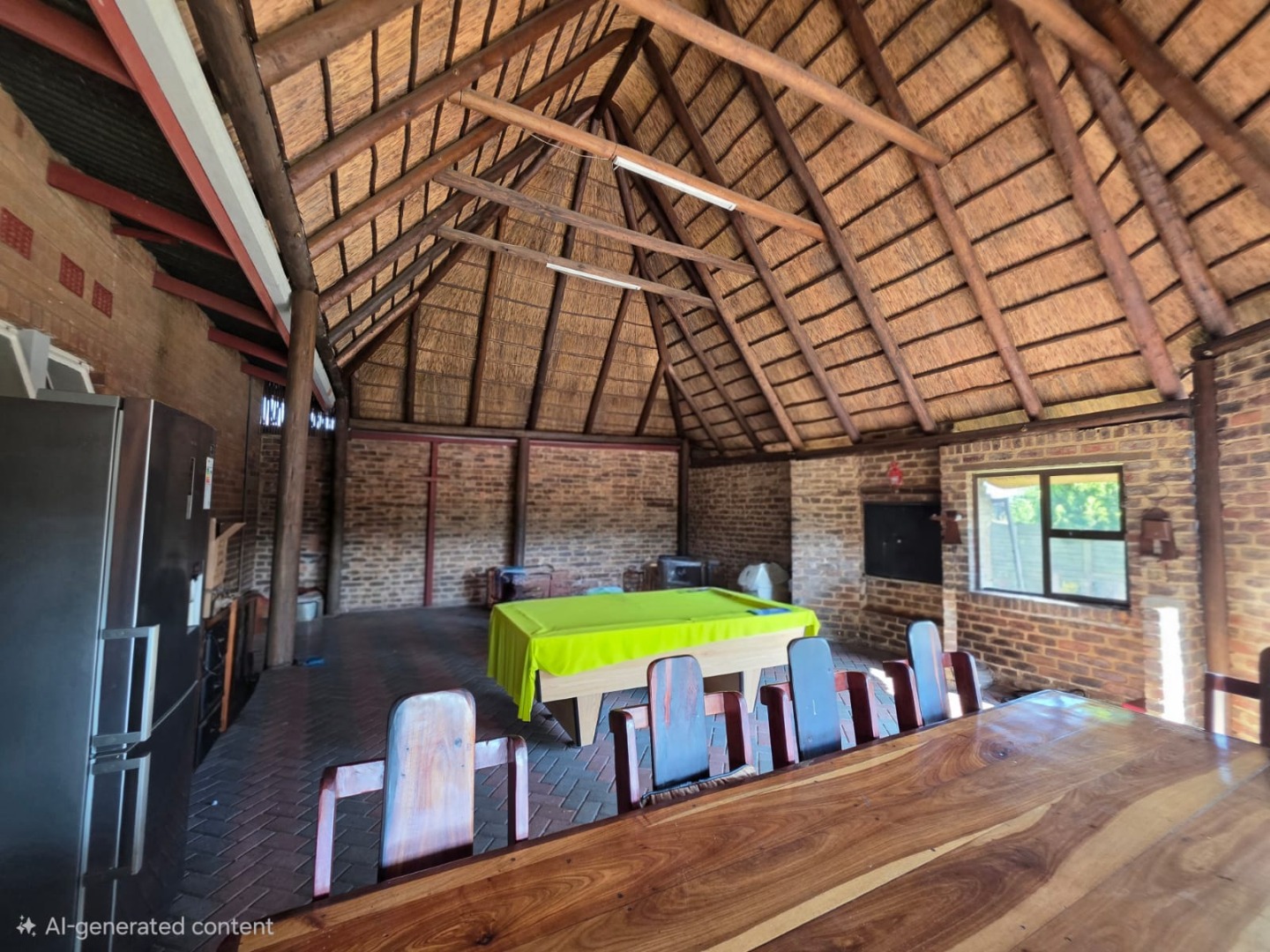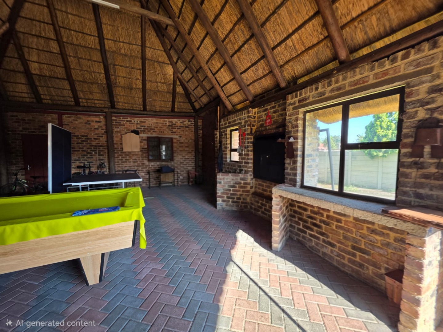 The highlight of this property is its impressive outdoor living space, featuring a large, clean swimming pool with a paved surround. Adjacent to the pool, a distinctive thatched entertainment lapa boasts a high roof with exposed timber beams, brick walls, and durable paver flooring. This versatile area includes a built-in braai, ample room for a pool table and table tennis, and sliding doors that connect seamlessly to the outdoors, making it perfect for hosting gatherings.