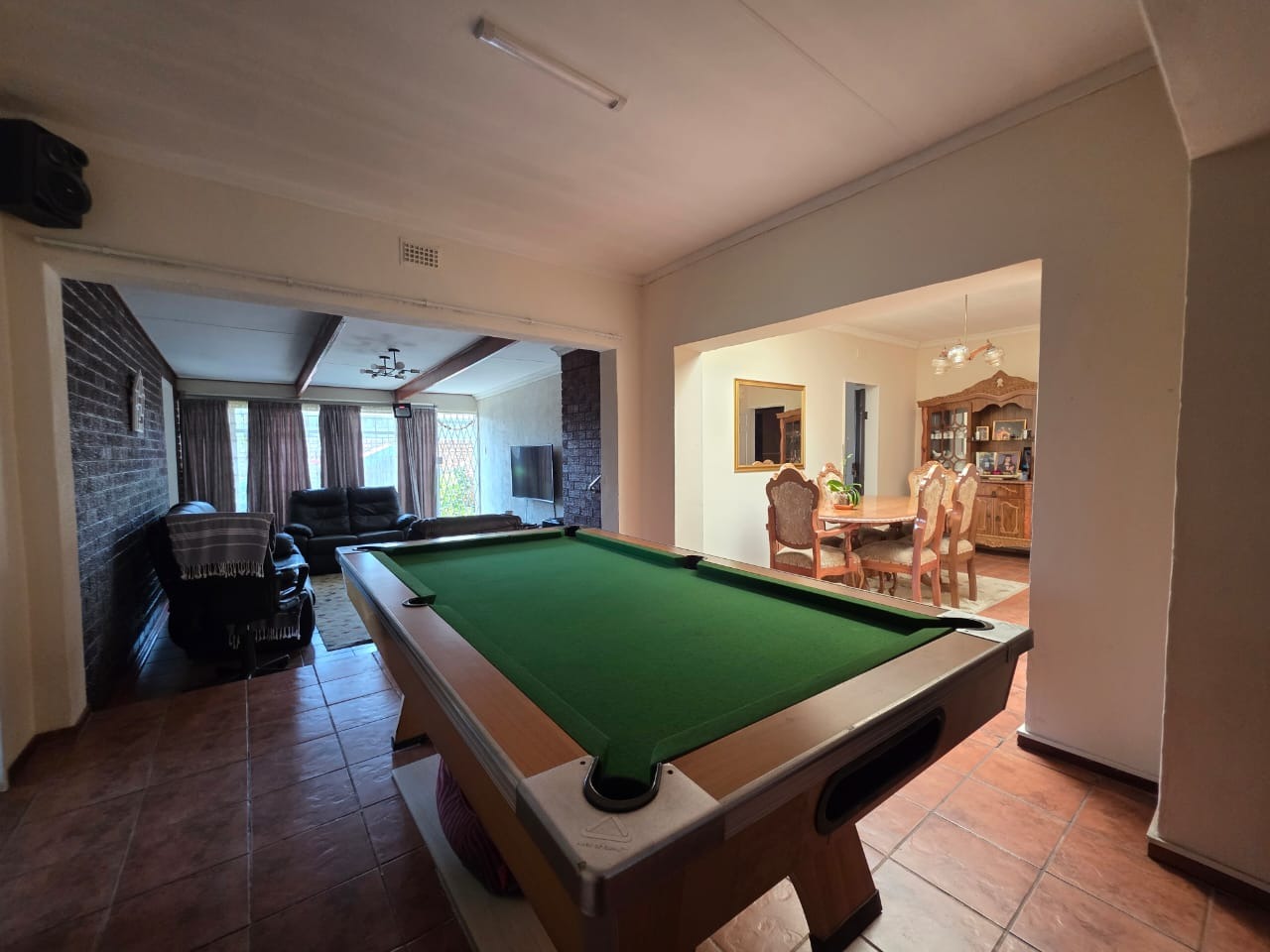 The interior boasts an impressive array of living spaces designed for versatility and comfort. Discover three distinct lounges, including a spacious area with natural light and durable tiled flooring, and another featuring characterful exposed wooden beams and brick accent walls. An open-plan layout seamlessly connects to a dedicated recreation area, complete with a pool table, perfect for social gatherings. The traditional dining room, illuminated by a skylight, provides an inviting space for meals. The functional kitchen offers ample cream-colored cabinetry, extensive countertops, a double sink, a gas hob, and a built-in oven, catering to all culinary needs.