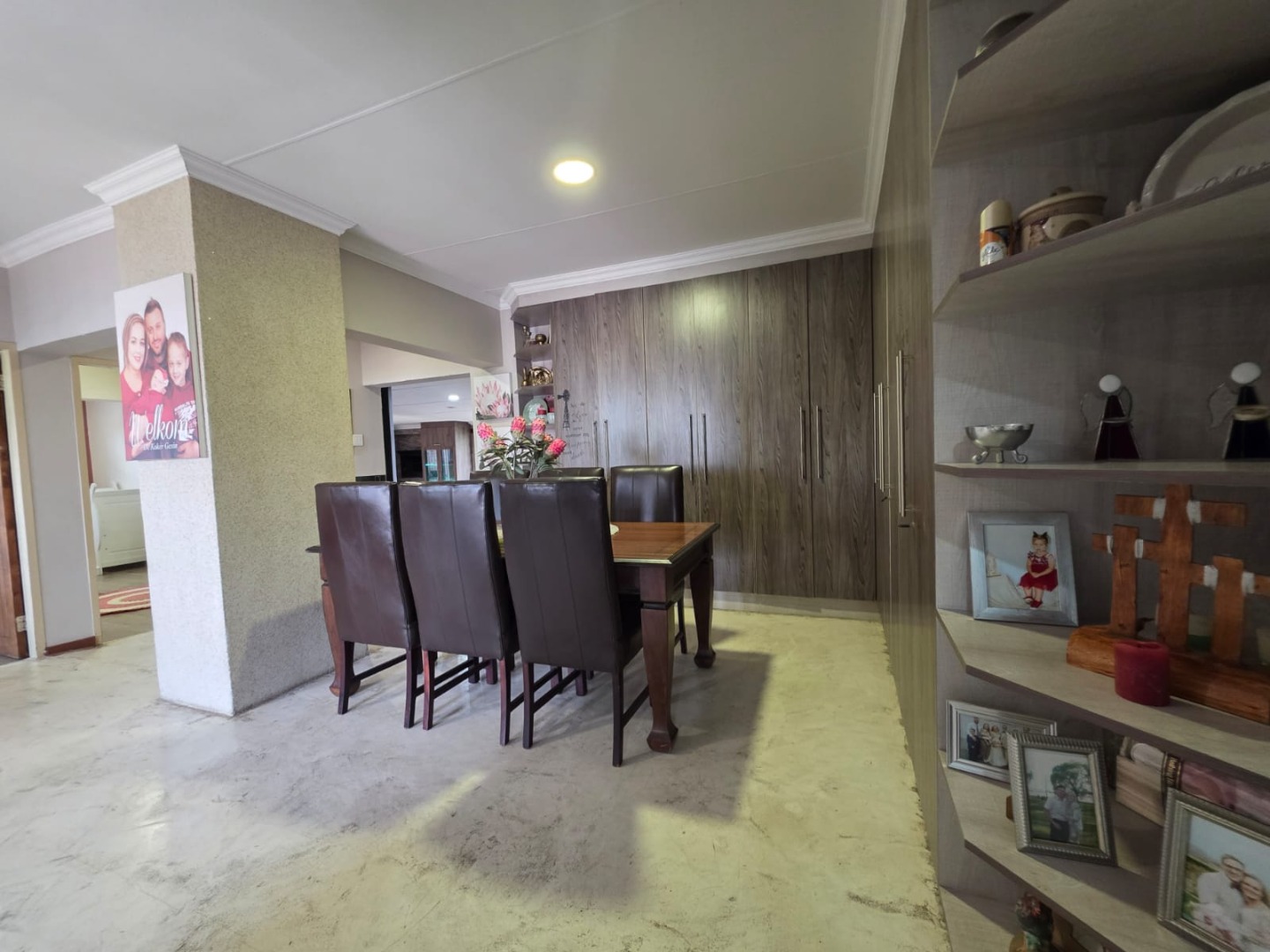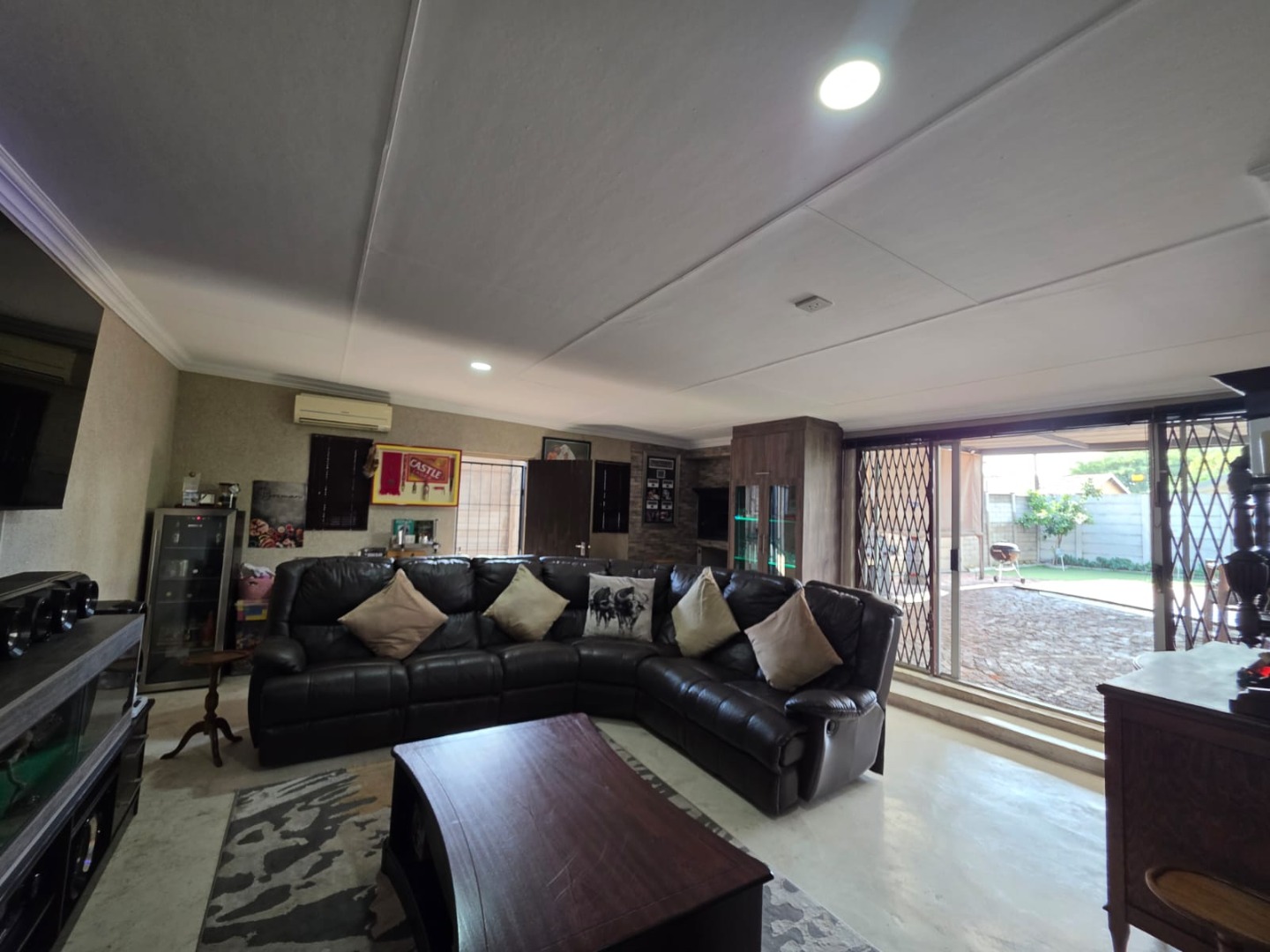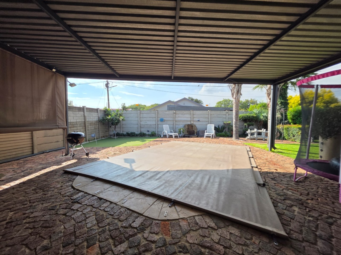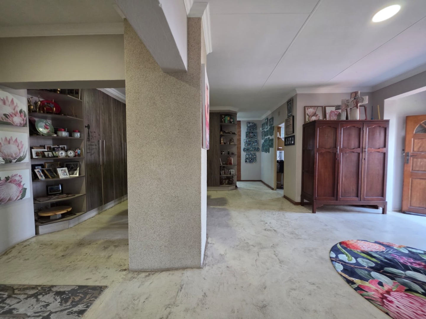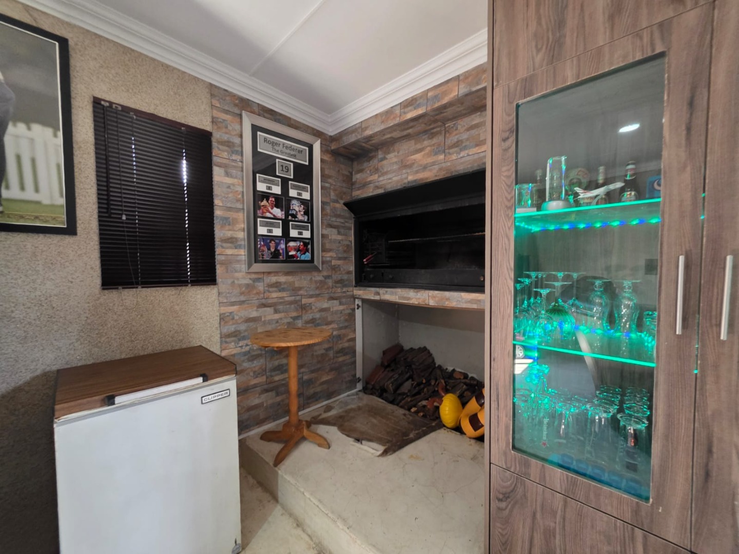 Outdoor living is well catered for with a private garden, a refreshing heated swimming pool, and a dedicated braai area, perfect for hosting gatherings. Additional amenities include a built-in braai and a fireplace, enhancing both indoor and outdoor comfort. Practical features such as a laundry room, 5 air conditioning units, and solar panels contribute to the home's functionality and efficiency. The property also benefits from three garages and two additional parking spaces, ensuring ample secure parking for residents and guests.
