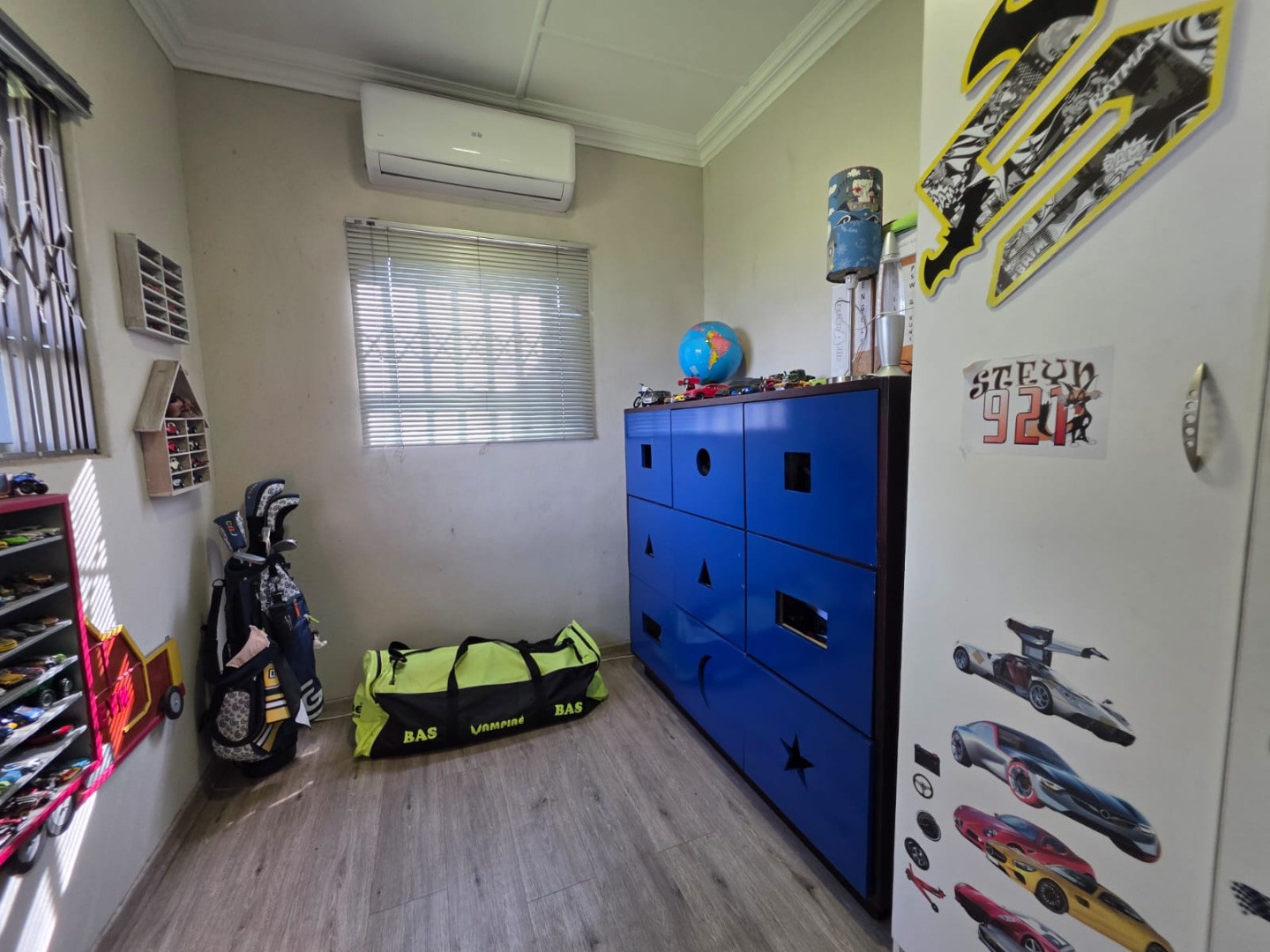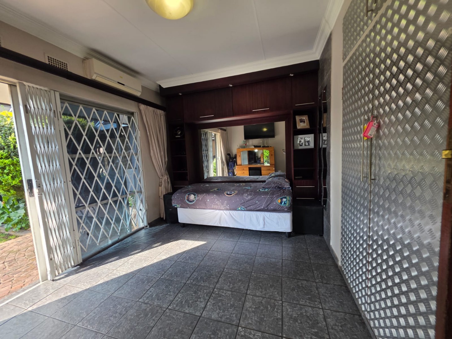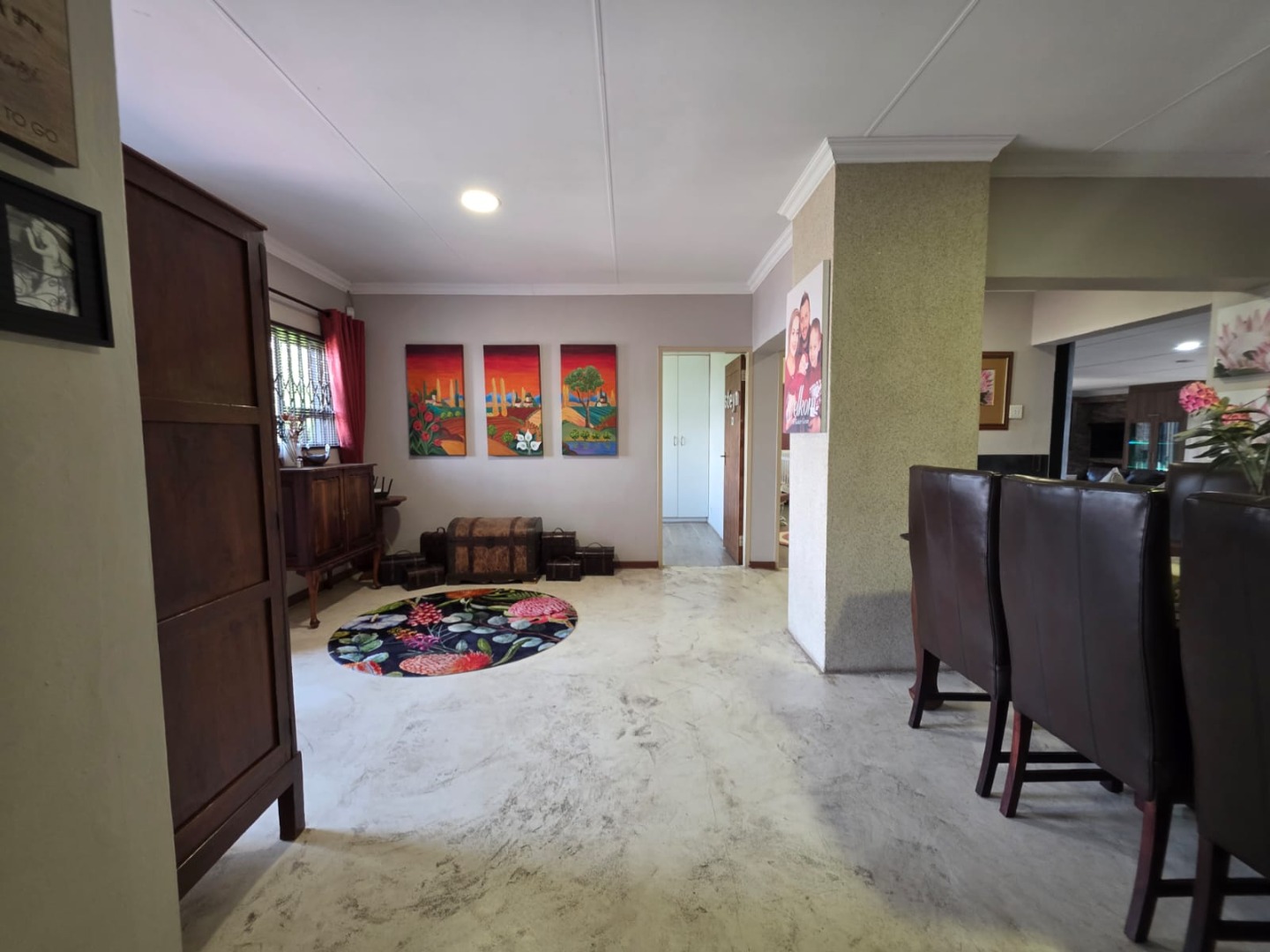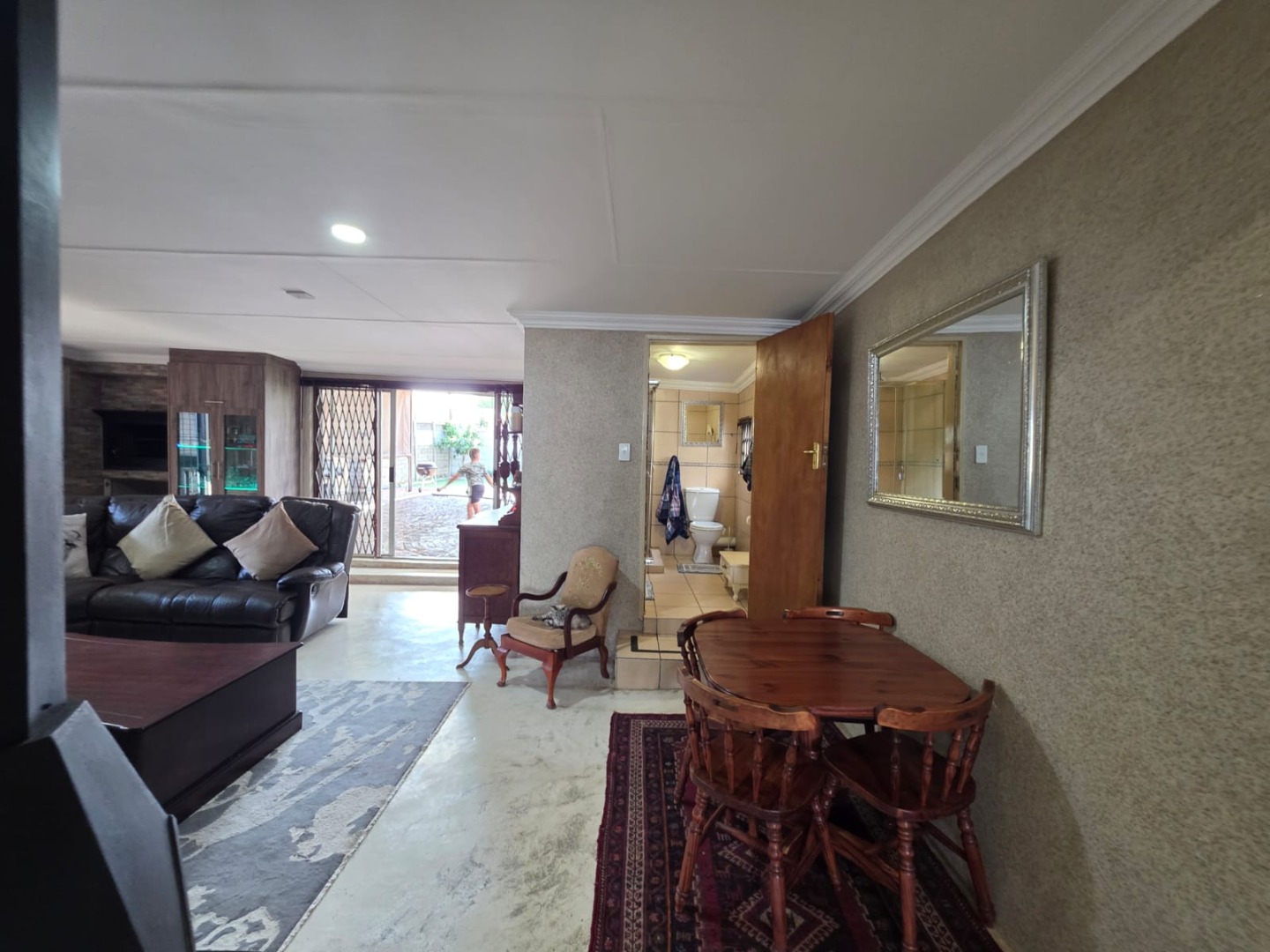 Outdoor living is well catered for with a private garden, a refreshing heated swimming pool, and a dedicated braai area, perfect for hosting gatherings. Additional amenities include a built-in braai and a fireplace, enhancing both indoor and outdoor comfort. Practical features such as a laundry room, 5 air conditioning units, and solar panels contribute to the home's functionality and efficiency. The property also benefits from three garages and two additional parking spaces, ensuring ample secure parking for residents and guests.