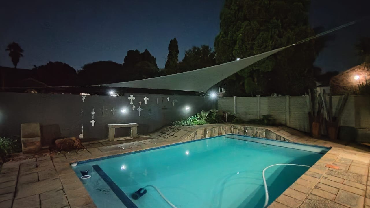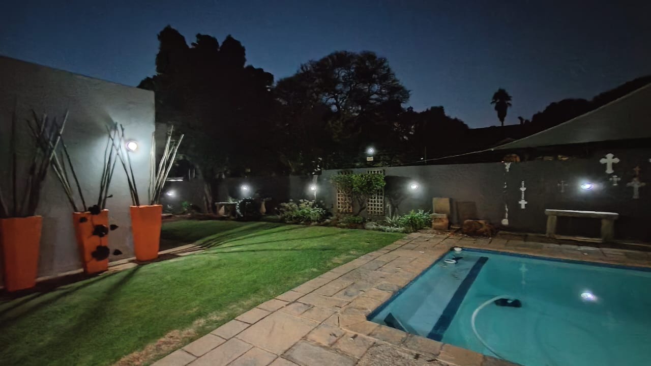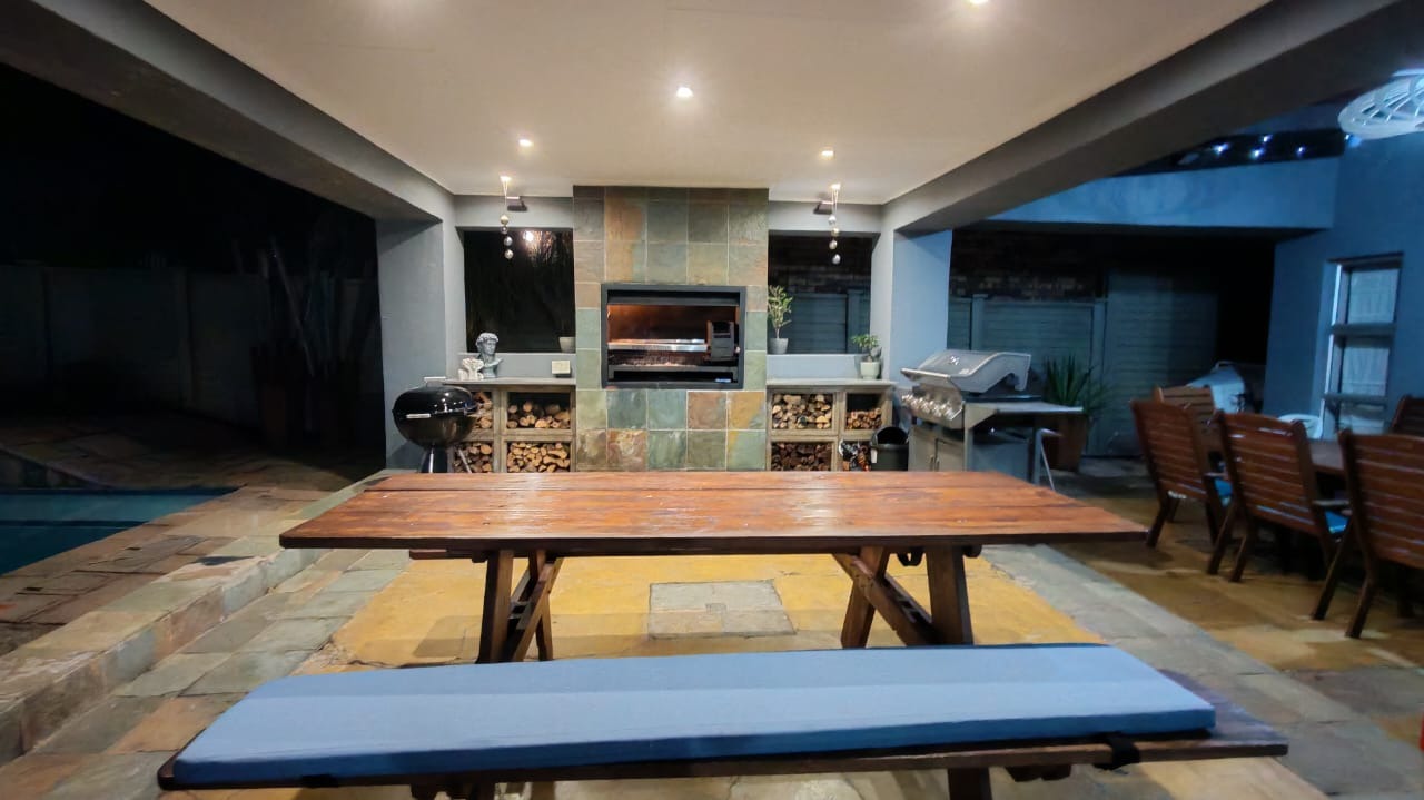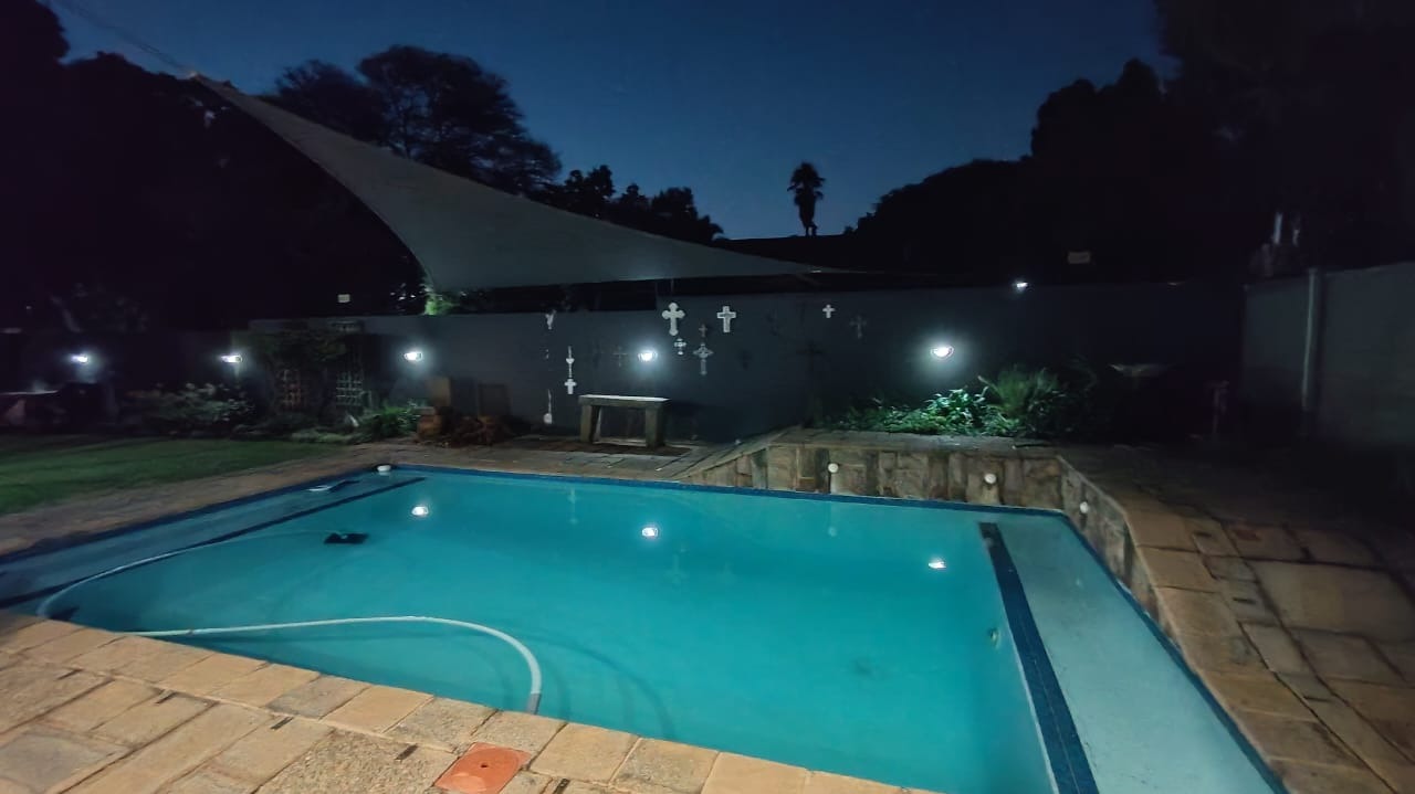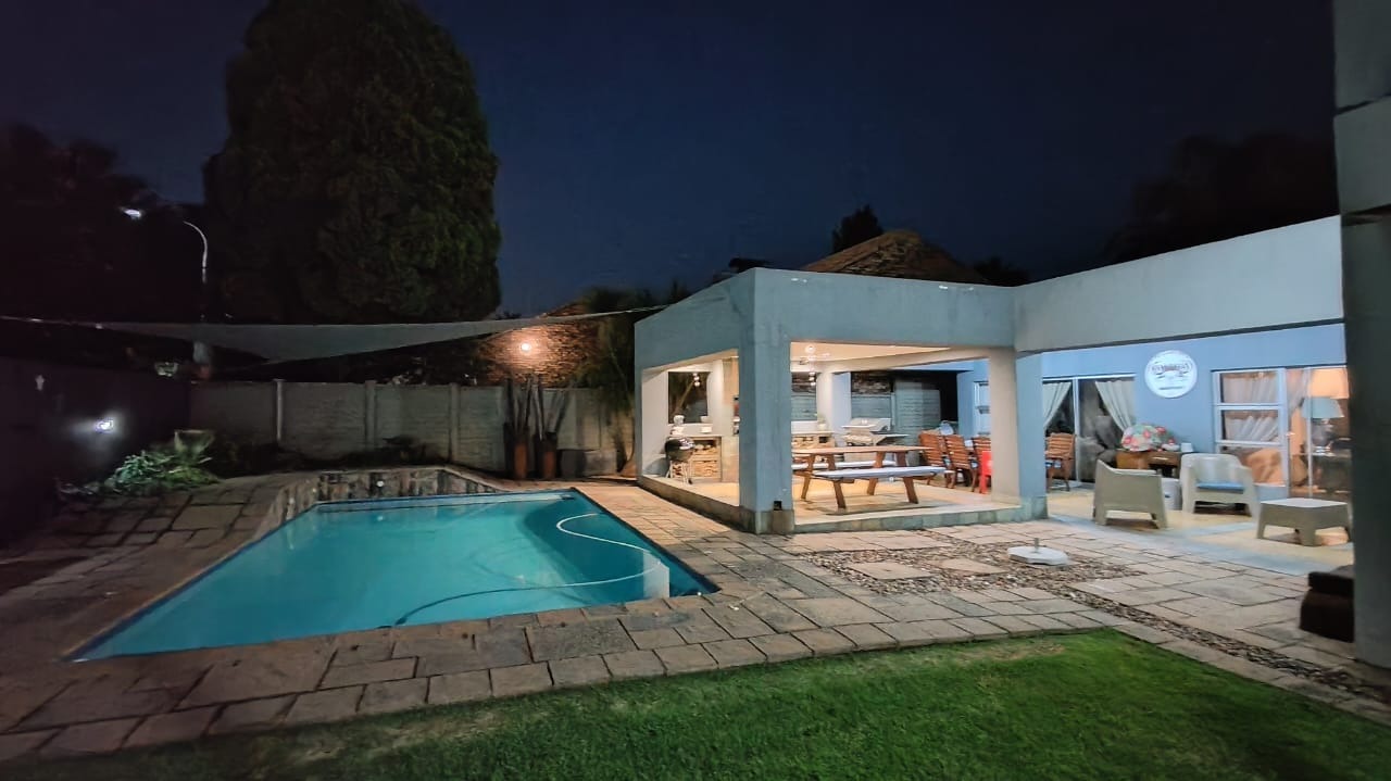The property offers exceptional outdoor living with a welcoming patio and an entertainment area featuring a built-in braai. A beautiful swimming pool, heated by six solar panels, provides a perfect spot for relaxation.