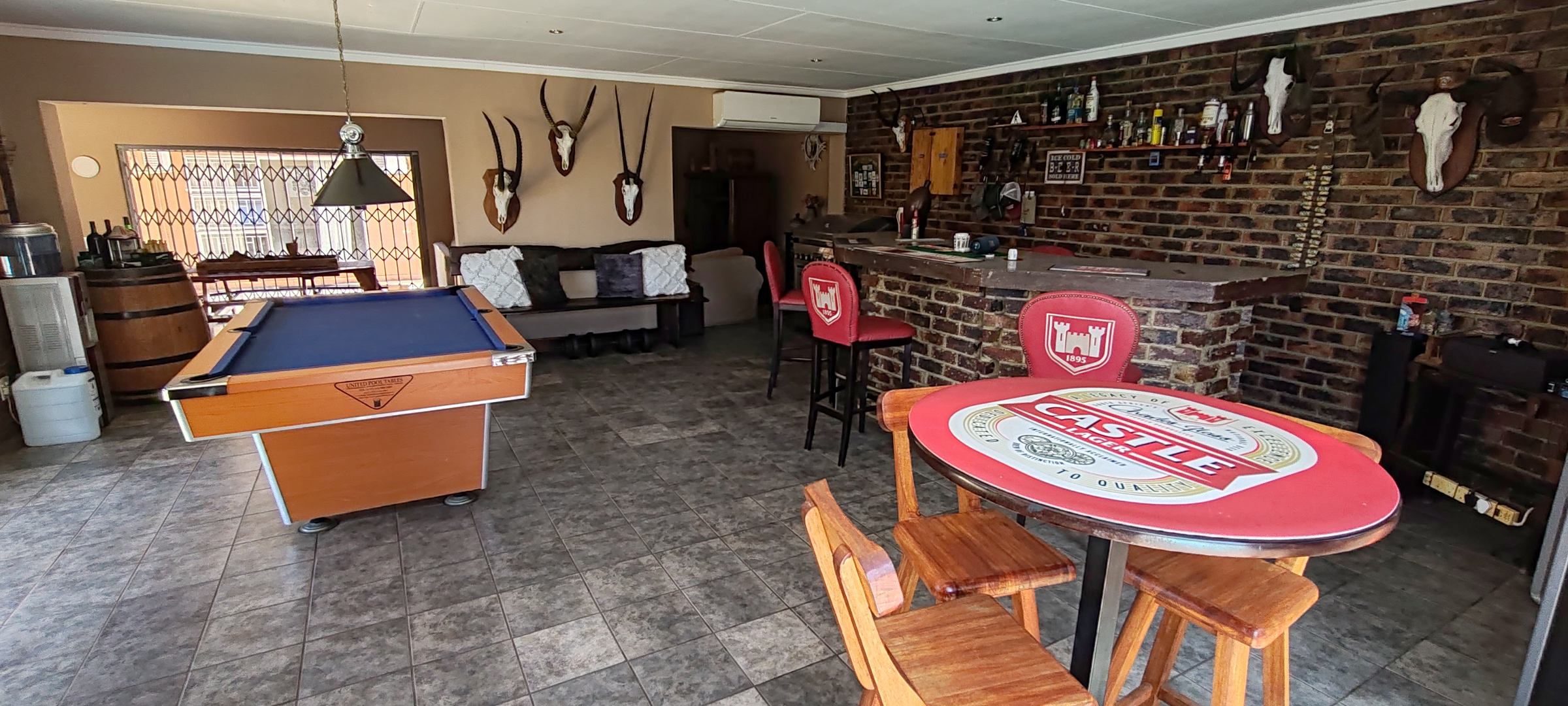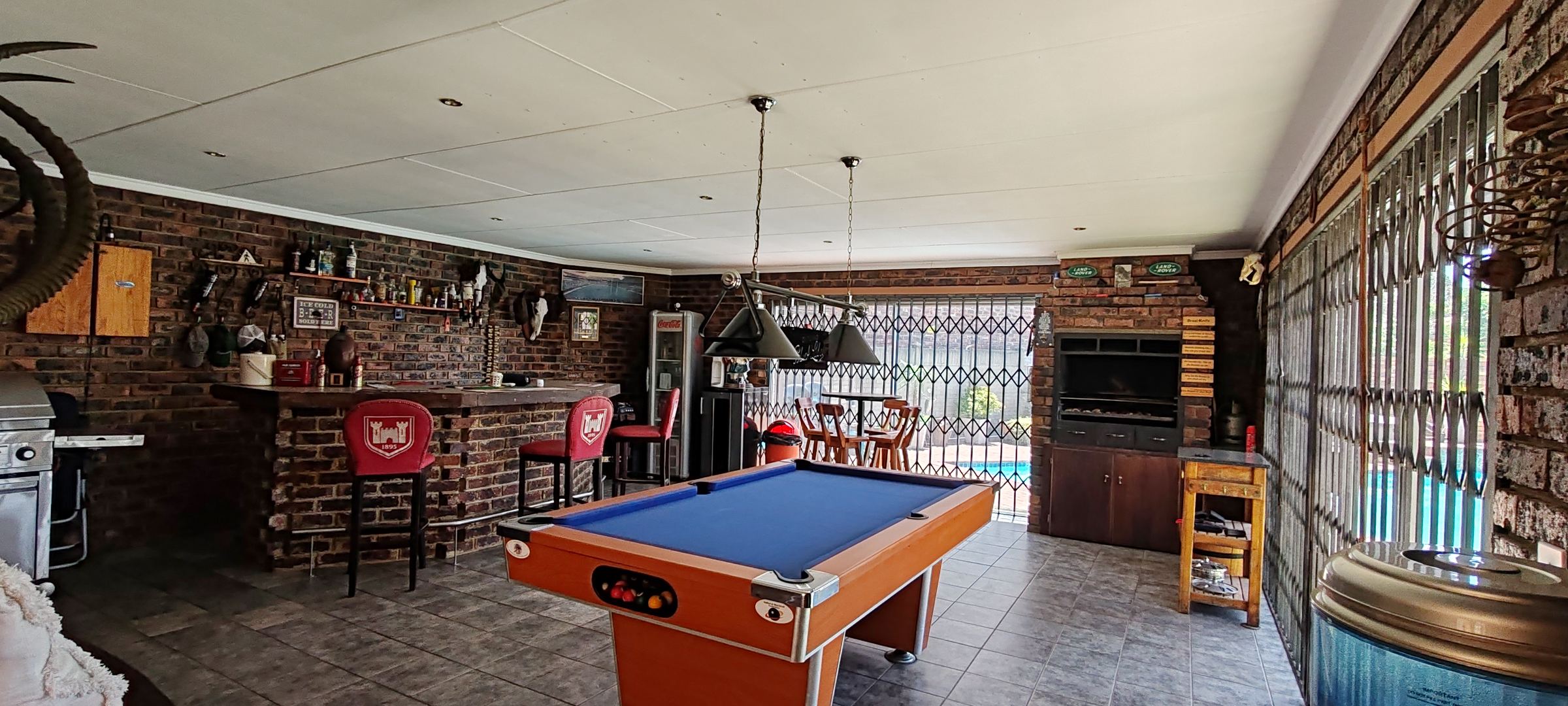 The open-plan lounge and dining area seamlessly connect to a spacious entertainment braai room, complete with a built-in braai and bar. Sliding doors on both sides open onto a beautifully maintained garden and sparkling swimming pool, creating a superb indoor-outdoor living and entertainment experience.