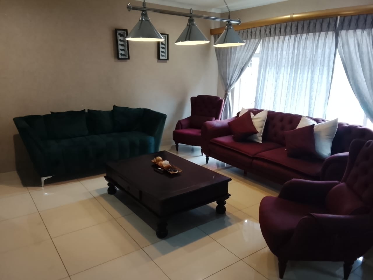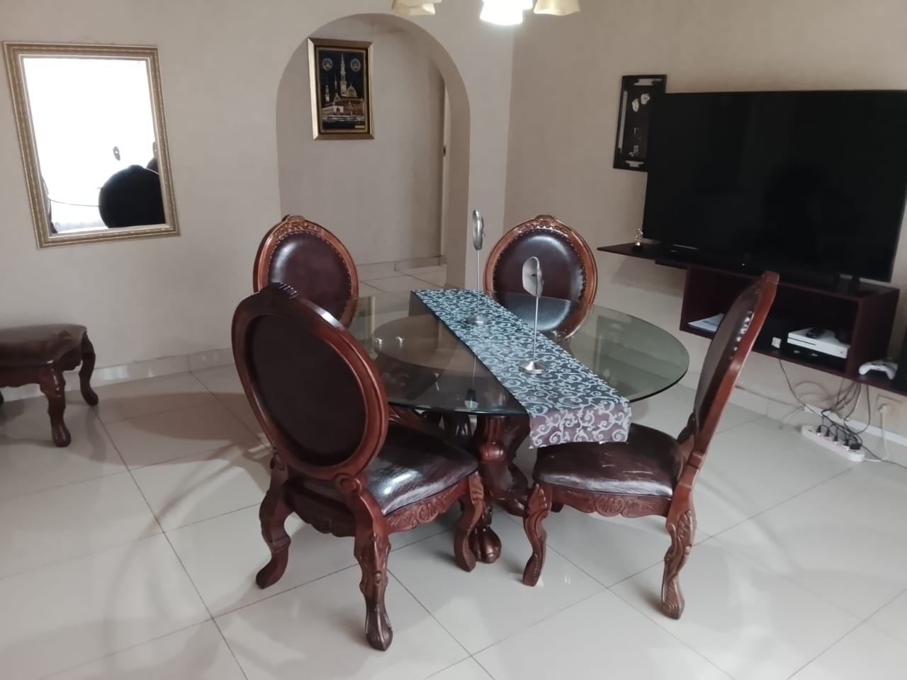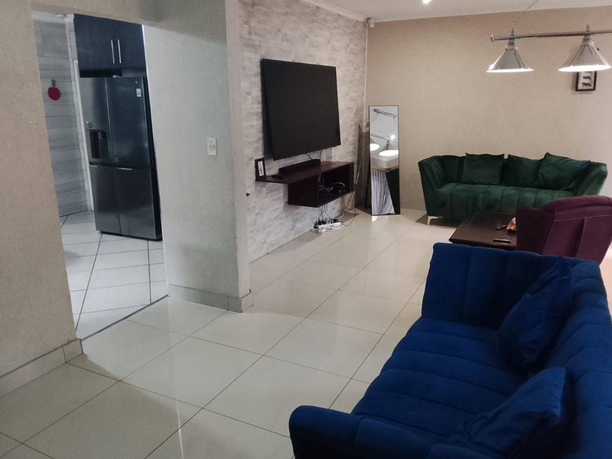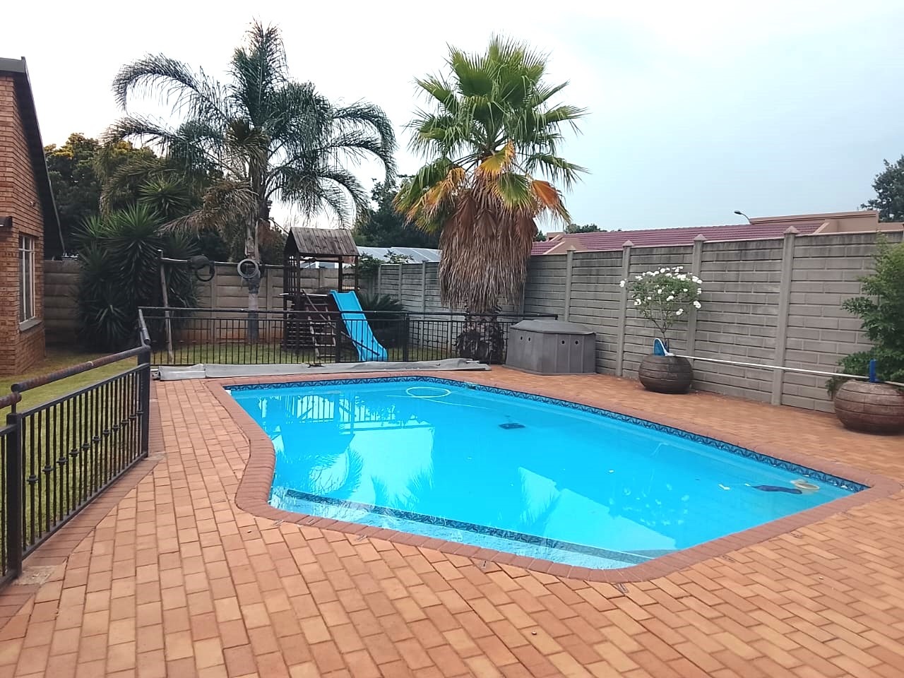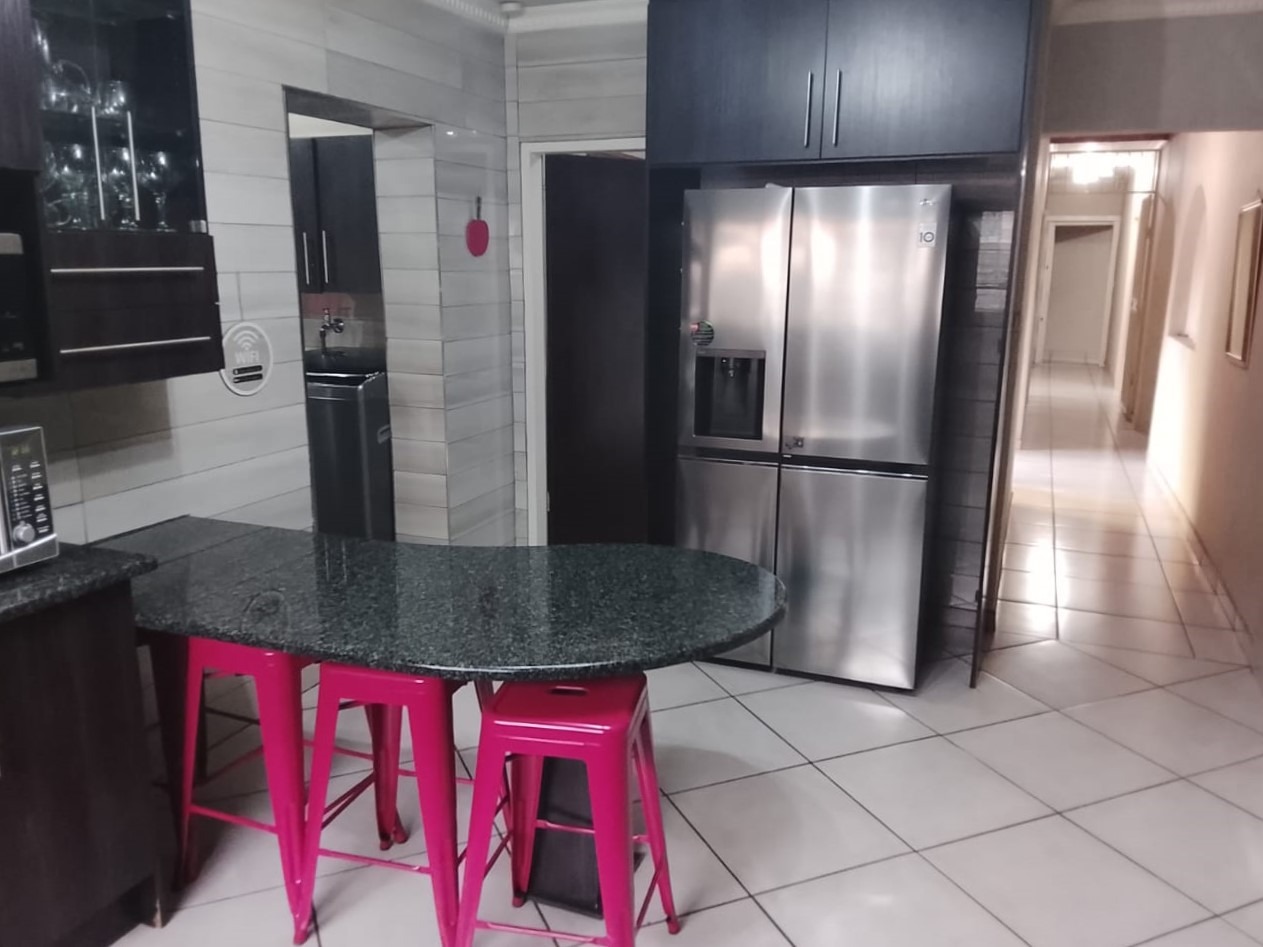The spacious family lounge opens via sliding doors to a covered lapa entertainment area, ideal for hosting guests or enjoying relaxed outdoor living. This overlooks a sparkling swimming pool and a jungle gym, making it a perfect space for family enjoyment. The cosy dining room offers an intimate setting for shared meals and gatherings.