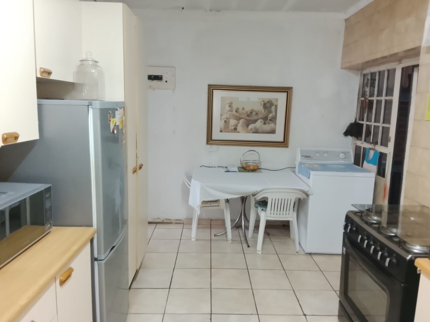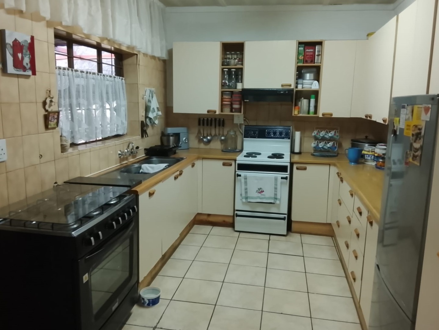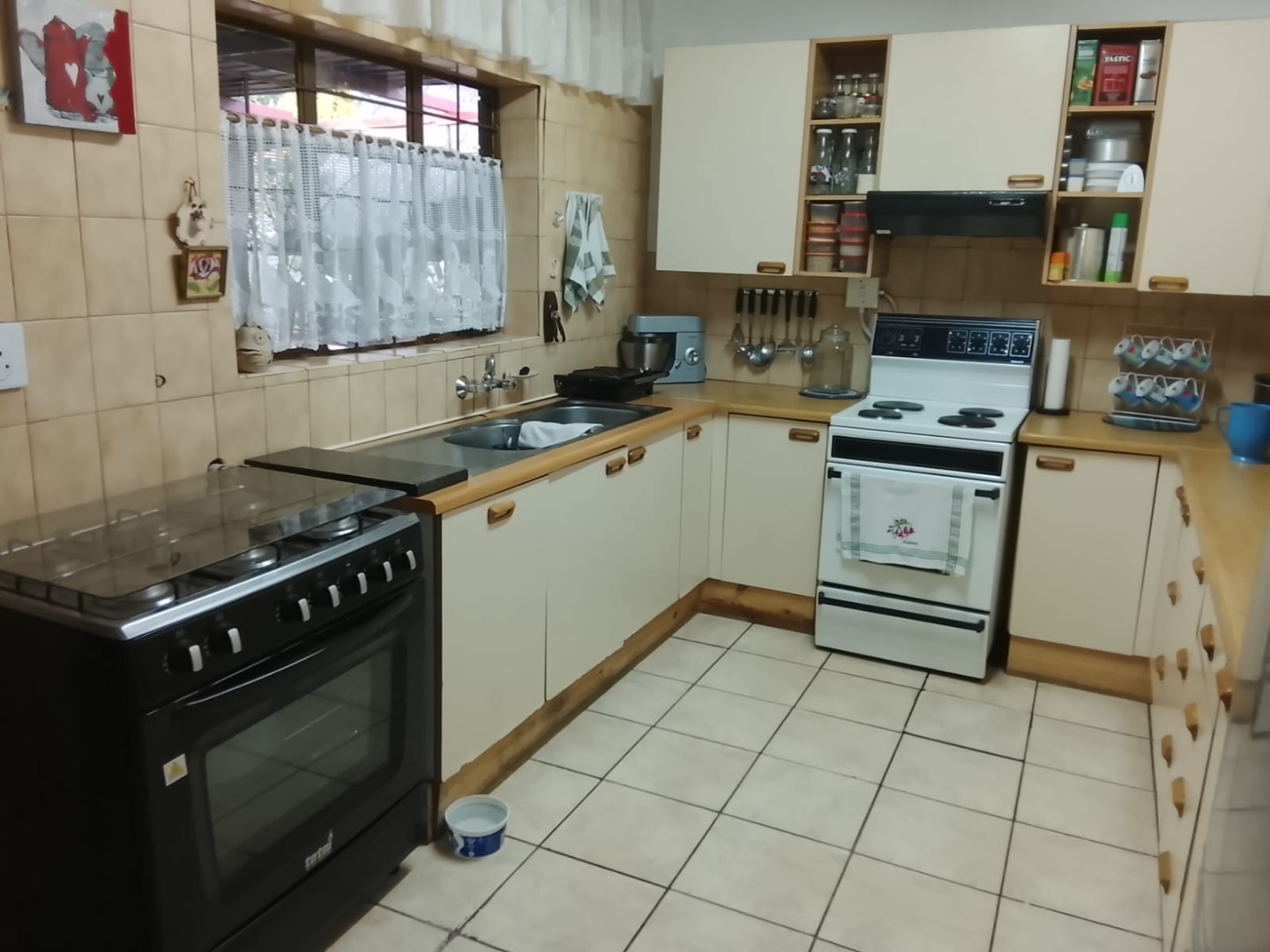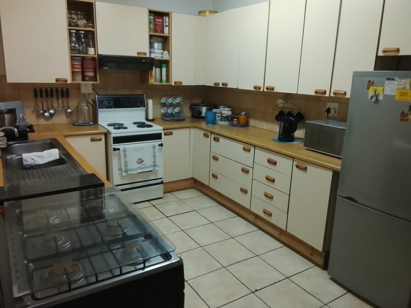 The interior features a functional U-shaped kitchen, equipped with ample light-coloured cabinetry, laminated countertops, and a free-standing electric stove/oven. The home also includes a spacious lounge and a walk-through dining area. There is three comfortable bedrooms and a bathroom, suitable for family living.