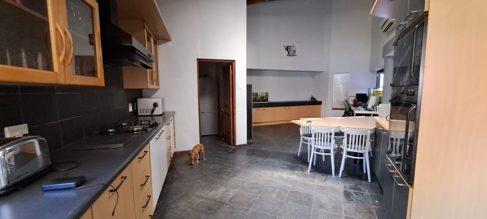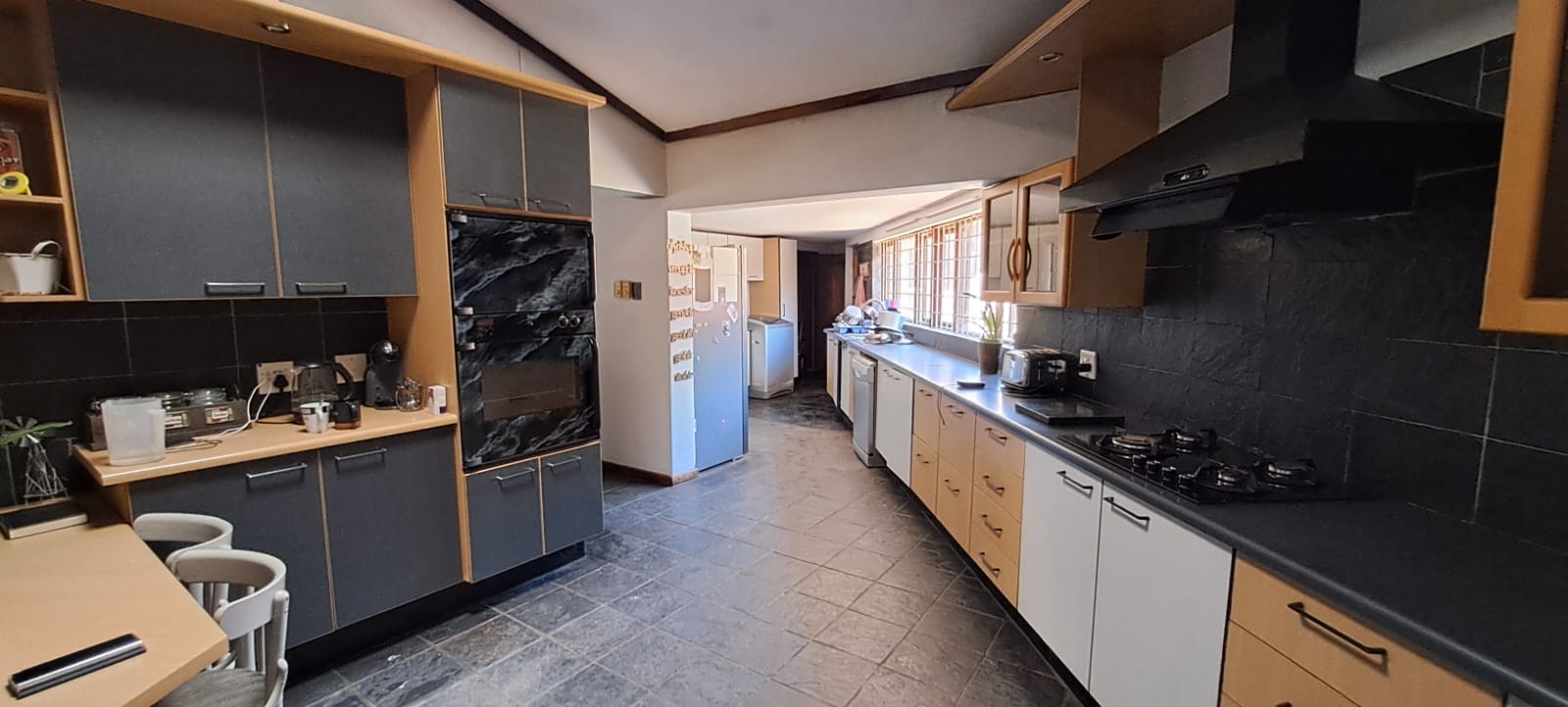 Large kitchen with gas hob, eye-level oven, ample cupboard space, a spacious pantry, and a separate scullery/wash-up area for dishwasher and washing machine