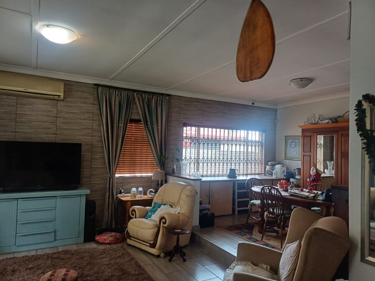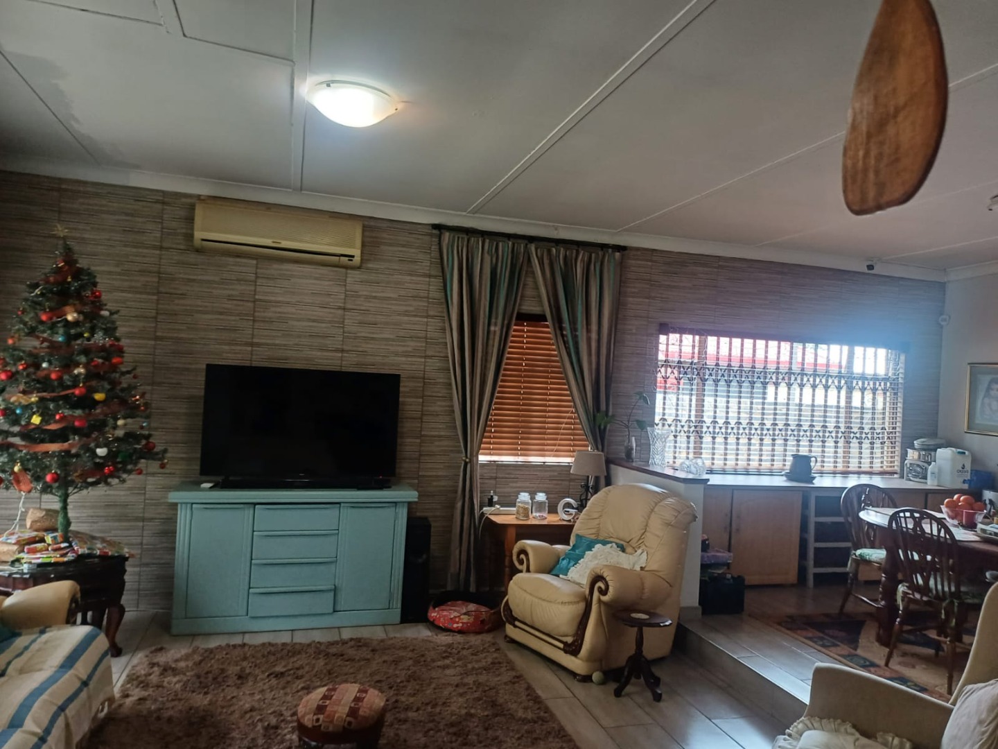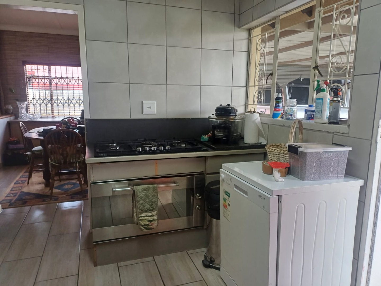 Inside, the home offers a functional layout with combined living and dining areas, benefiting from ample natural light and equipped with air conditioning for comfort. The kitchen is practical, featuring a built-in gas hob, oven, double stainless steel sink, and generous cabinet storage. Tiled flooring and security bars on windows enhance both durability and safety throughout.