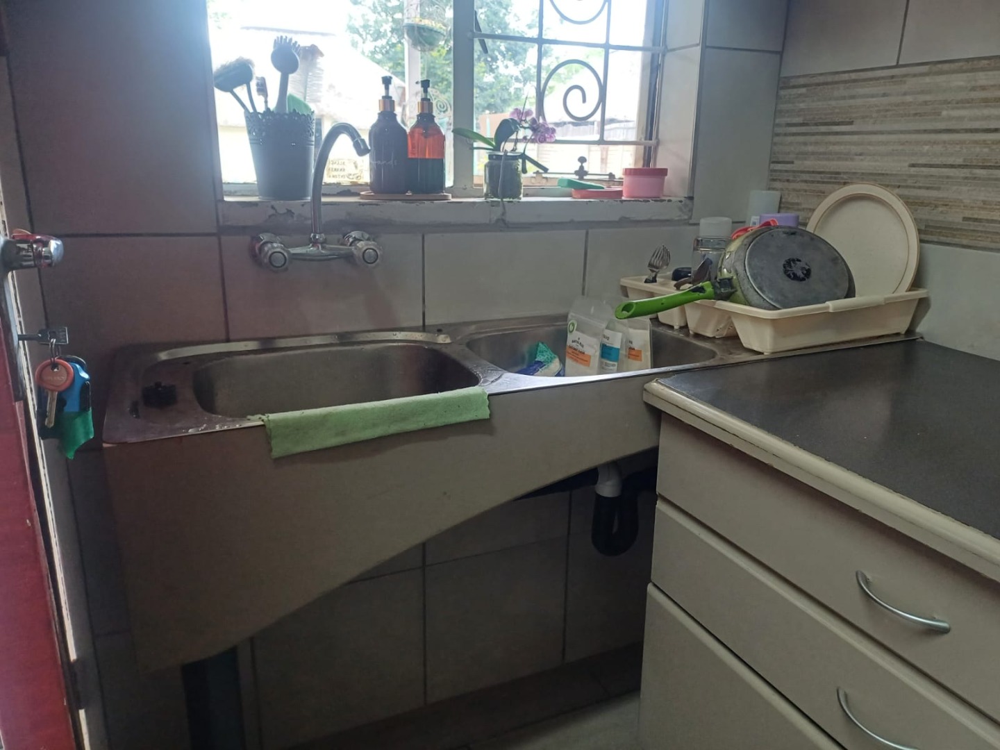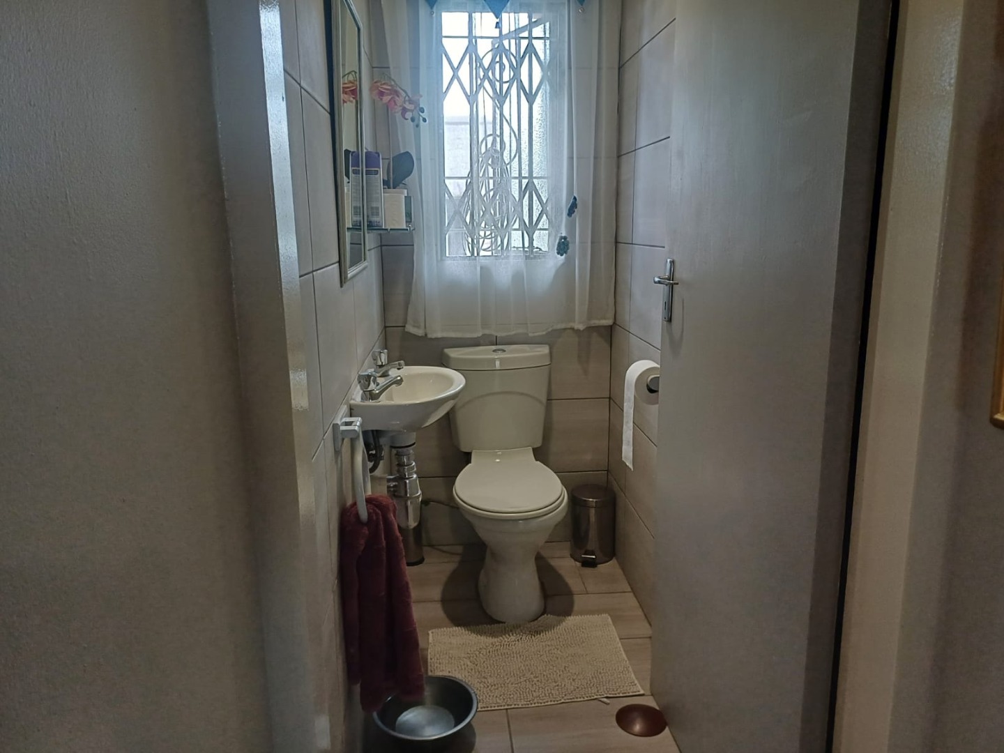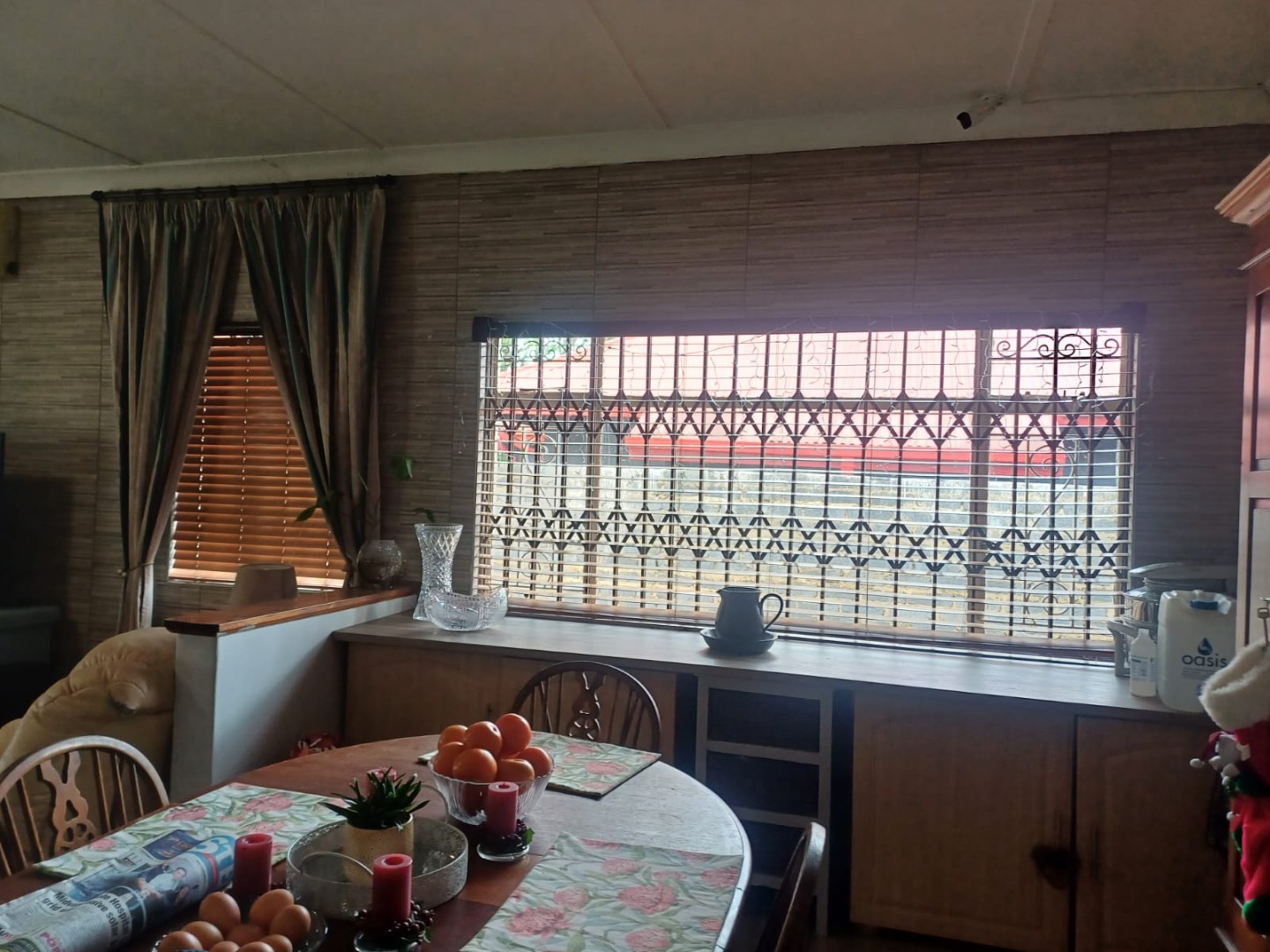 Inside, the home offers a functional layout with combined living and dining areas, benefiting from ample natural light and equipped with air conditioning for comfort. The kitchen is practical, featuring a built-in gas hob, oven, double stainless steel sink, and generous cabinet storage. Tiled flooring and security bars on windows enhance both durability and safety throughout.