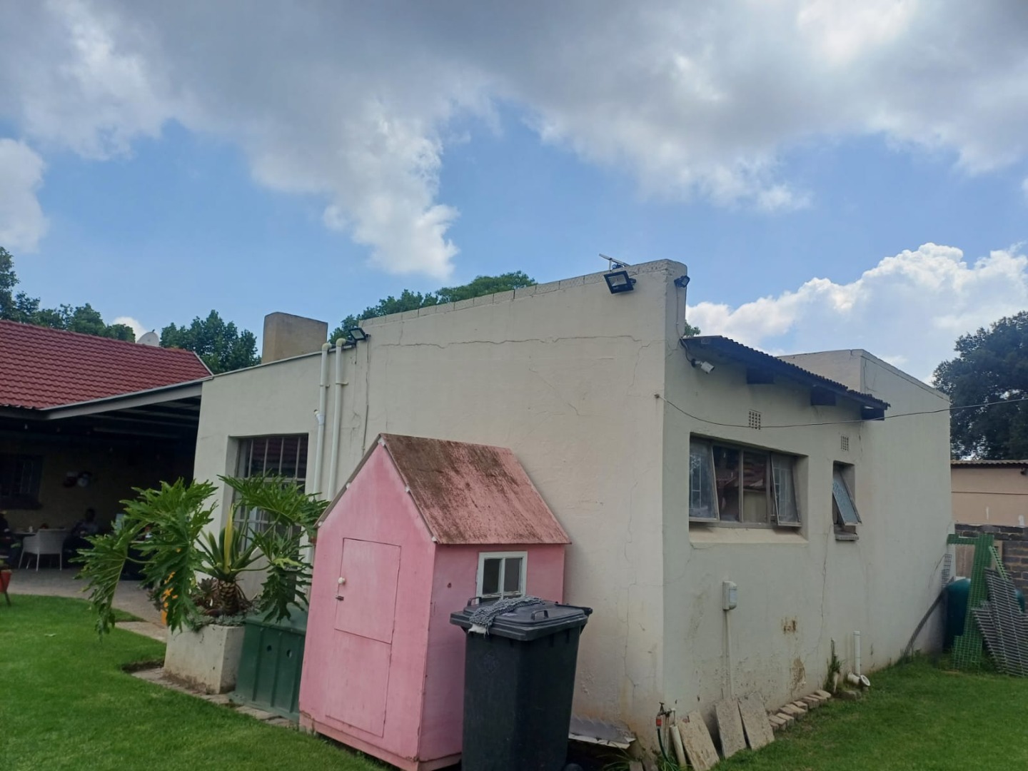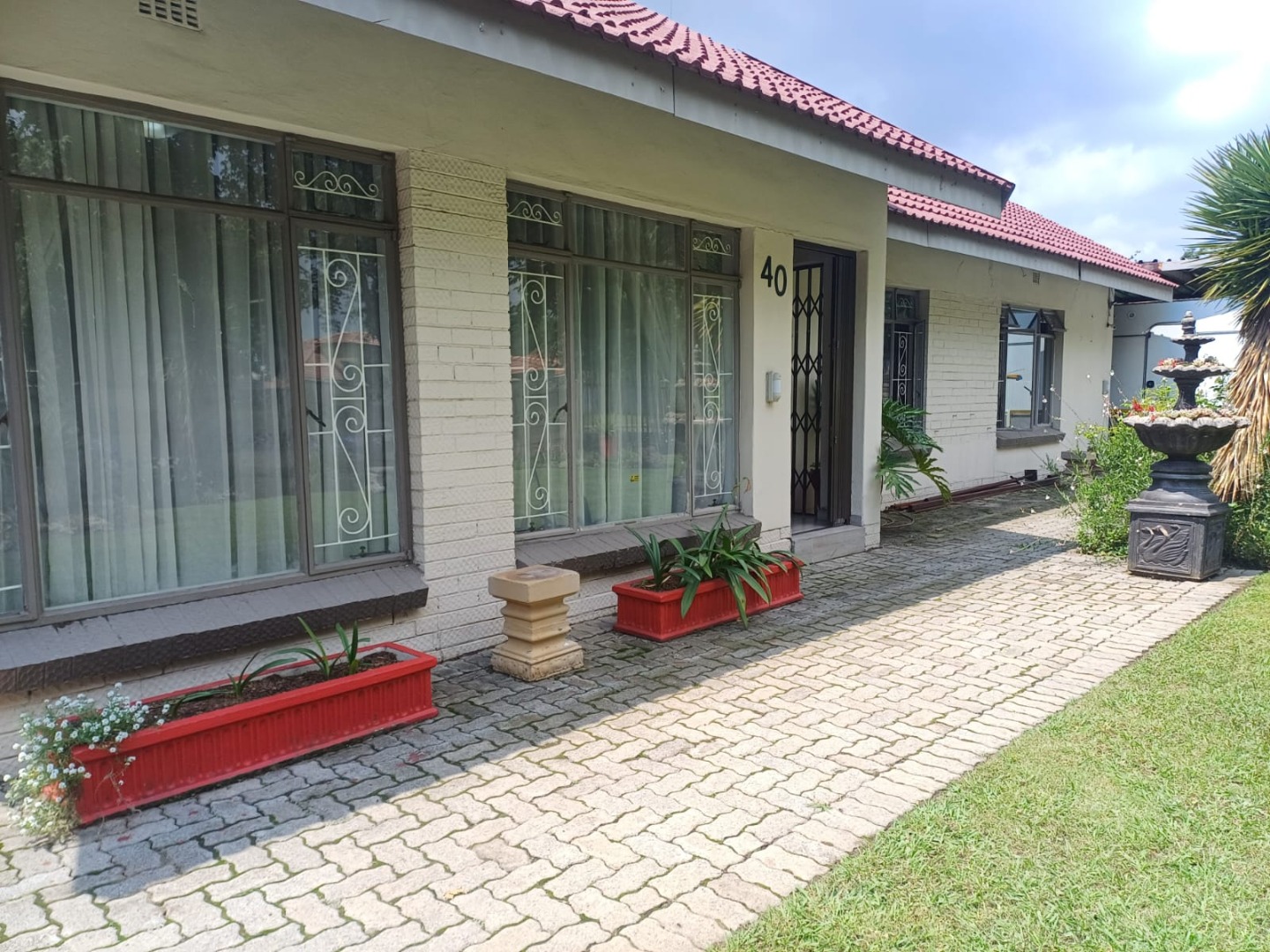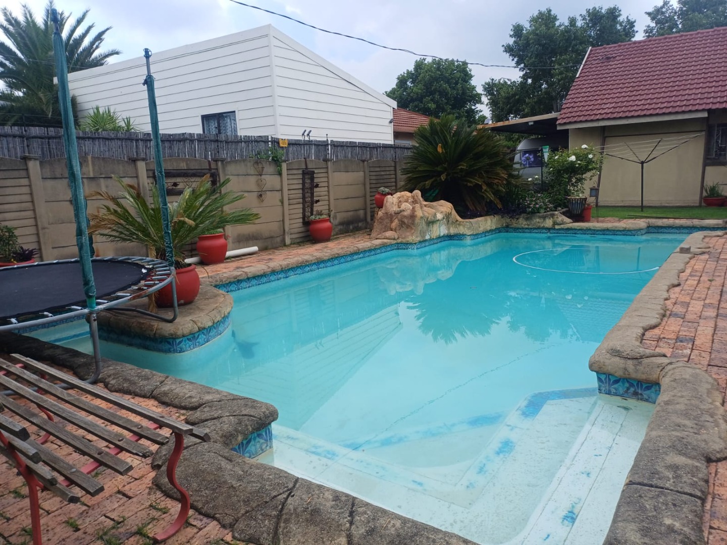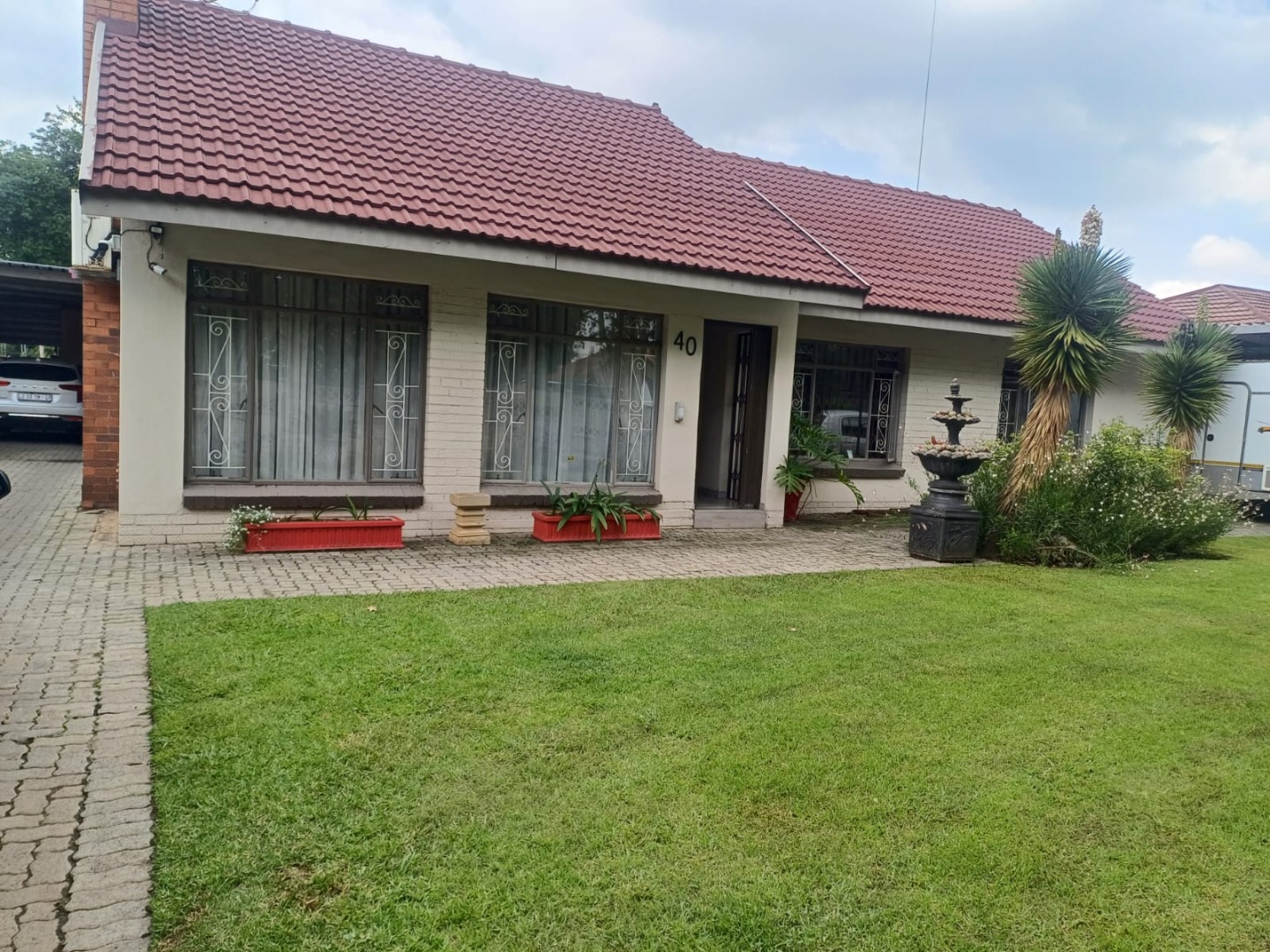 Discover this charming 3-bedroom, 1.5-bathroom residence nestled in the established suburb of Three Rivers, Vereeniging. The property immediately impresses with its well-maintained lawn, paved access, and a welcoming exterior featuring a red tiled roof . A convenient carport provides covered parking, complemented by a mature garden and a decorative fountain.