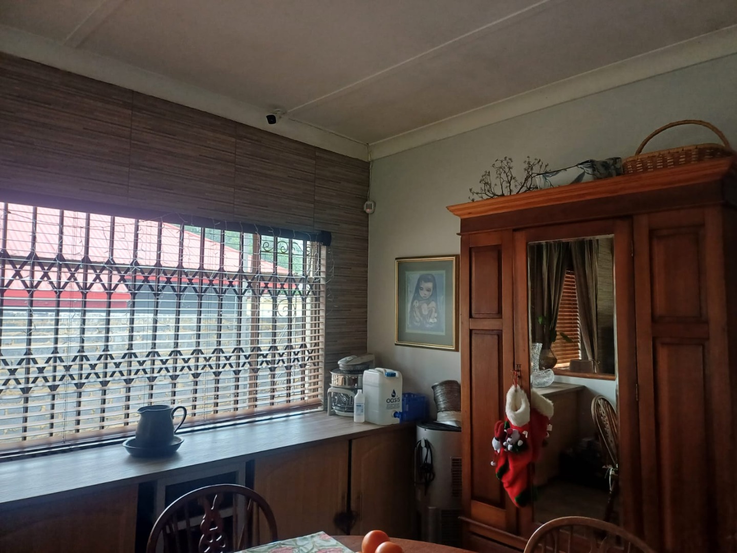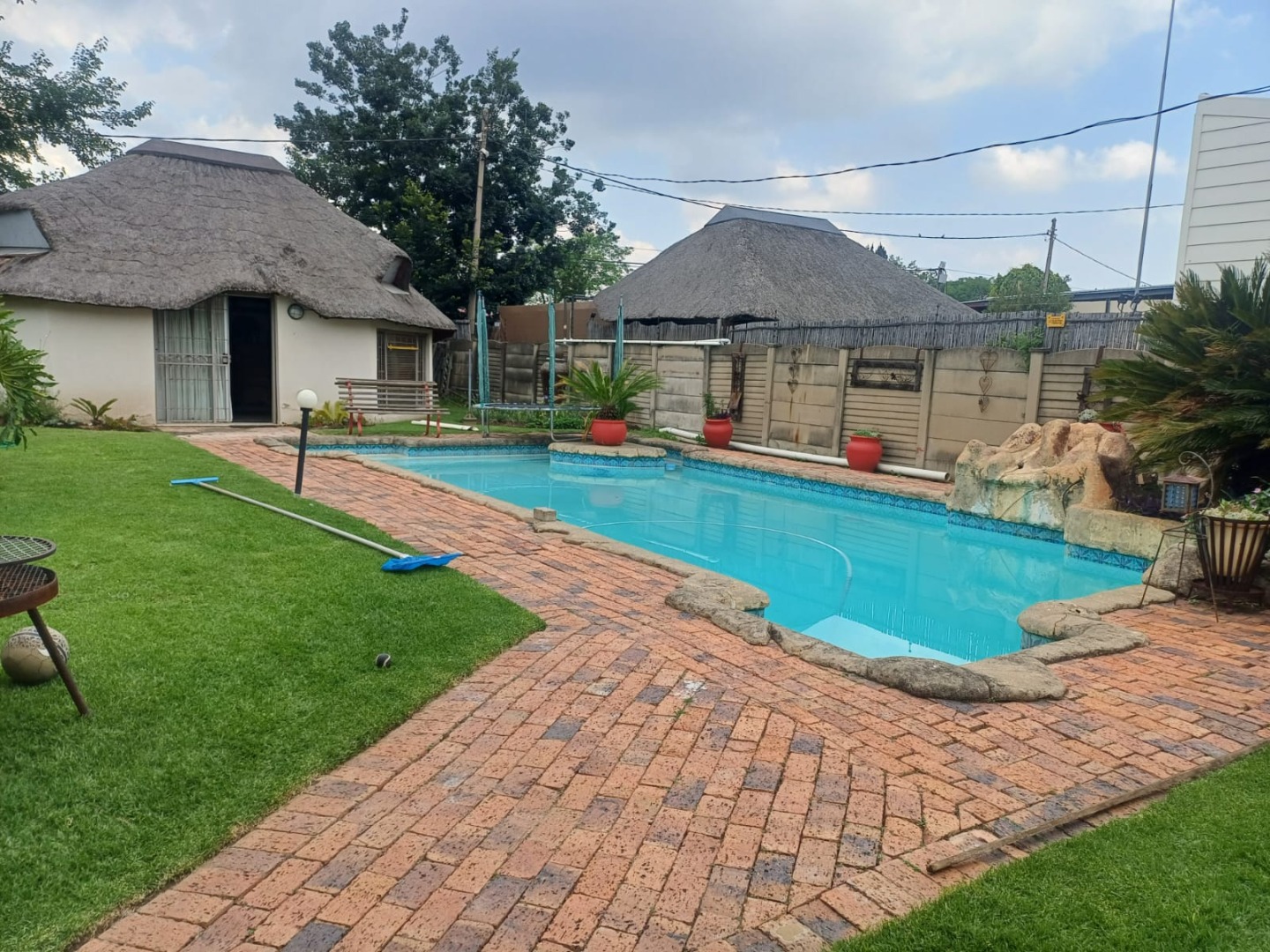 Outdoor living is well-catered for with a refreshing pool, a lapa, and a built-in braai, perfect for entertaining. The property also includes a single garage and four additional parking spaces. Enhanced security features such as burglar bars, an alarm system, and an access gate provide peace of mind. Additional amenities include a laundry area, storage, and domestic rooms with outside toilets.