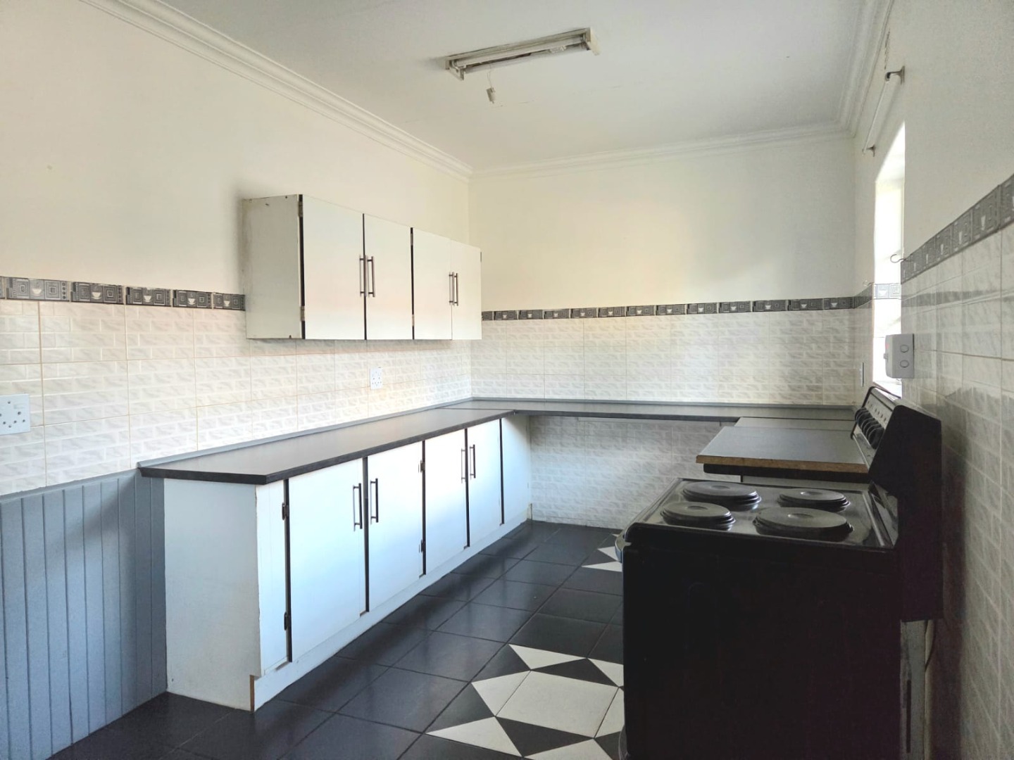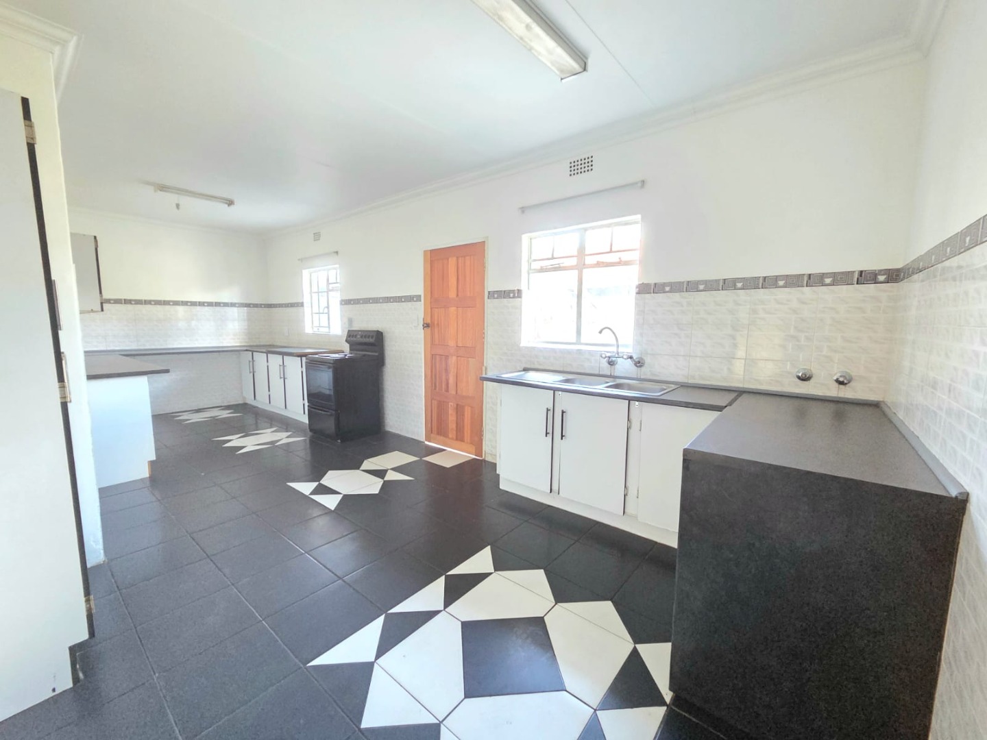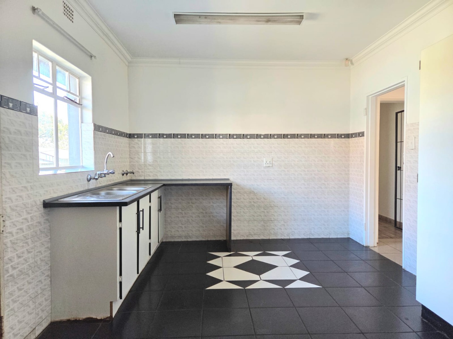 This inviting 3-bedroom, 2-bathroom home in Vaalpark offers a comfortable living experience. The interior features a spacious lounge and a dedicated dining room, both benefiting from an open-plan design that enhances the sense of space and natural light. Throughout the home, you'll find clean, light-colored tiled flooring and freshly painted white walls, providing a versatile canvas for your personal style. The functional kitchen, though featuring a dated aesthetic, provides ample counter and cabinet storage, a double sink, and space for a freestanding stove.