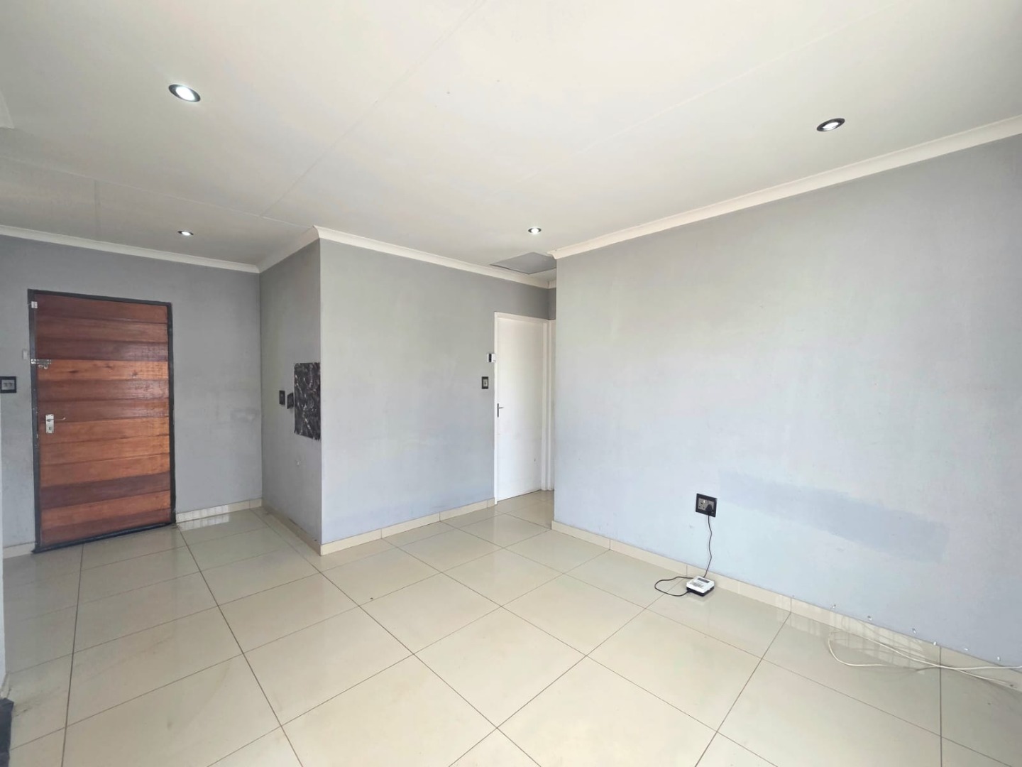 Step inside to a well-appointed interior designed for comfortable living. The property boasts modern tiled flooring throughout, neutral grey walls, and elegant crown molding, creating a versatile canvas for your personal style. Recessed lighting in the lounge and other areas ensures a bright and welcoming ambiance. The layout includes an open-plan living area, and a functional kitchen equipped with a sink unit and storage, ready for your culinary endeavors.