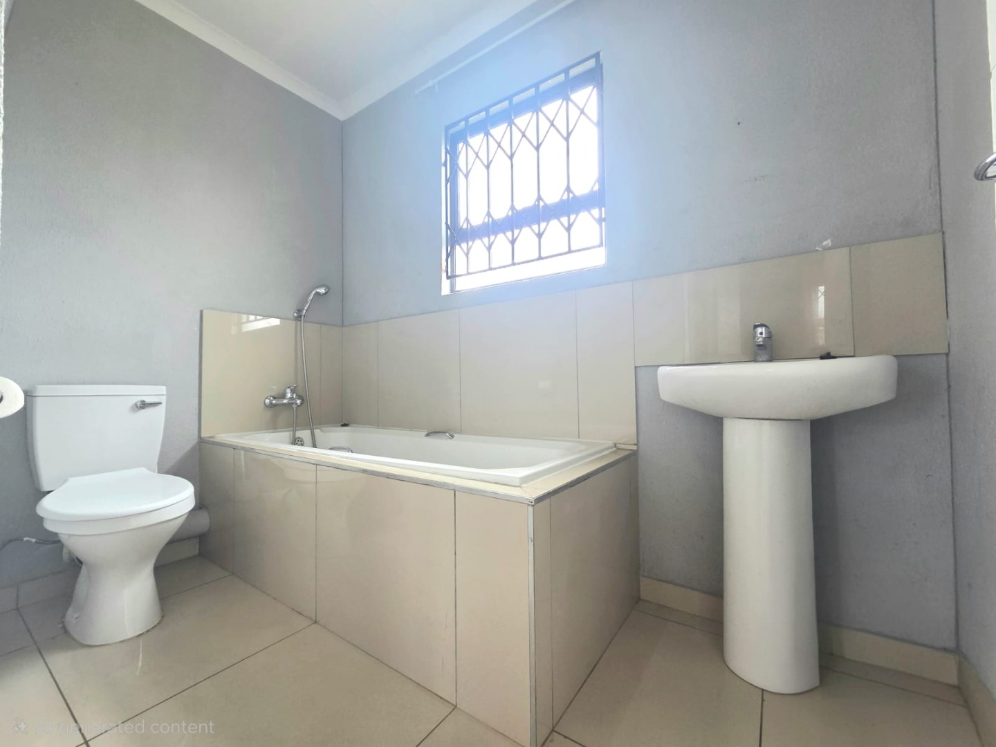 This home offers two comfortable bedrooms, each featuring tiled floors and ample natural light. The single bathroom is fitted with a bathtub, toilet, and pedestal sink, providing essential amenities. Security is a key feature, with an alarm system, security bars on all windows, and a robust security gate, ensuring peace of mind for residents.