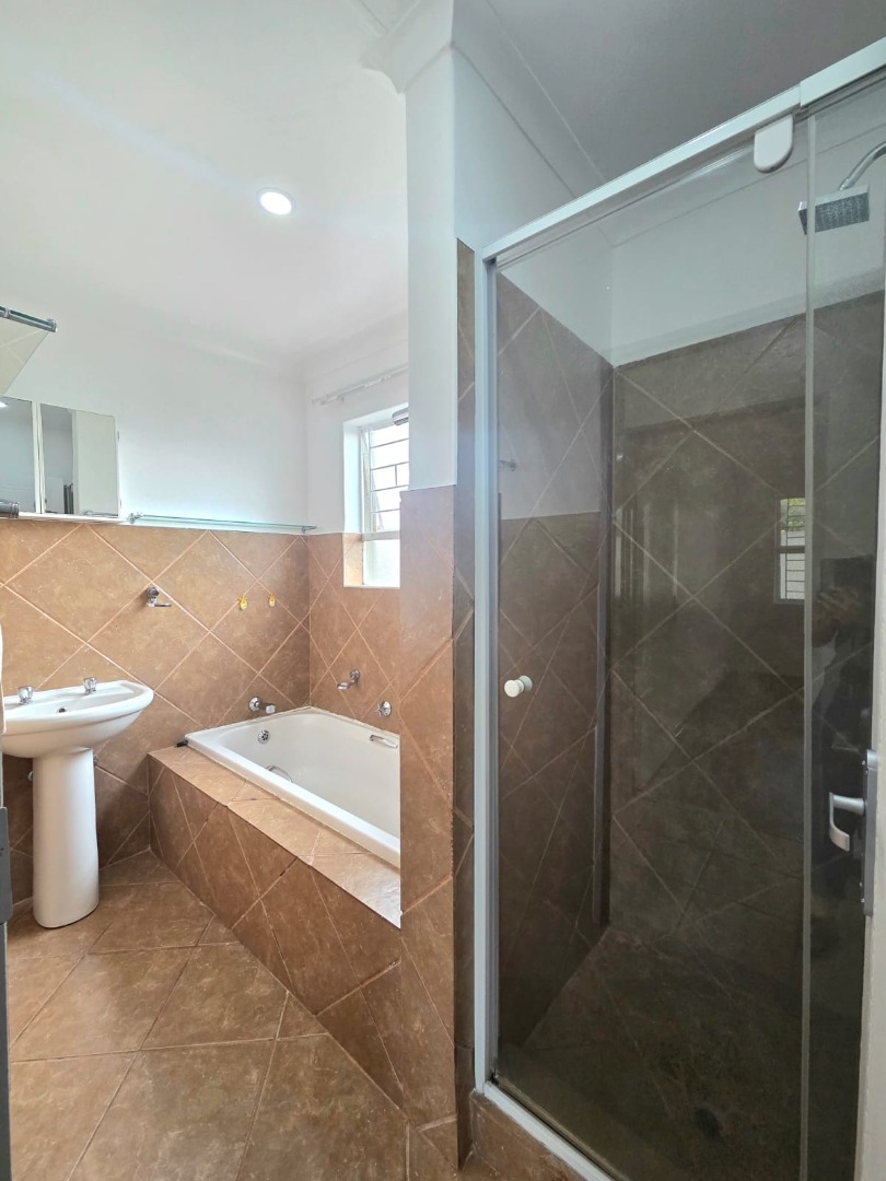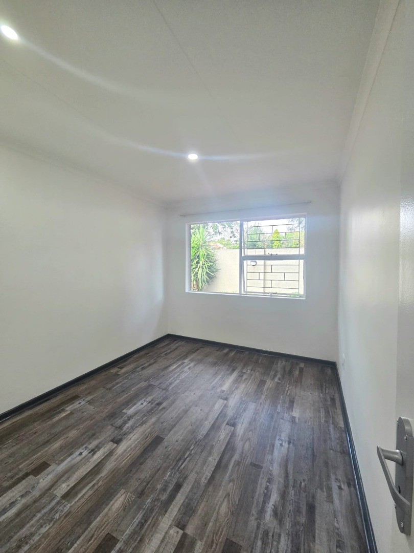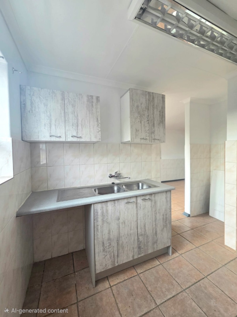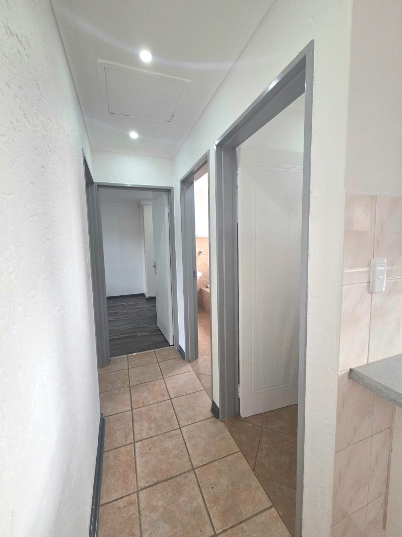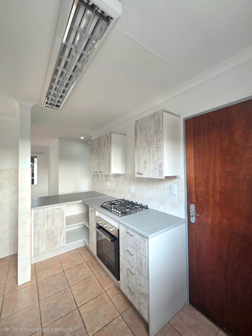 This inviting 2-bedroom, 1.5-bathroom rental property offers comfortable living. The interior features an open-plan layout, seamlessly connecting the lounge and kitchen areas, ideal for modern living. The kitchen is equipped with an integrated gas hob and built-in oven, complemented by L-shaped countertops and ample cabinet storage. Tiled flooring extends throughout the living spaces, enhanced by recessed lighting and bright, textured walls, creating a welcoming atmosphere.