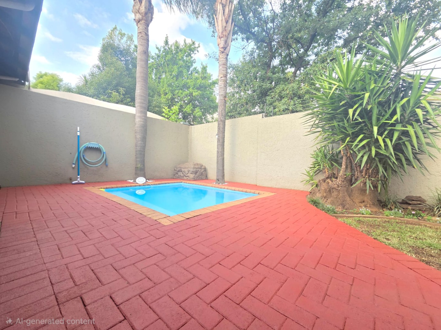 Step outside to a private outdoor oasis, complete with a compact swimming pool, perfect for cooling off on warm days. The area boasts distinctive red brick paving, a small garden, and mature trees providing shade and greenery, all enclosed by high boundary walls for privacy. An attached single garage and paved driveway offer convenient parking. This pet-friendly residence is well-suited for individuals or small families seeking a secure and manageable home.