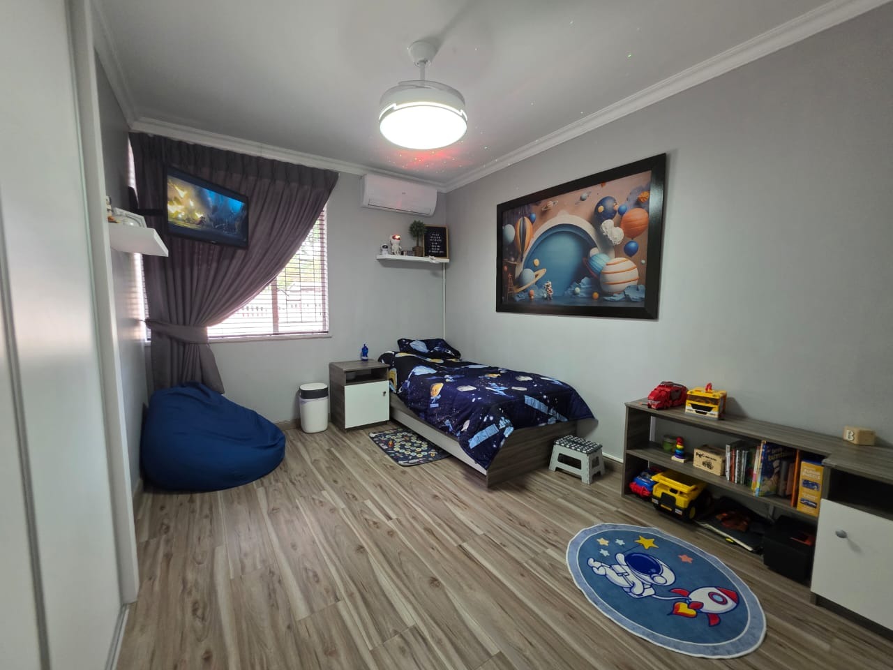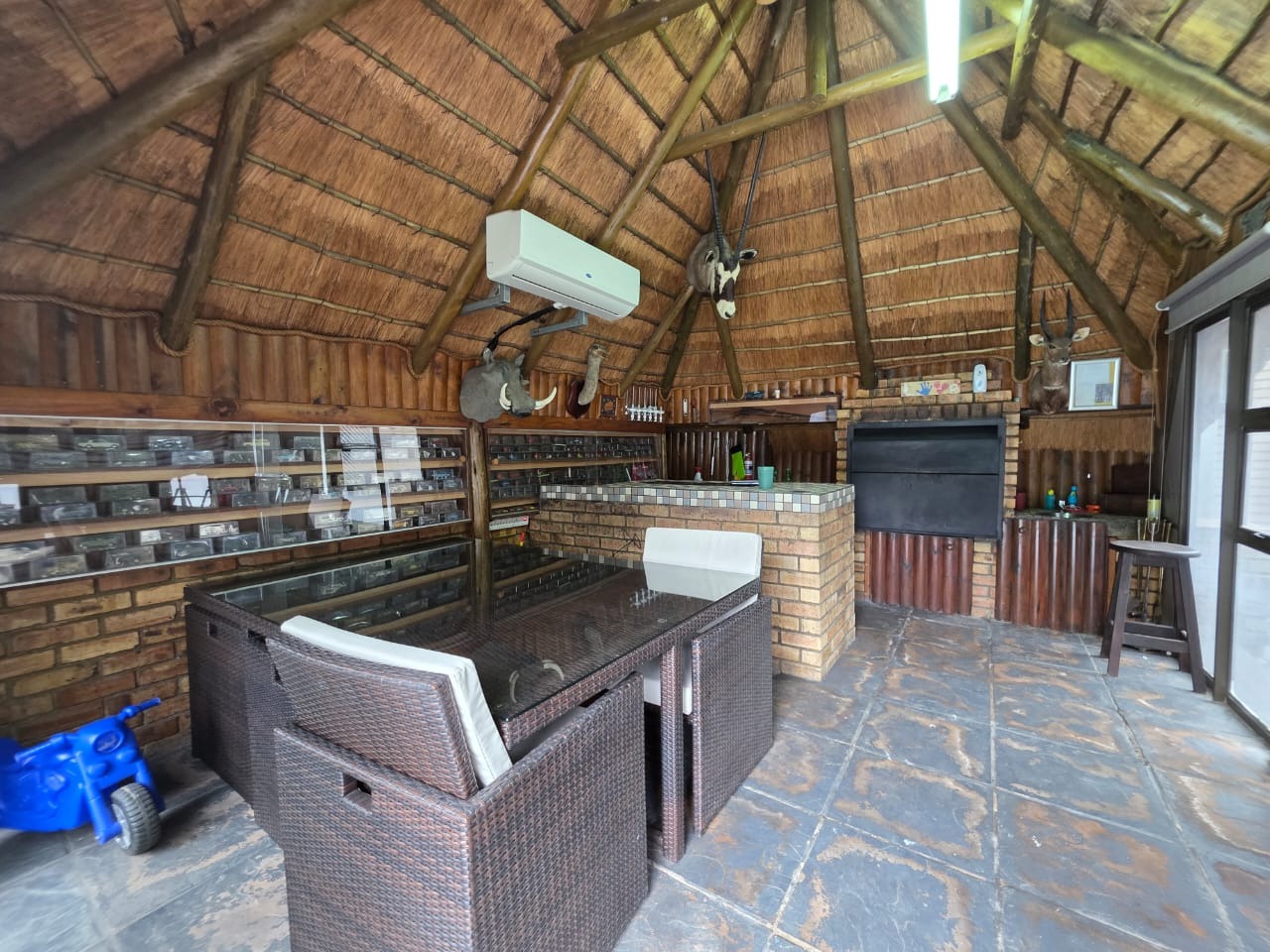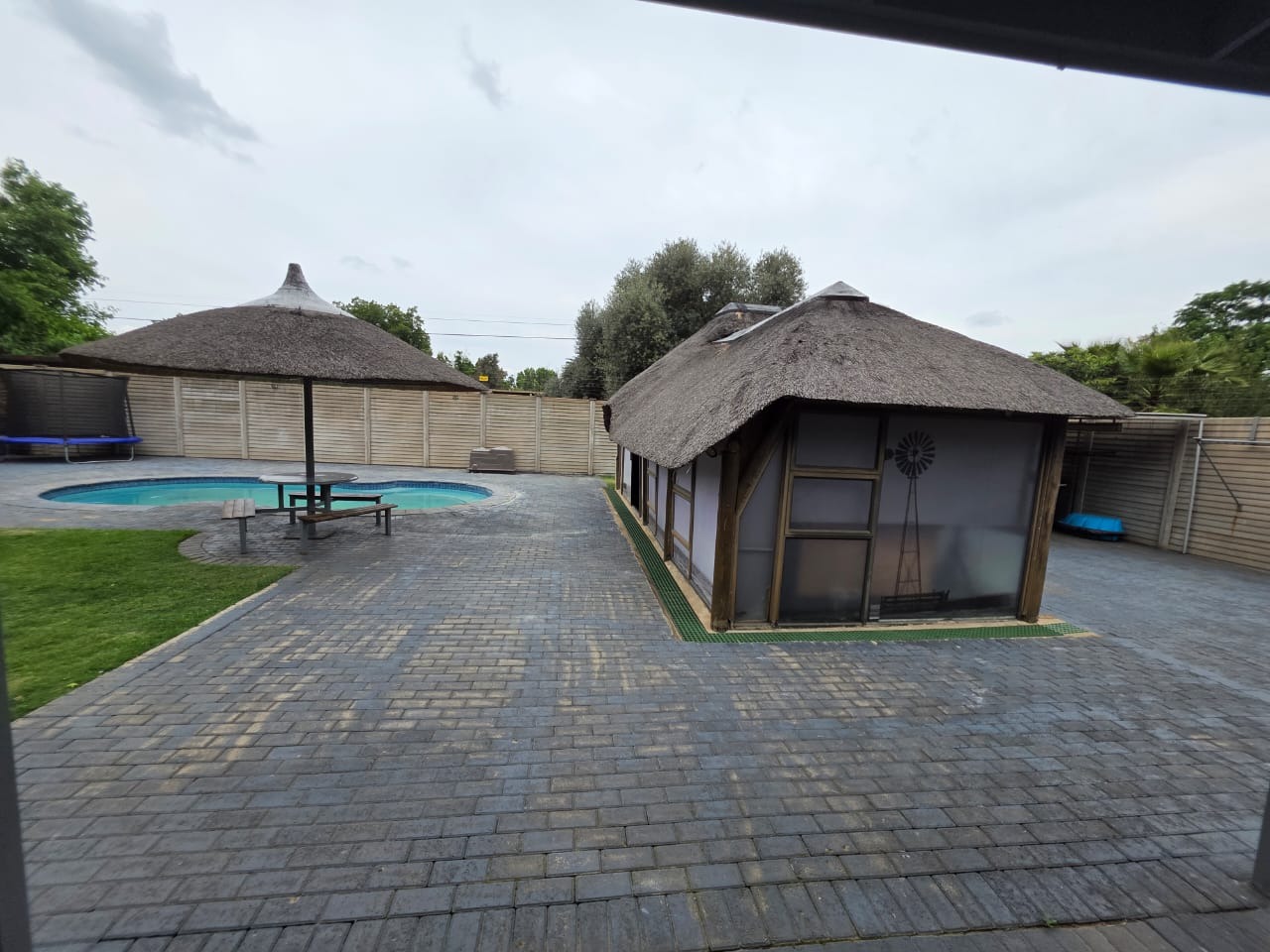 Outdoor living is a highlight, featuring a private swimming pool and extensive paved areas perfect for relaxation and entertaining. A unique thatched-roof lapa, complete with a built-in braai, counter space, and air conditioning, offers a versatile space for outdoor dining and leisure, enclosed with blinds for privacy. The property also includes two storage sheds (Wendy houses), water tanks, and a trampoline, all within a privacy-fenced perimeter. Pets are allowed, making it a perfect environment for animal lovers.