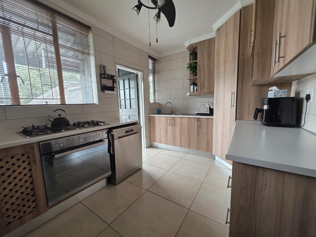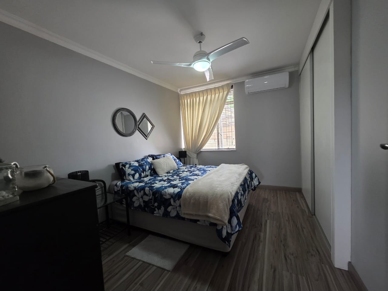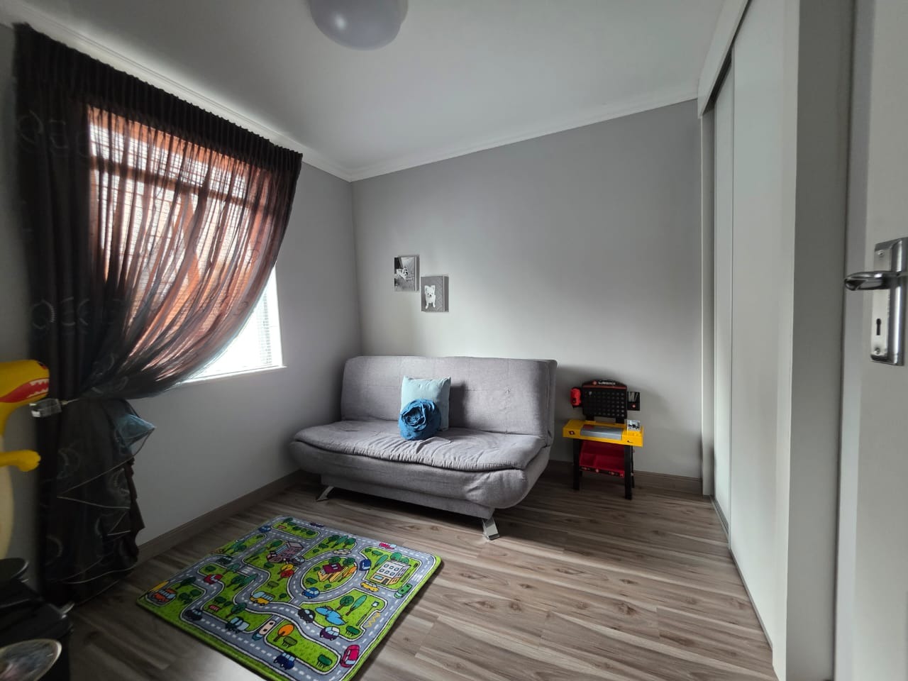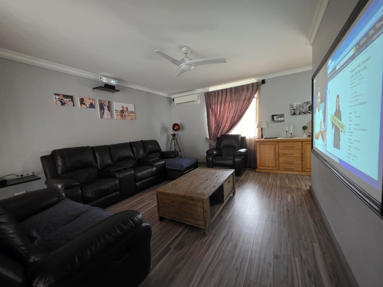 Outdoor living is a highlight, featuring a private swimming pool and extensive paved areas perfect for relaxation and entertaining. A unique thatched-roof lapa, complete with a built-in braai, counter space, and air conditioning, offers a versatile space for outdoor dining and leisure, enclosed with blinds for privacy. The property also includes two storage sheds (Wendy houses), water tanks, and a trampoline, all within a privacy-fenced perimeter. Pets are allowed, making it a perfect environment for animal lovers.