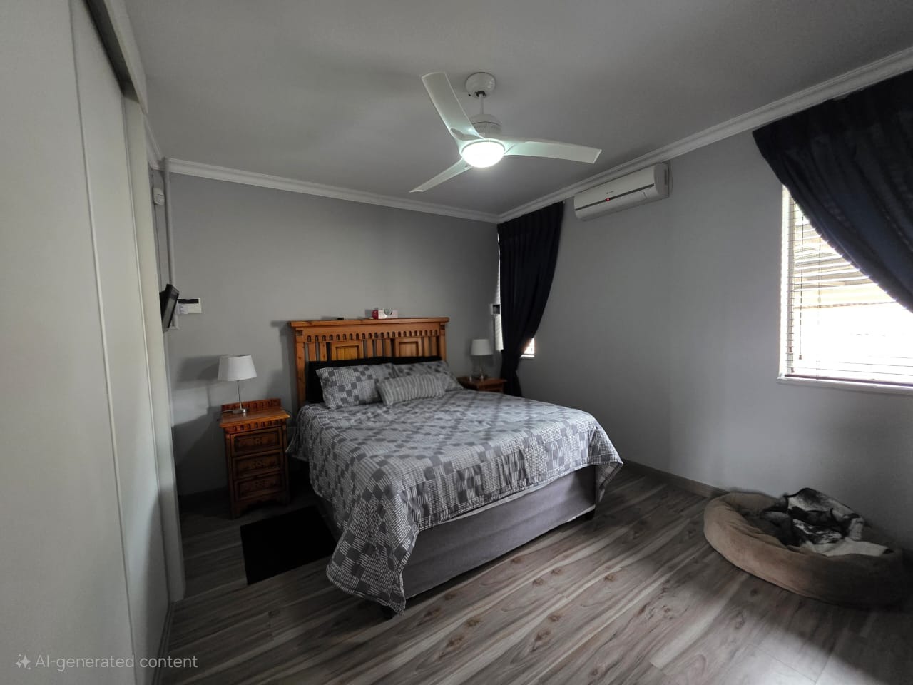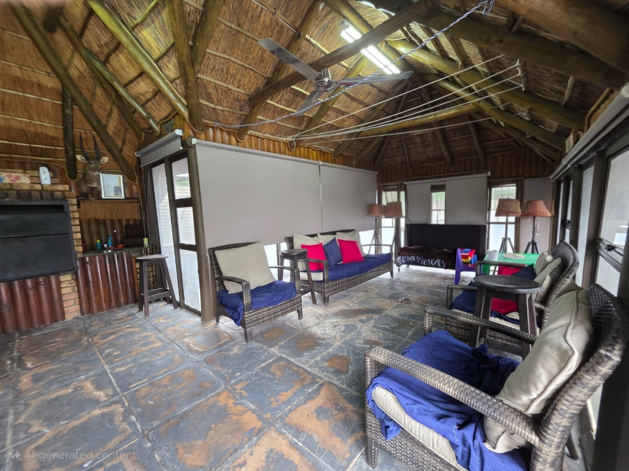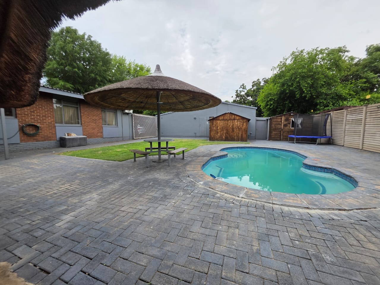 Outdoor living is a highlight, featuring a private swimming pool and extensive paved areas perfect for relaxation and entertaining. A unique thatched-roof lapa, complete with a built-in braai, counter space, and air conditioning, offers a versatile space for outdoor dining and leisure, enclosed with blinds for privacy. The property also includes two storage sheds (Wendy houses), water tanks, and a trampoline, all within a privacy-fenced perimeter. Pets are allowed, making it a perfect environment for animal lovers.