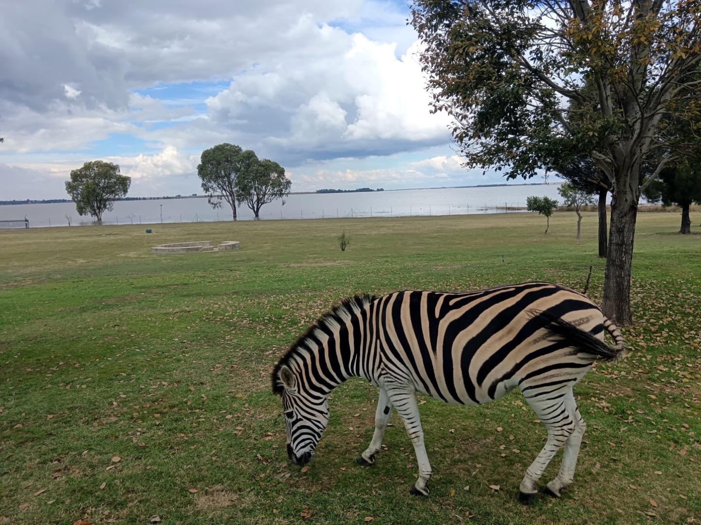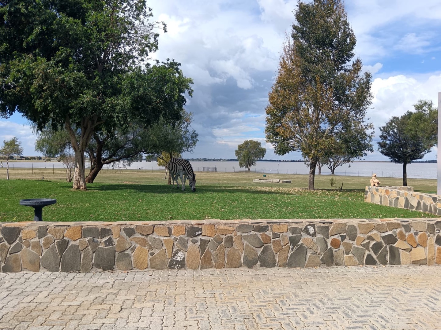 Outdoor living is a highlight, with a spacious paved patio area overlooking a sprawling green lawn and offering breathtaking views of the dam. This area is perfect for entertaining, complete with a rustic concrete fire pit and built-in seating. The property's expansive grounds are home to mature trees and even feature unique wildlife, such as grazing zebras, enhancing the lifestyle farm experience. Security is thoughtfully integrated with security gates on the large sliding doors and security bars on windows, providing peace of mind within this serene estate.