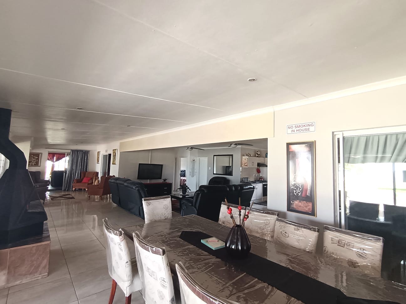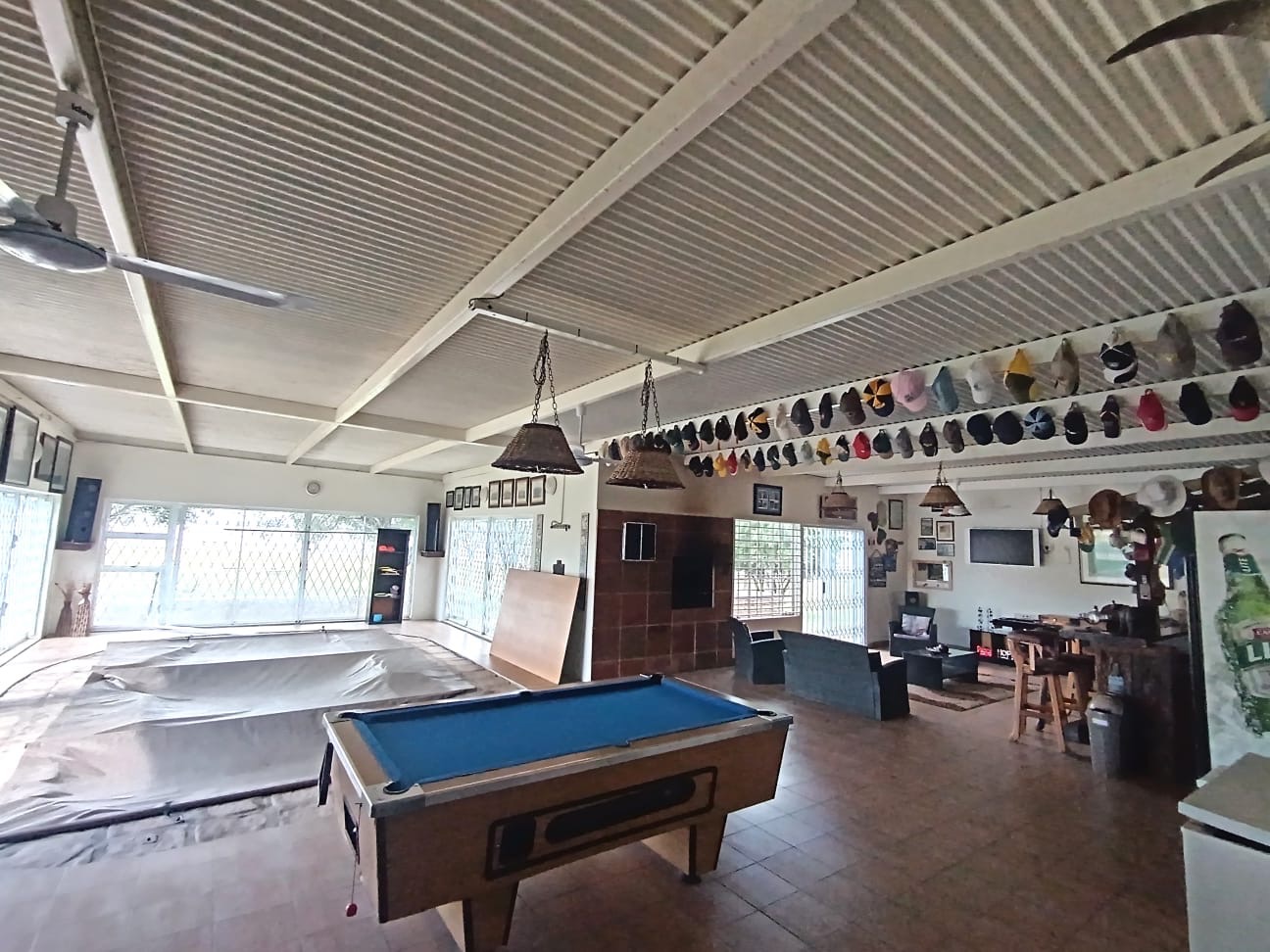 Outdoor living is a highlight, with a spacious paved patio area overlooking a sprawling green lawn and offering breathtaking views of the dam. This area is perfect for entertaining, complete with a rustic concrete fire pit and built-in seating. The property's expansive grounds are home to mature trees and even feature unique wildlife, such as grazing zebras, enhancing the lifestyle farm experience. Security is thoughtfully integrated with security gates on the large sliding doors and security bars on windows, providing peace of mind within this serene estate.