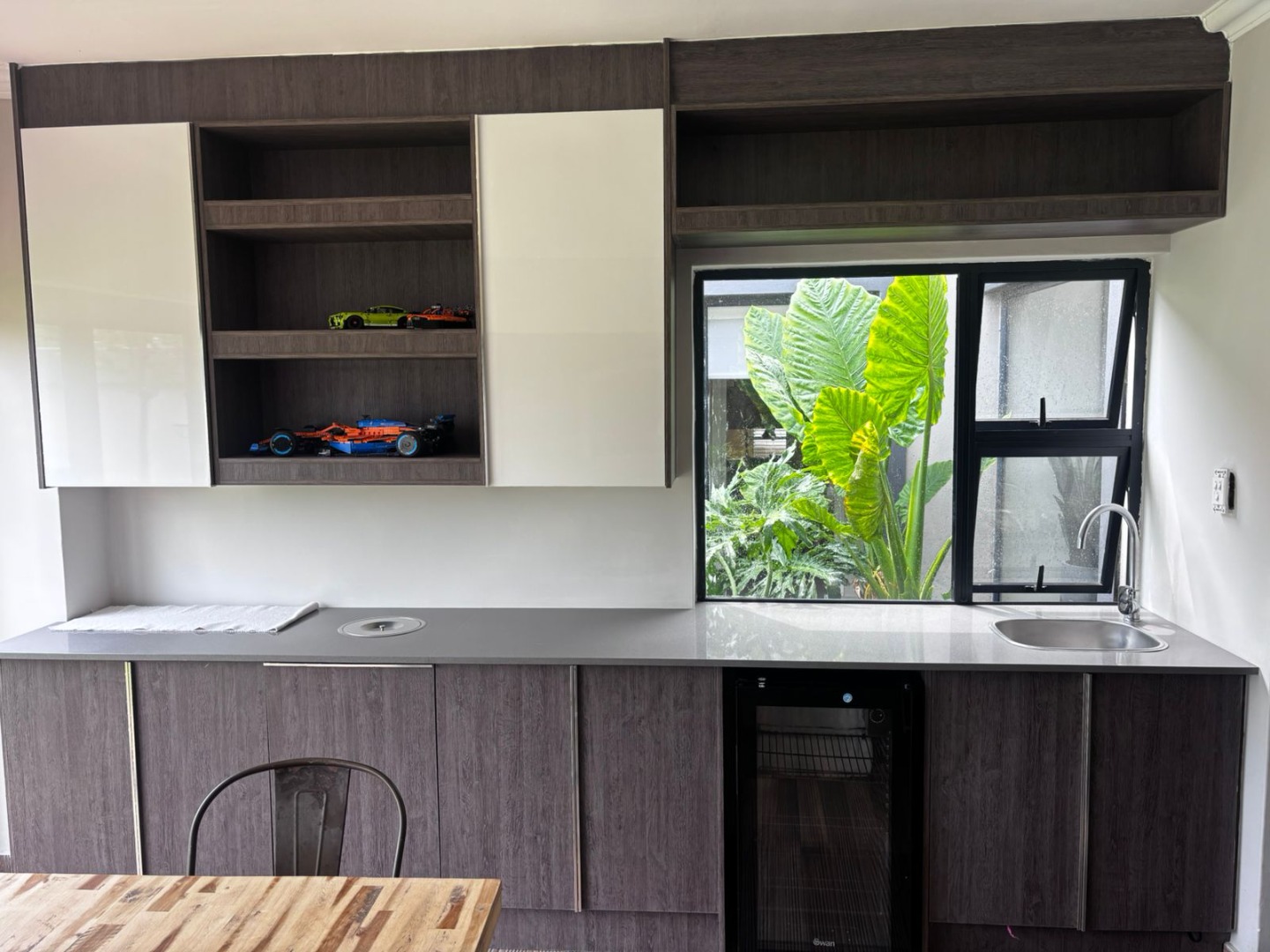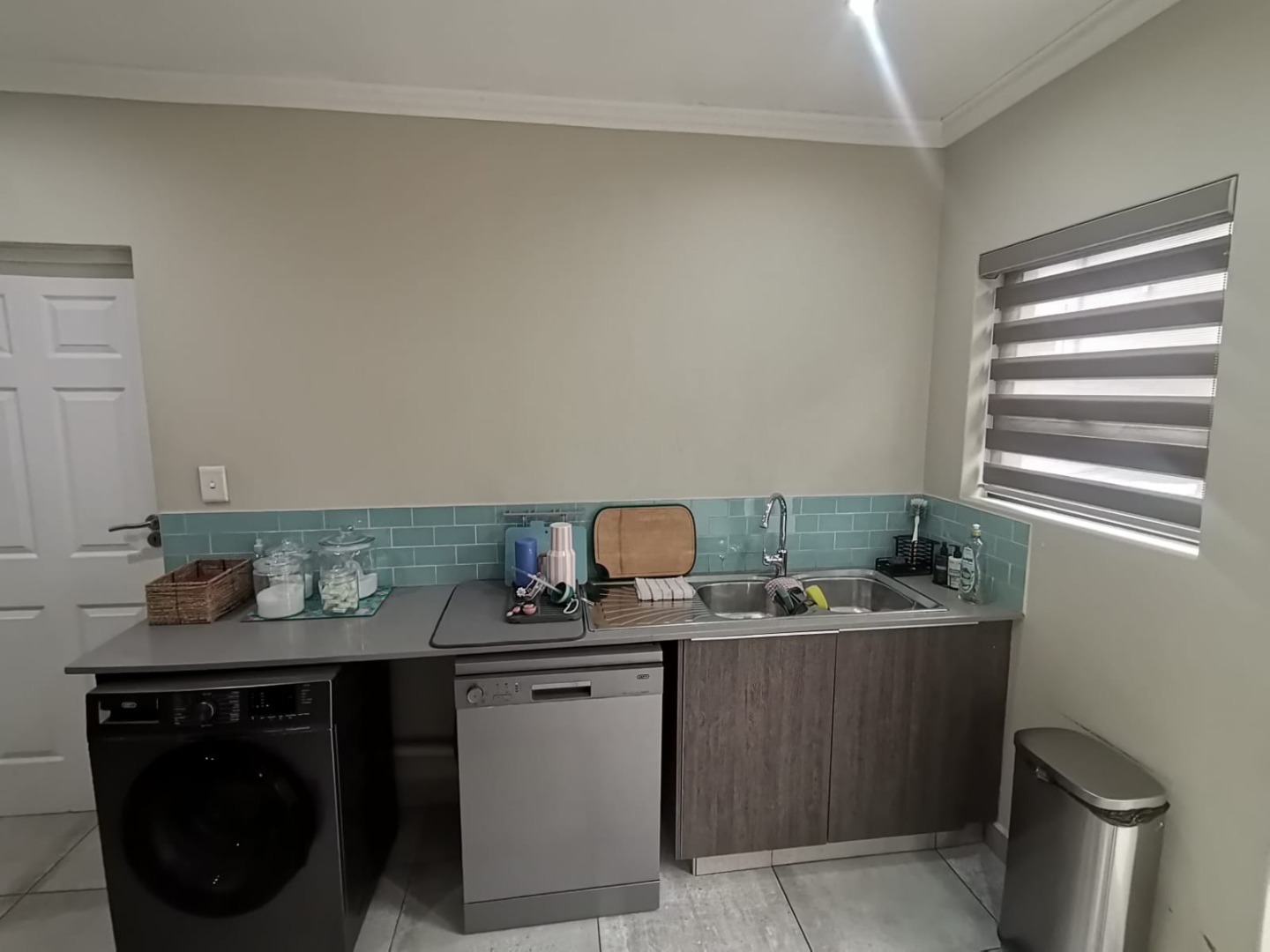 The heart of the home is a sleek, modern open-plan lounge, dining room, and kitchen, seamlessly blending living spaces. The kitchen boasts a premium gas stove, elegant Caesarstone countertops, and flows effortlessly into the living areas. A separate scullery and laundry provide practical functionality for everyday living.