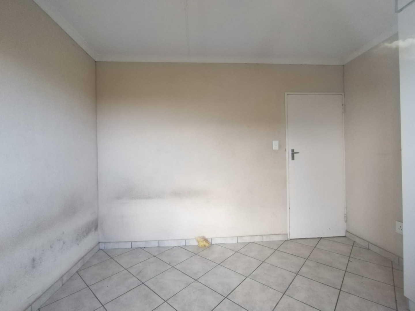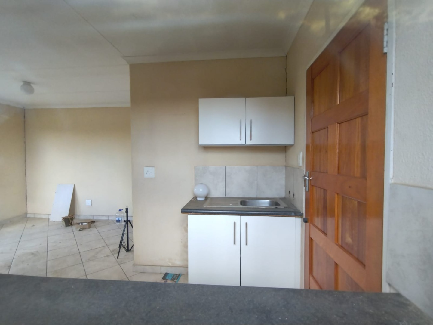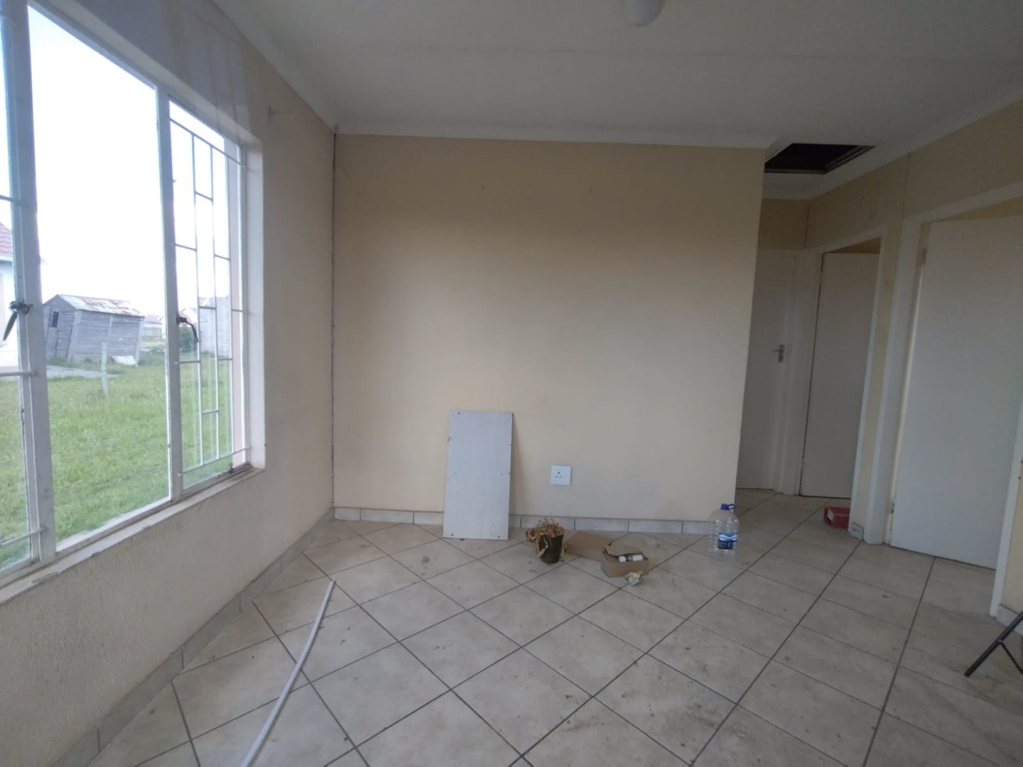 The interior of the main residence features two bedrooms and one bathroom, alongside a functional lounge area. The kitchen is equipped with modern white cabinets, a tiled backsplash, and a stainless steel sink, ready for your personal touch. Tiled flooring extends throughout the home, offering a practical and easy-to-maintain foundation. While the property requires cosmetic attention, including painting and addressing some damp areas, this presents an ideal canvas for buyers looking to modernise and add value.