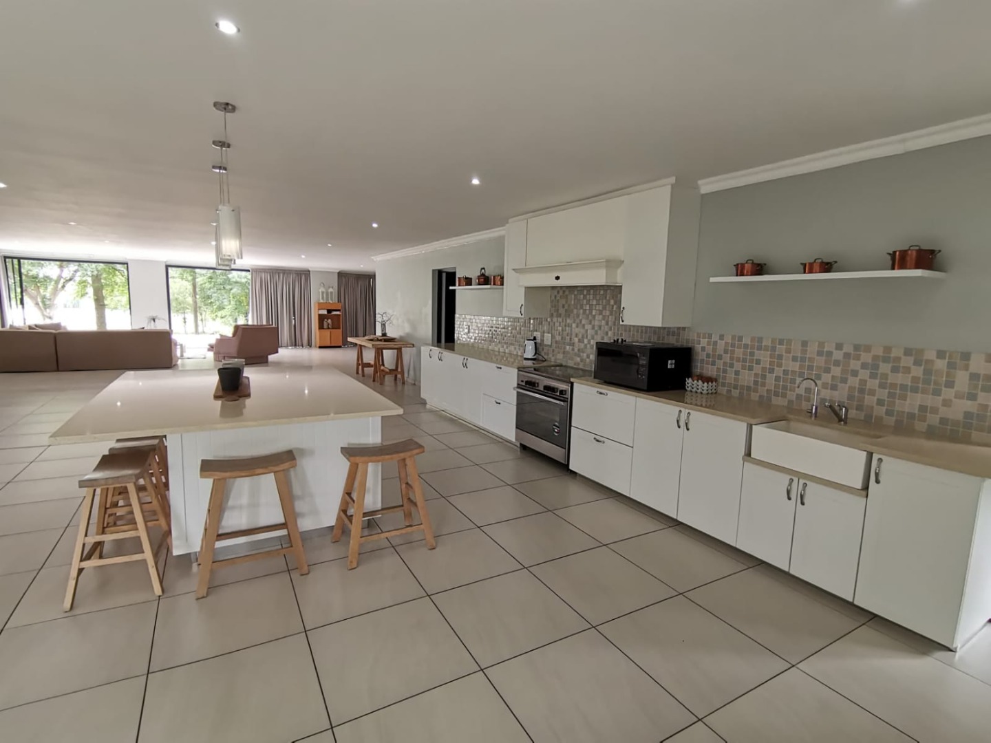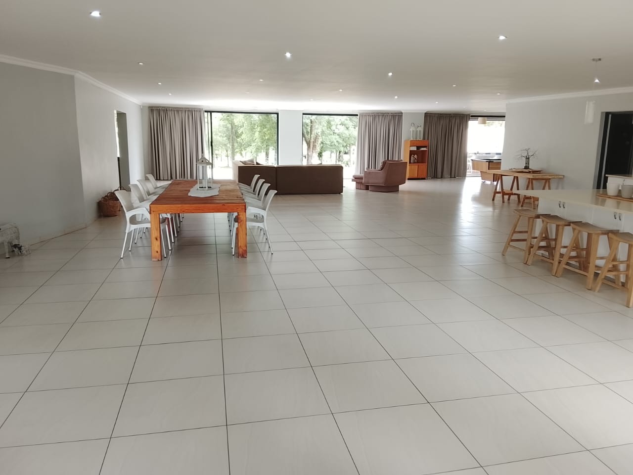 Across the 30m passage lies a second wing with three more bedrooms (one ensuite), a separate full bathroom, gas geysers, and its own open-plan Easylife kitchen, dining, and lounge area. High sliding doors open to a spacious veranda with views of the river.