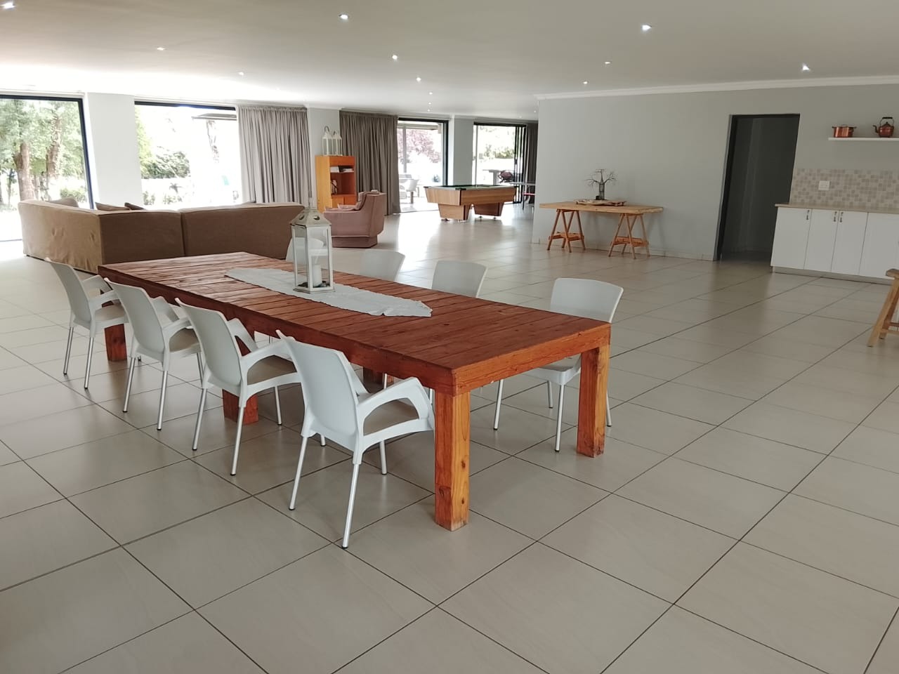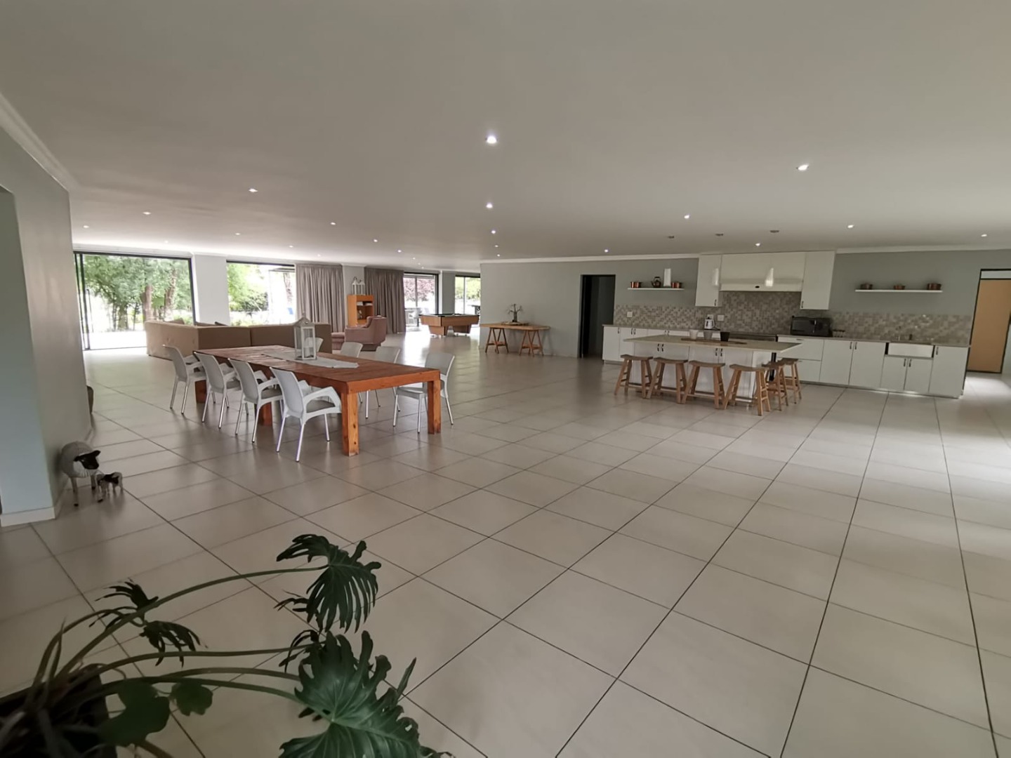 The expansive 1,220 m² home features an impressive open-plan design with seamless flow between the kitchen, dining area, lounge, bar, and entertainment spaces. Floor-to-ceiling windows and doors frame breathtaking views of the lush gardens, sparkling 7m x 14m swimming pool, boathouse, and the Vaal River beyond.