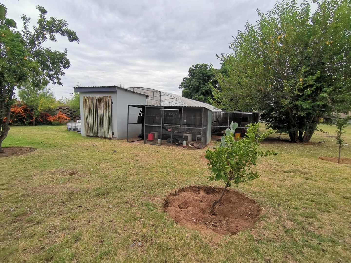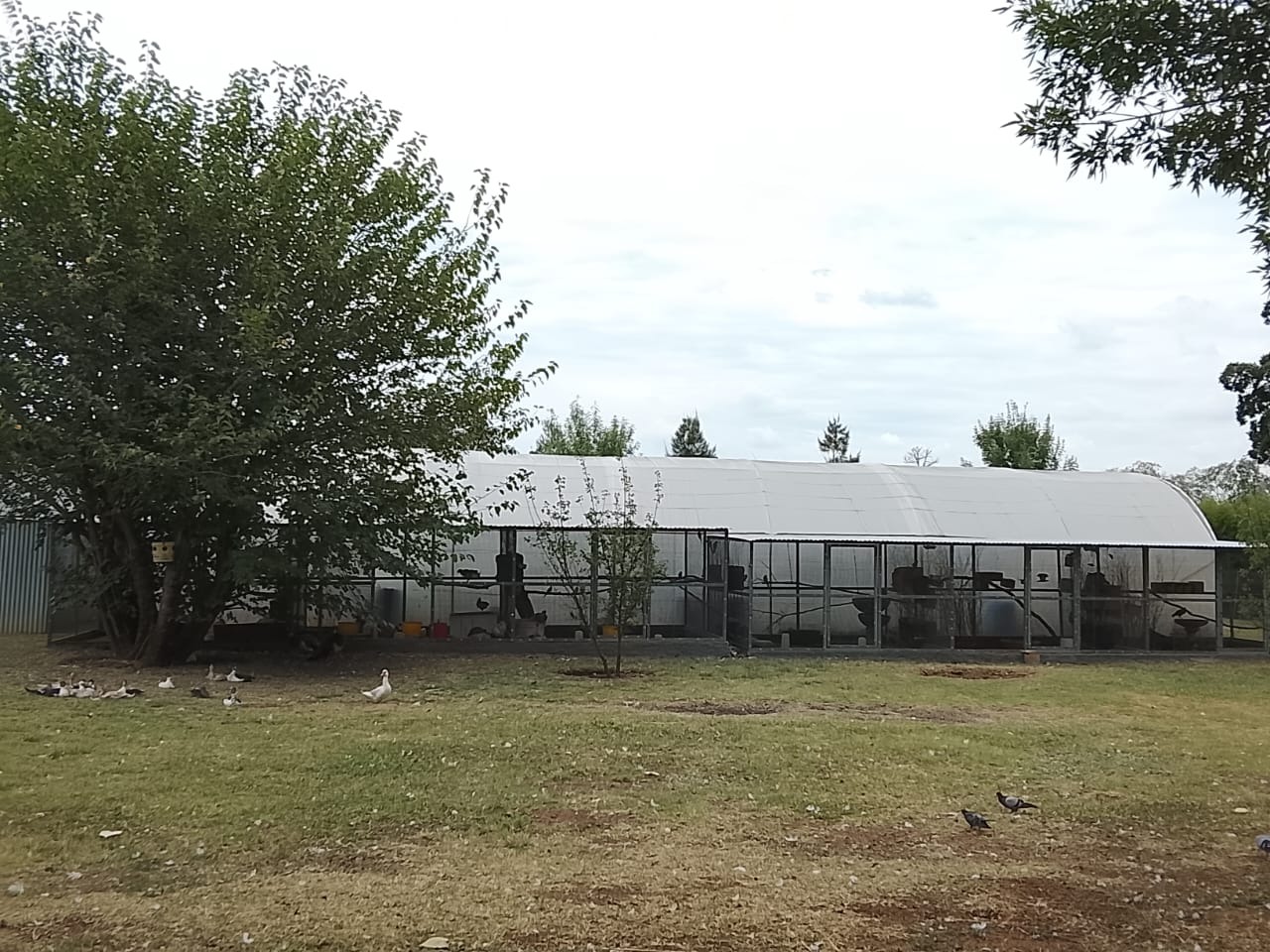 The property supports diverse farming: fish in tunnel containers/pond, 6 walk-in birdcages, small animal farm (rabbits, geese, ducks), and more.