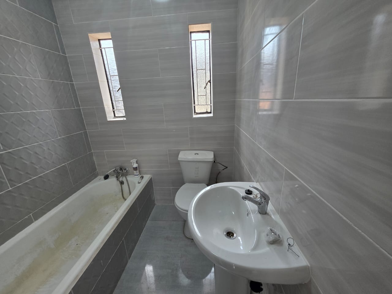 The residence comprises three well-proportioned bedrooms, each fitted with built-in wardrobes for practical storage solutions and finished with light-coloured tiled flooring. The property includes 1.5 bathrooms; a main bathroom featuring modern grey tiling on both walls and floor, complete with a bathtub, toilet, and pedestal sink, and a separate guest toilet with contemporary tiling. Natural light floods the rooms through large windows, many of which are fitted with security bars for enhanced peace of mind.